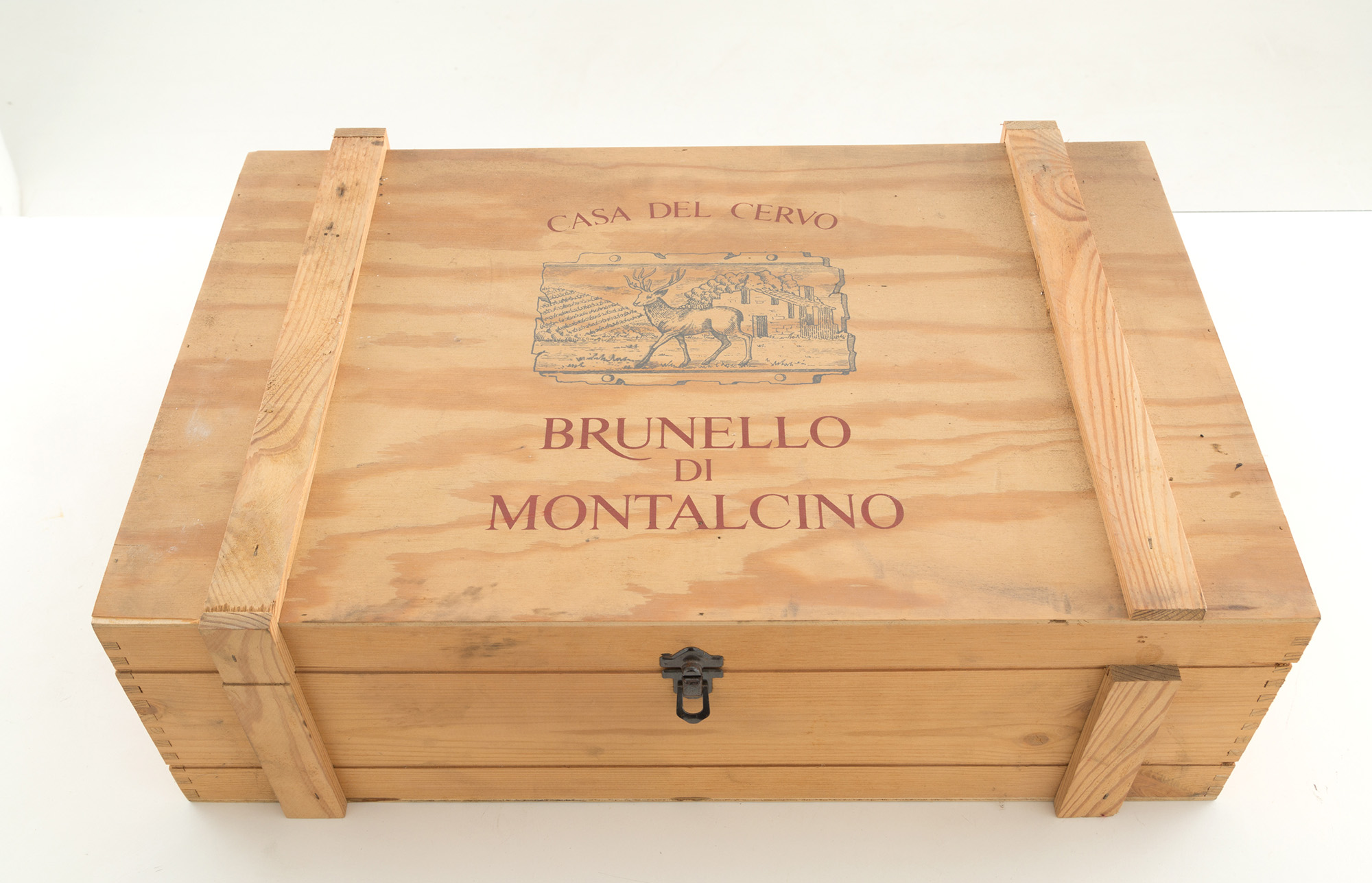Cofanetto in legno Casa del Cervo contenente: - Brunello di Montalcino 1977 (2 bt) - Grappa di Brunello (1 bt) - Brandy di Brunello (1 bt) - confezione di miele di acacia - piatto in maiolica finemente decorato a mano. Manifattura DERUTA
