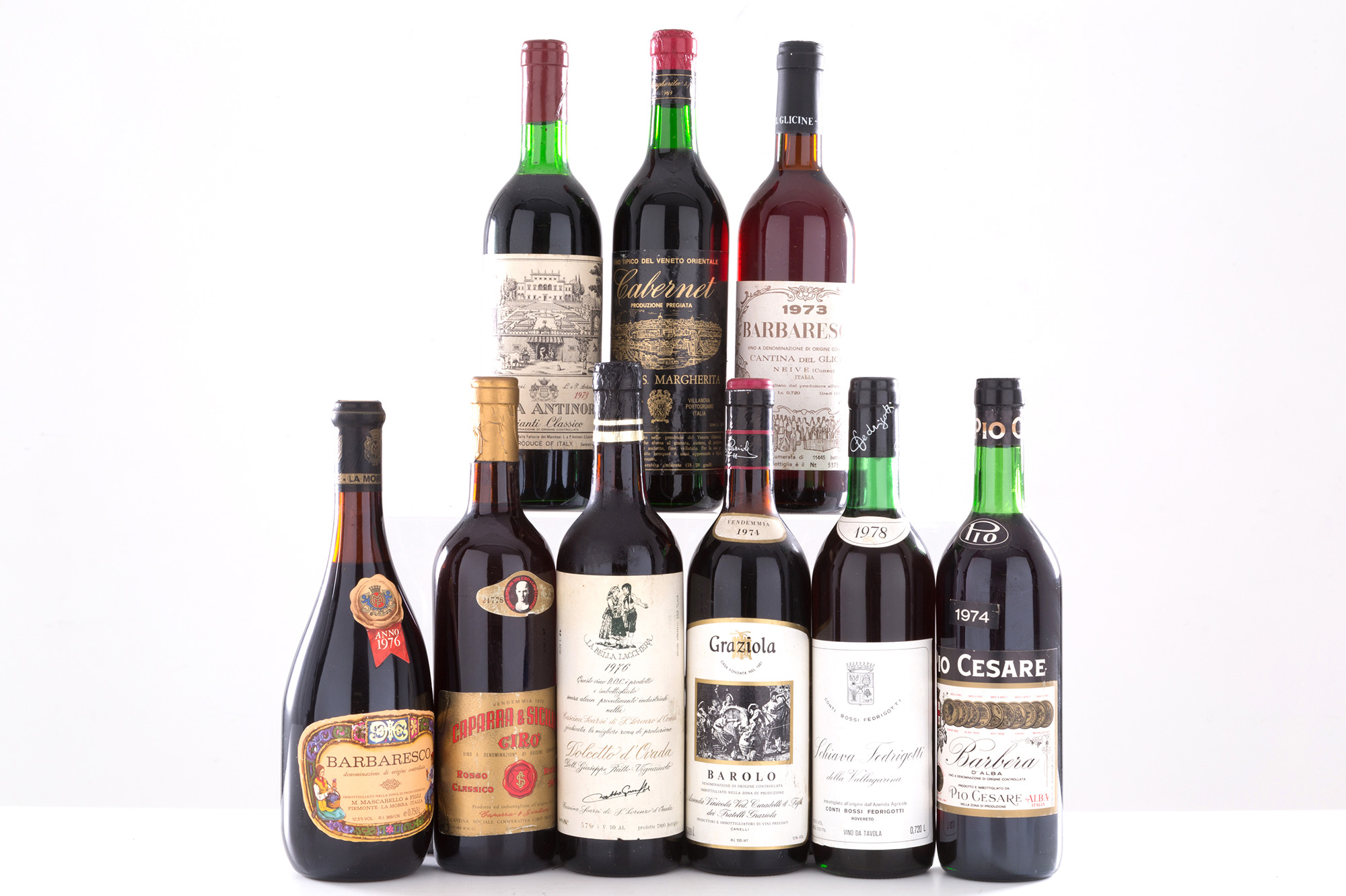 Selezione di rossi (9 bt). - Barbaresco La Morra 1976 (1 bt) - Cirò Caparra & Siciliani 1970 (1 bt) - Dolcetto d'Ovada 'La Bella Lacchera', Cascina Scarsi di San Lorenzo d'Ovada 1976 (1 bt) - Barolo Fratelli Graziola 1974 (1 bt) - Schiava Fedrigotti della Vallagarina 1978 (1 bt) - Barbera Pio Cesare 1974 (1 bt) - Villa Antinori Chianti Classico 1973 (1 bt) - Cabernet Santa Margherita 1969 (1 bt) - Barbaresco Cantina del Glicine 1973 (1 bt)