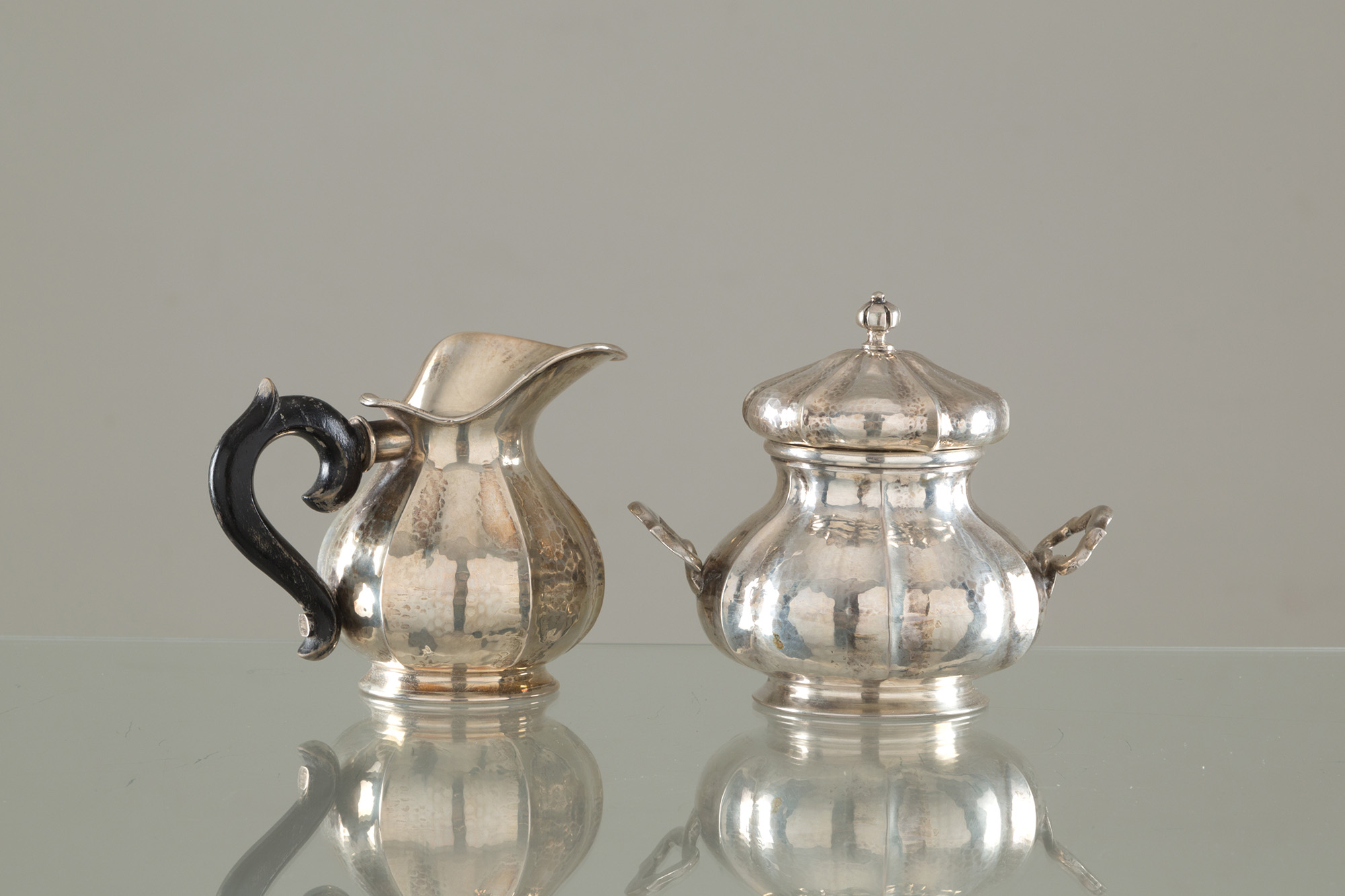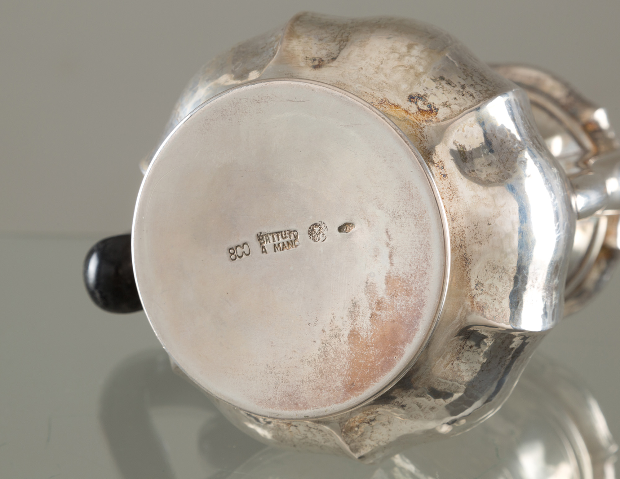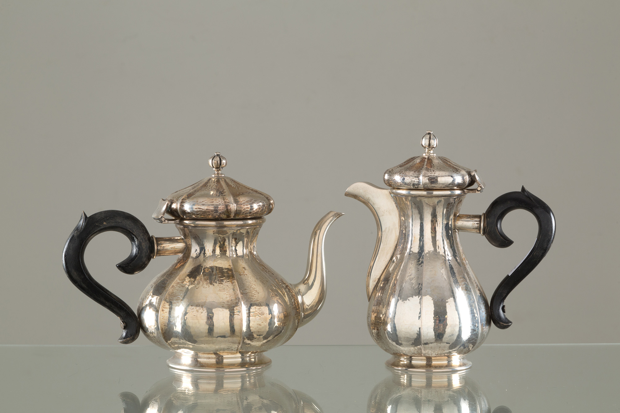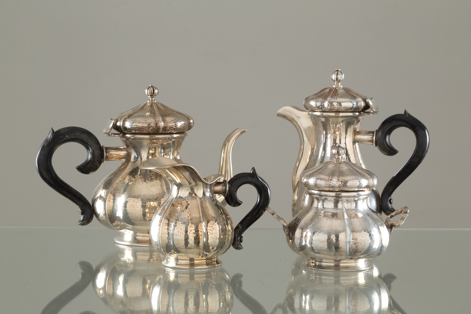Lattiera, teiera, caffettiera e zuccheriera in argento 800 con manici in legno, gr. 1400 ca. complessivi. XX secolo.
