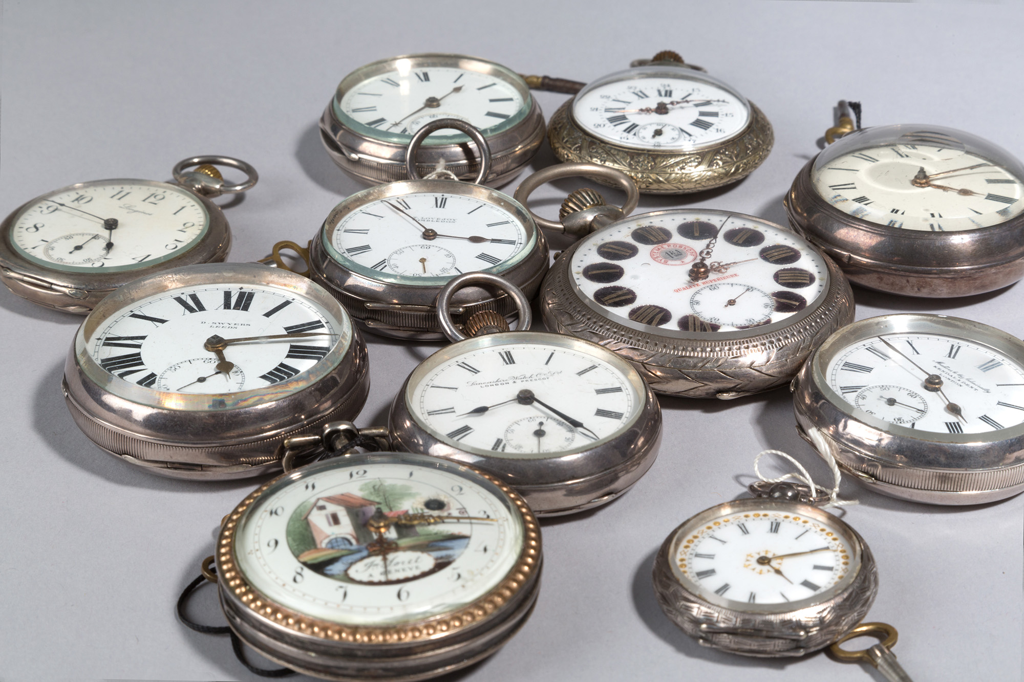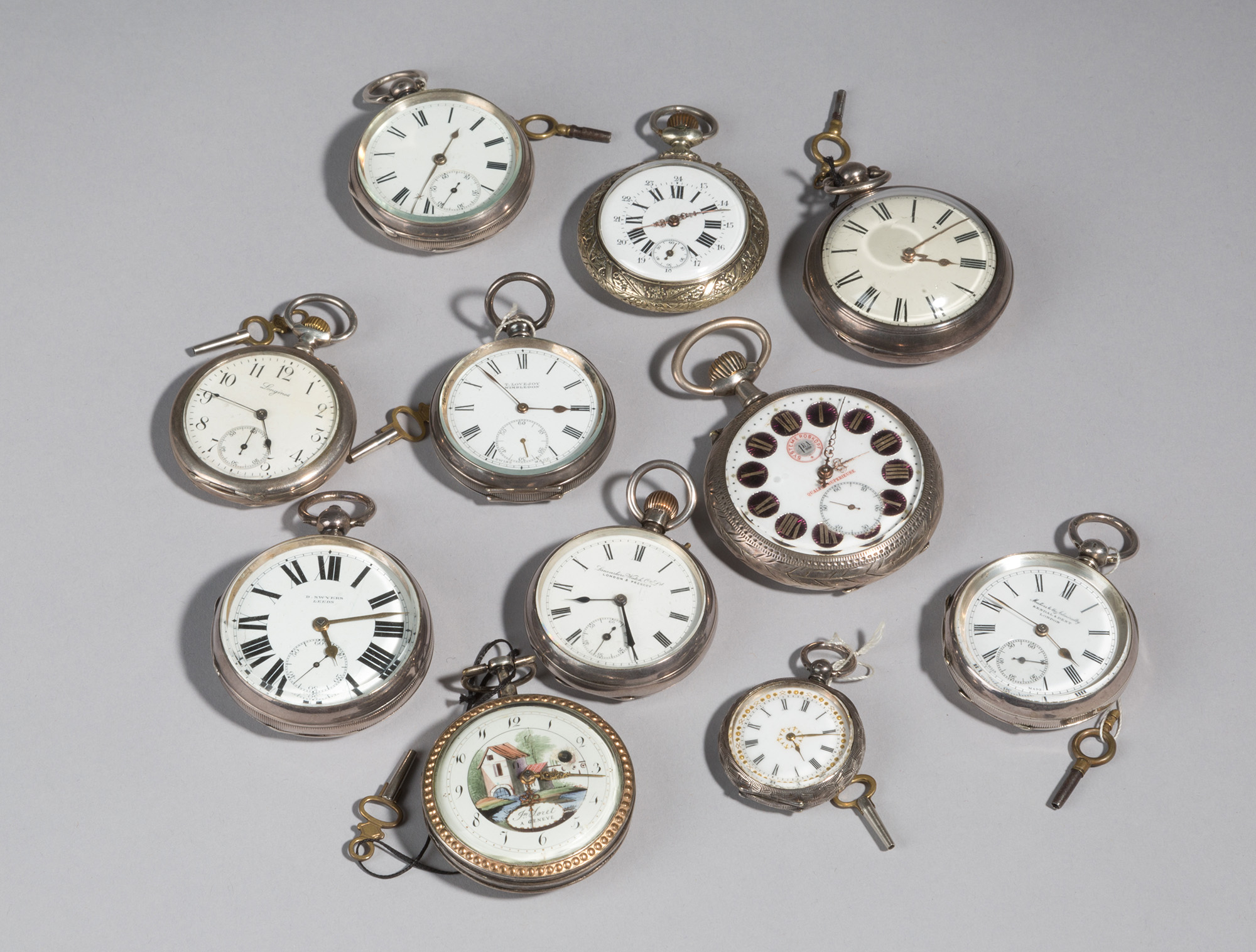 Undici orologi da tasca in argento. XIX secolo. Misure varie.