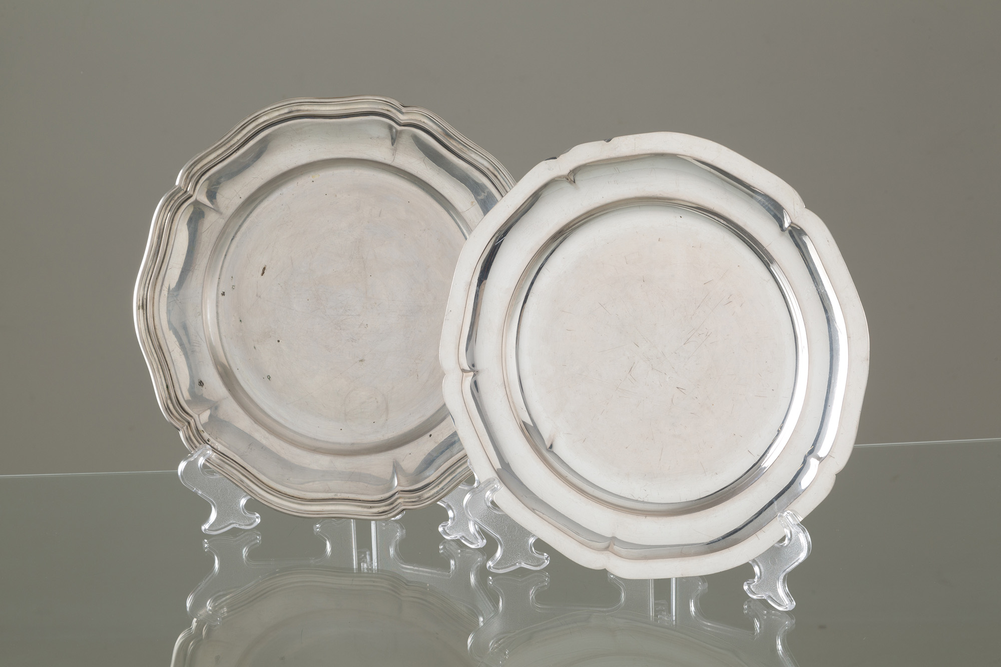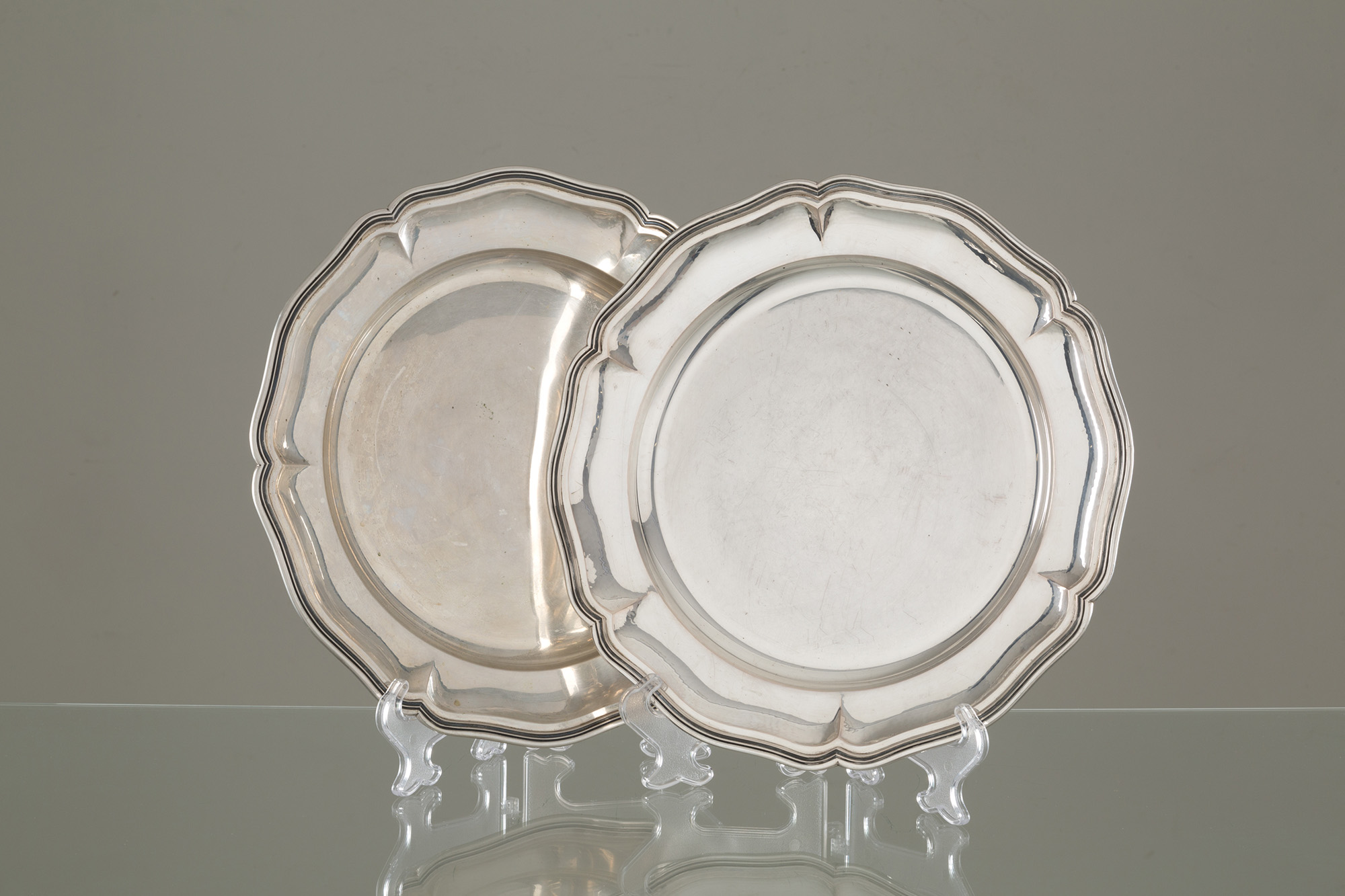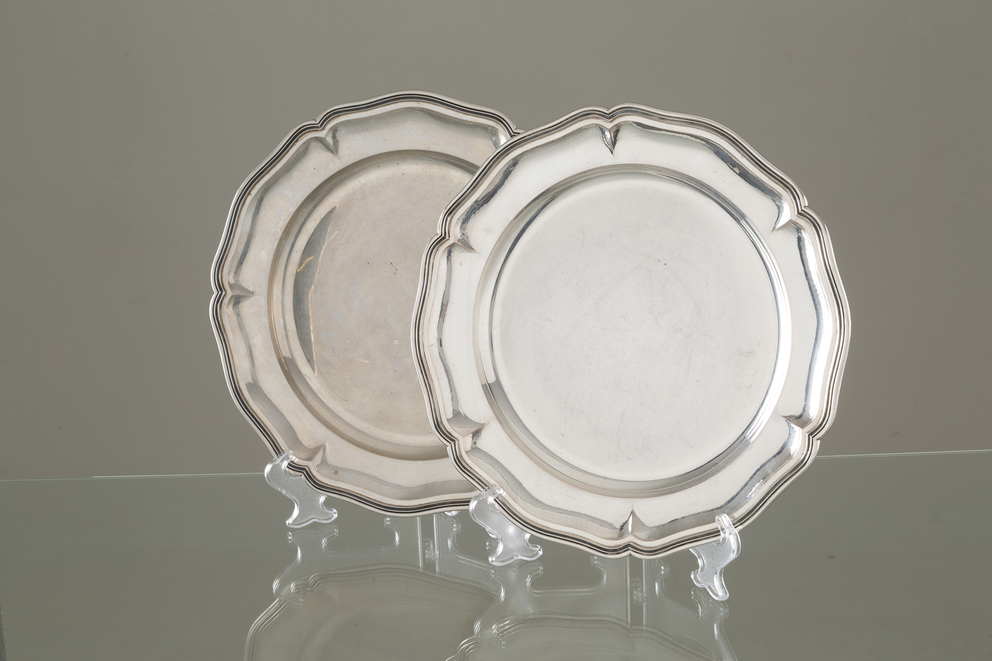 Quattro piatti polilobati in argento 800, gr. 2900 ca. complessivi. XX secolo. Mis. Diam. cm. 32 e 36 ca.