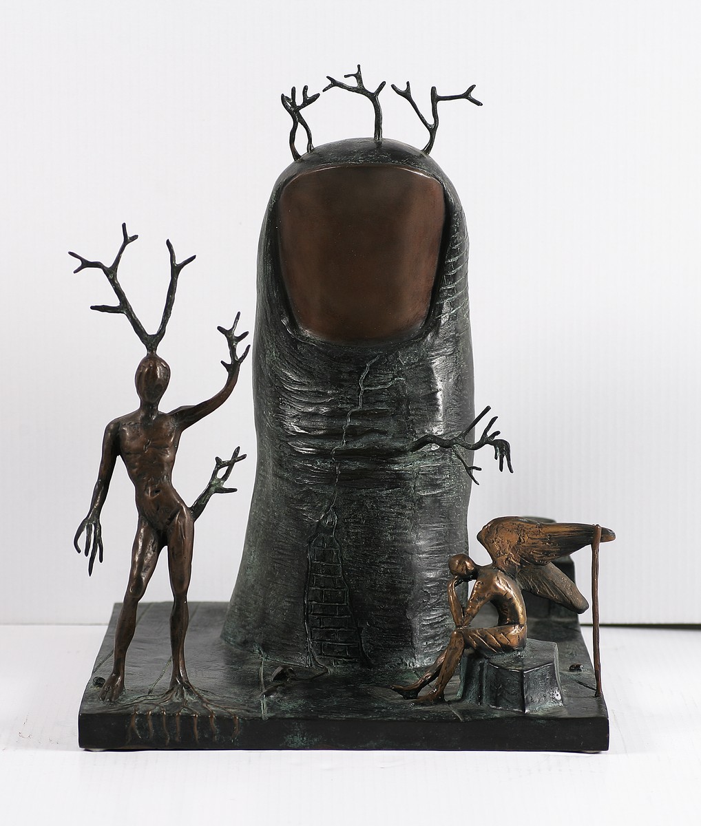 DALI' SALVADOR (1904 - 1989) La vision de l'ange. 1977. Bronzo. Cm 34,00 x 44,00 x 34,00. Bronzo patina verde. Edizione: 350 + 35 E.A. Esemplare: 83. Autentica su fotografia a cura di Master International Art s.r.l.. Alla base riporta incisi, la firma dell'artista, il punzone della fonderia Venturi Arte, Bologna e il marchio dell’editore Jemelton.