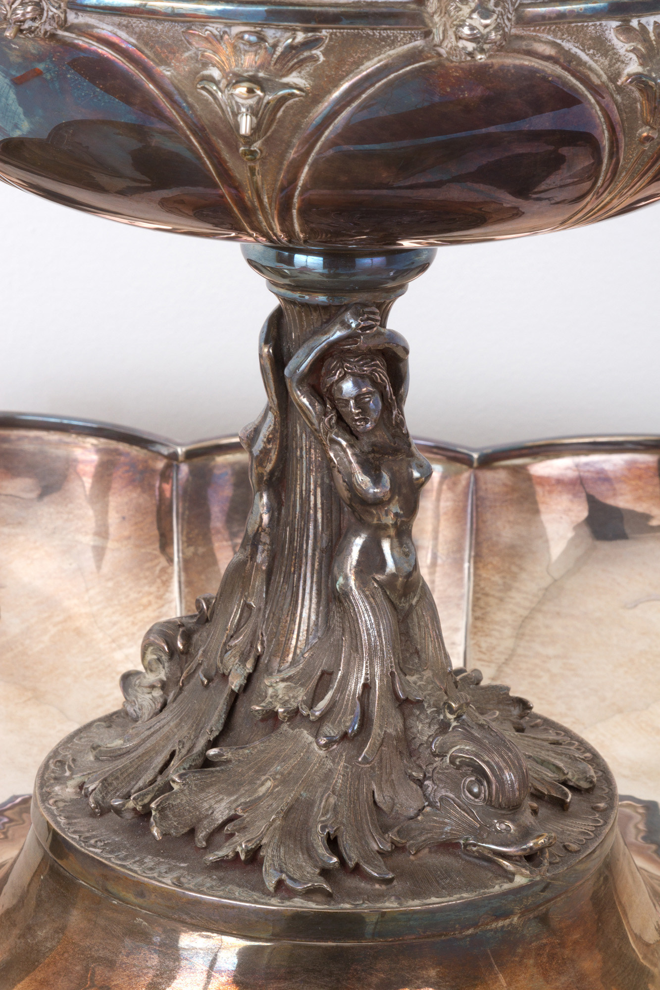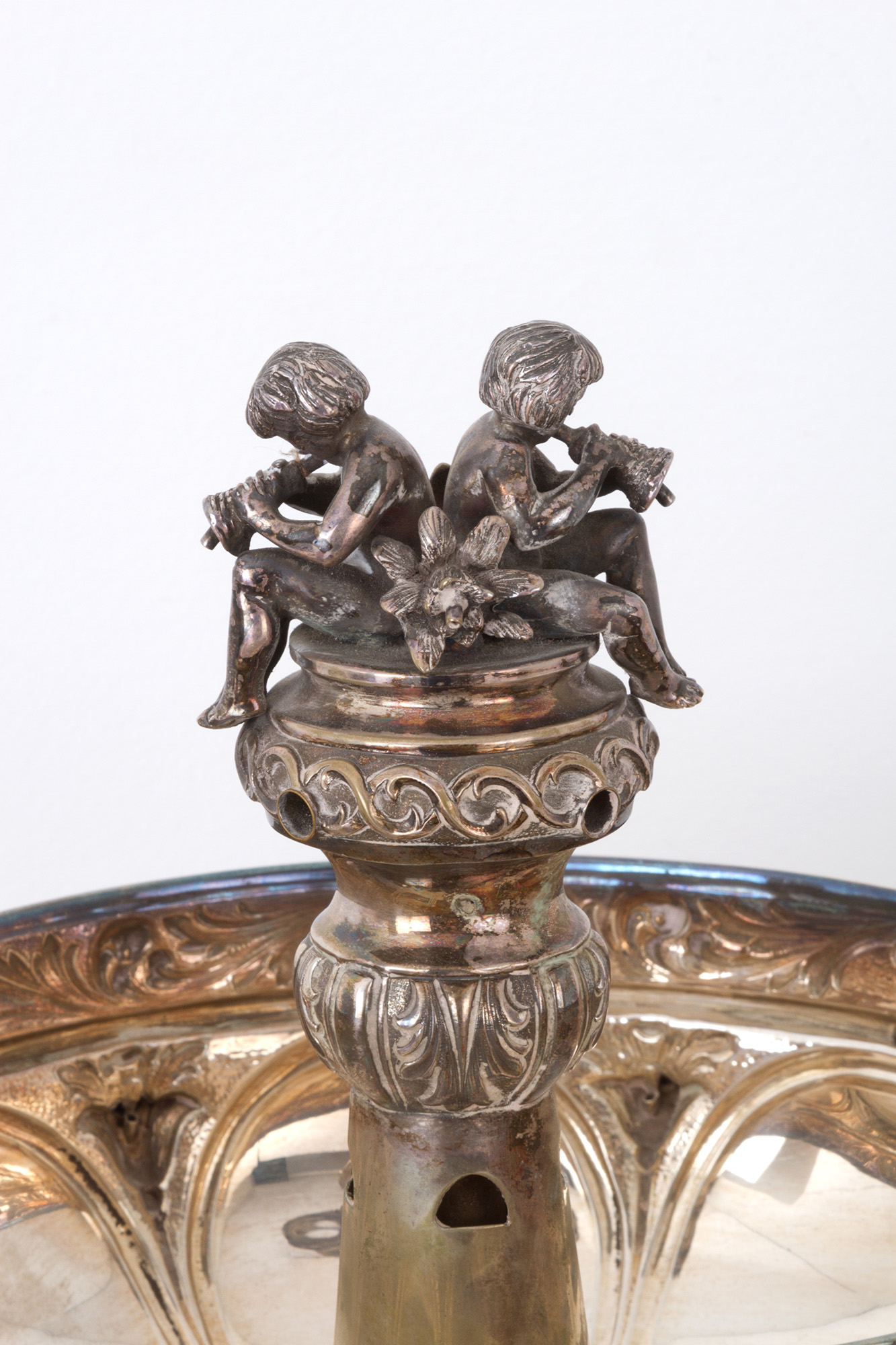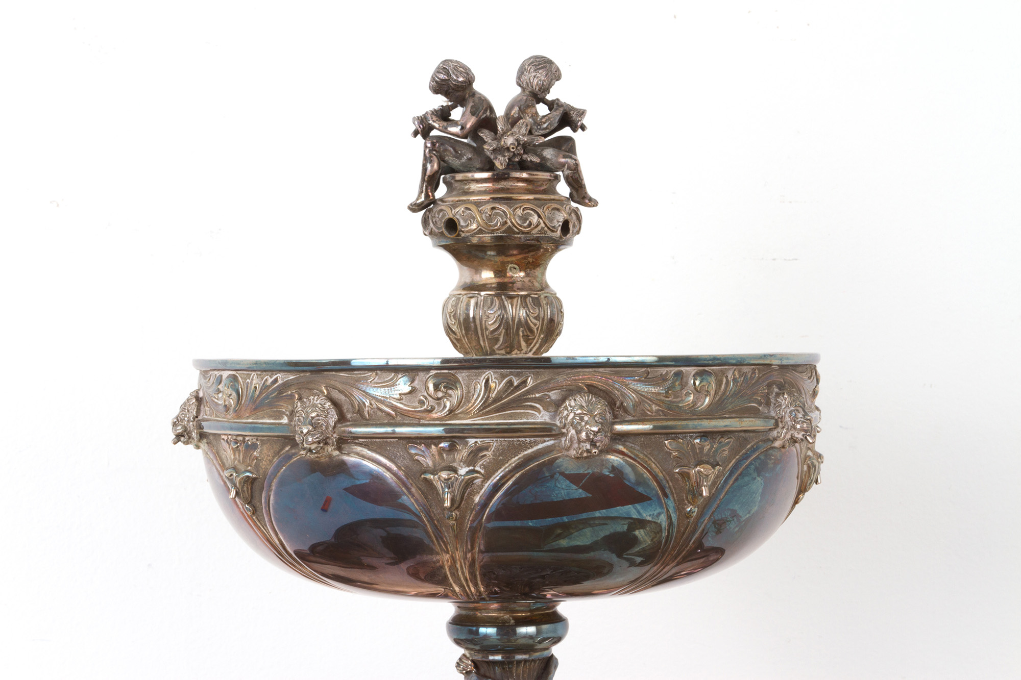Fontana da tavolo in argento 800 sbalzato e cesellato. gr. 7000 ca. Base in marmo nero. XX secolo. Funzionante con ricircolo d'acqua. Mis. Lung. cm. 50 Alt. cm. 50 Prof. cm. 50 ca.