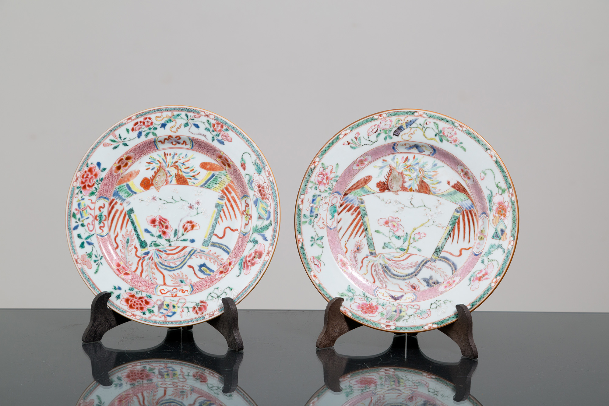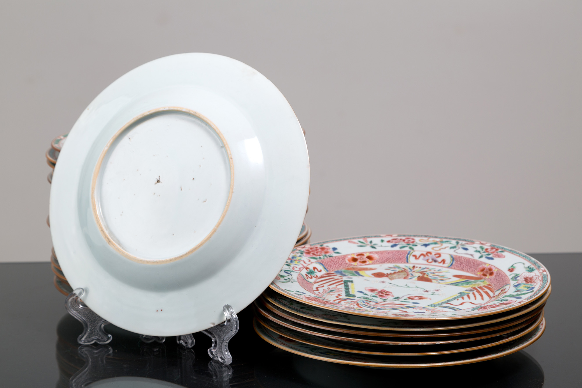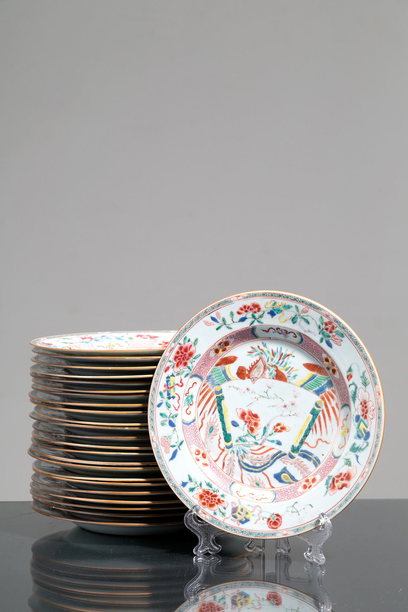 Ventiquattro piatti in porcellana bianca Imari dipinta con soggetti floreali. Giappone. XIX secolo. Mis. Diam. cm. 23 ca.