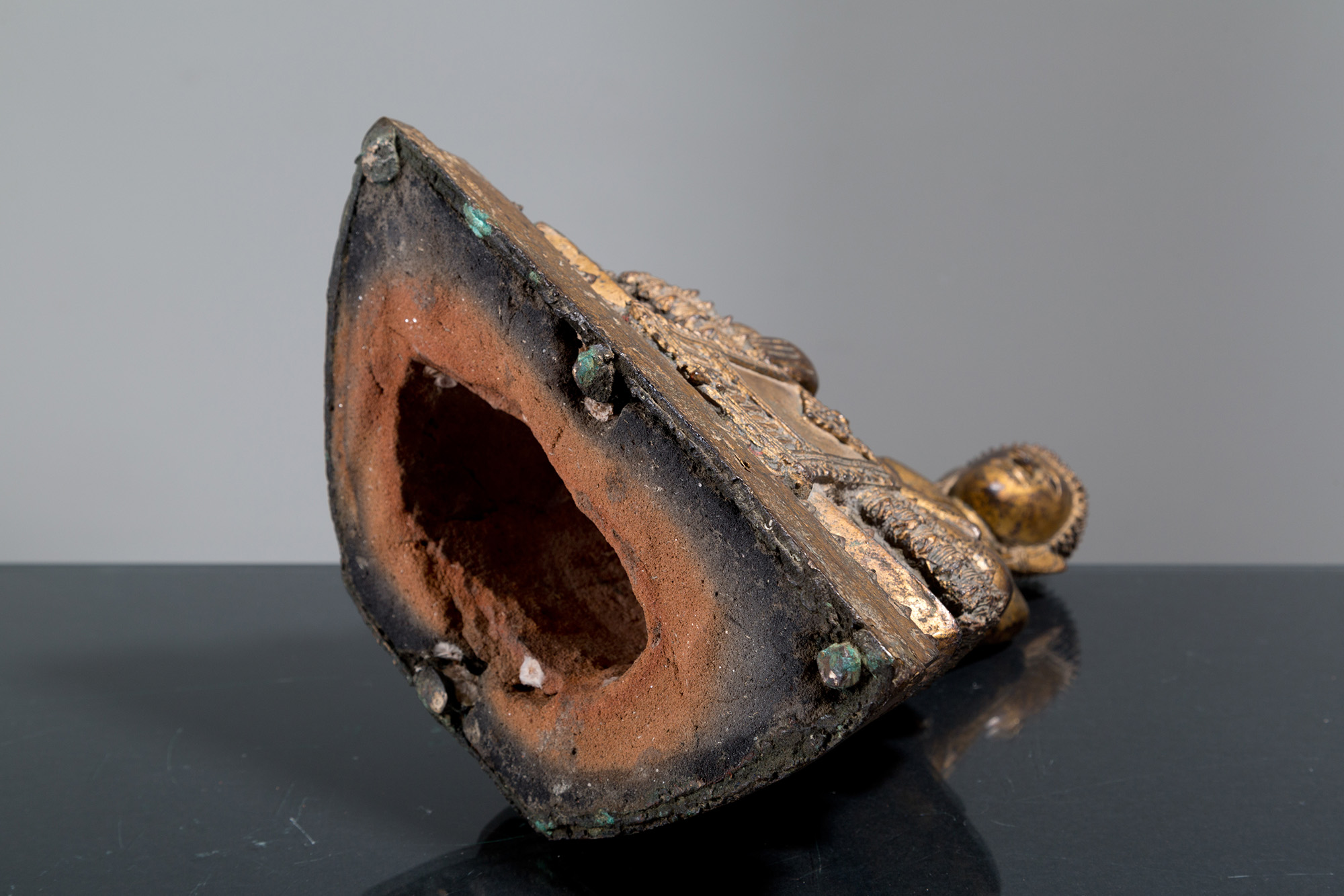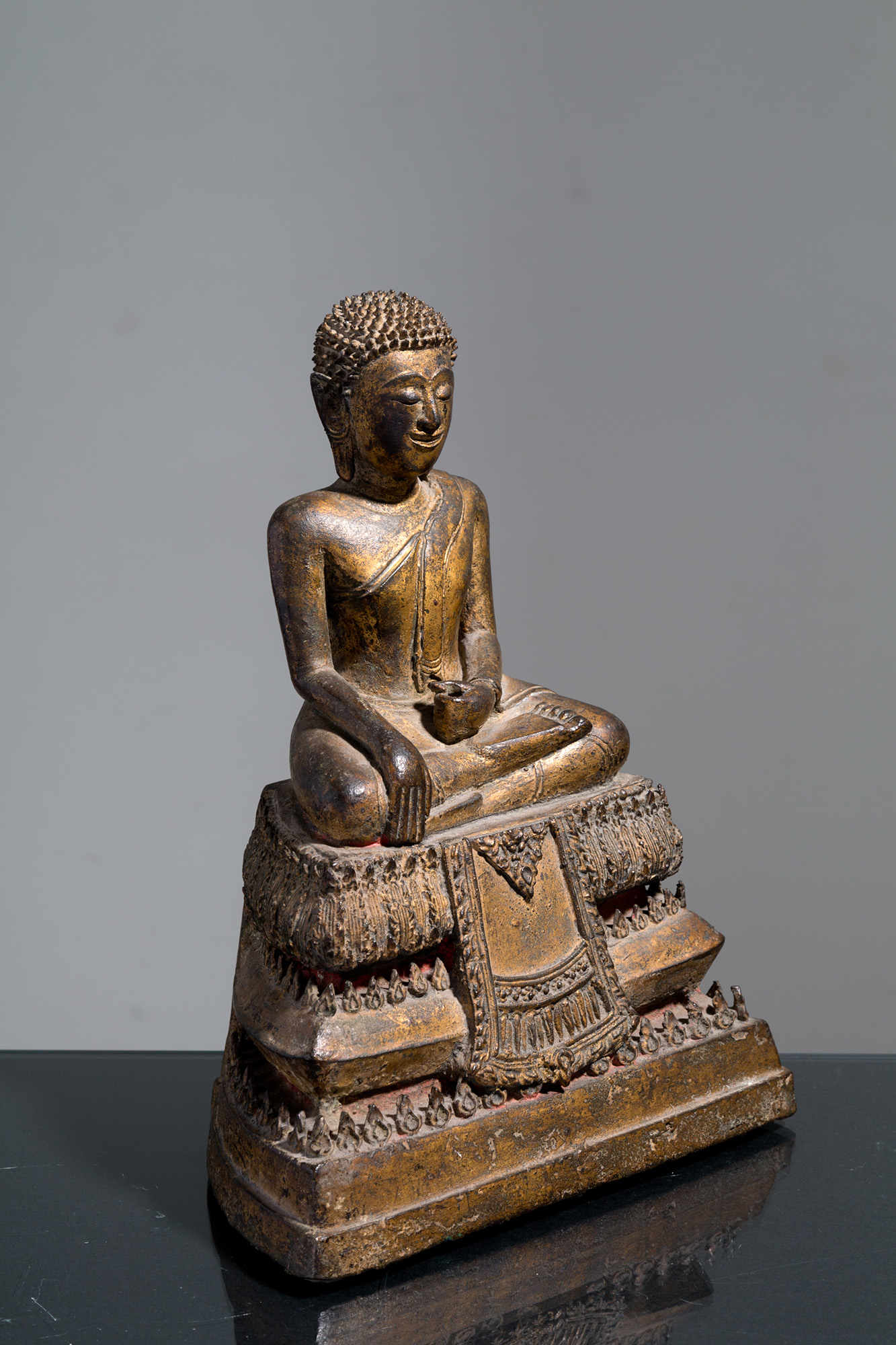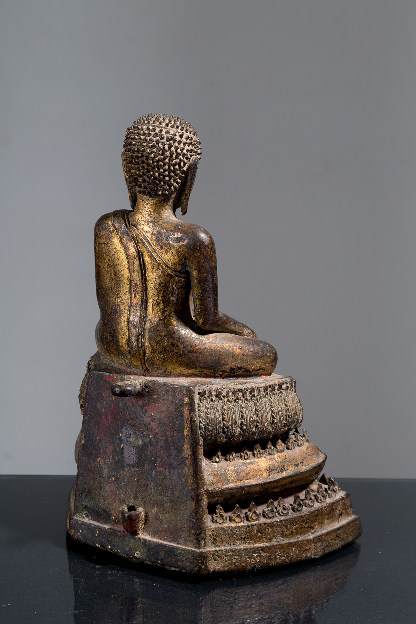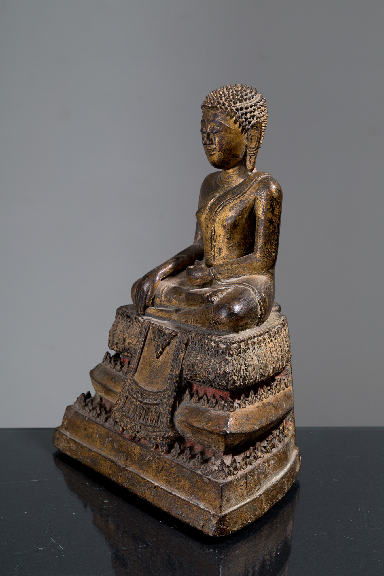 Scultura in bronzo raff. ''BUDDHA'' con tracce di lacca rossa sulla base. Thailandia. XVII secolo. Mis. Lung. cm. 22 Alt. cm. 22 Prof. cm. 13 ca.