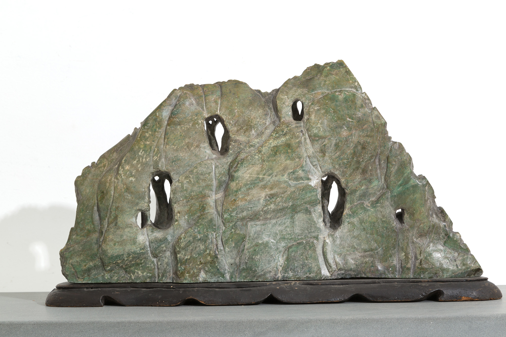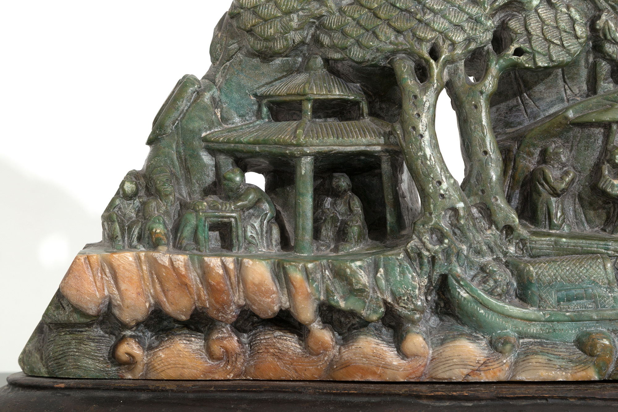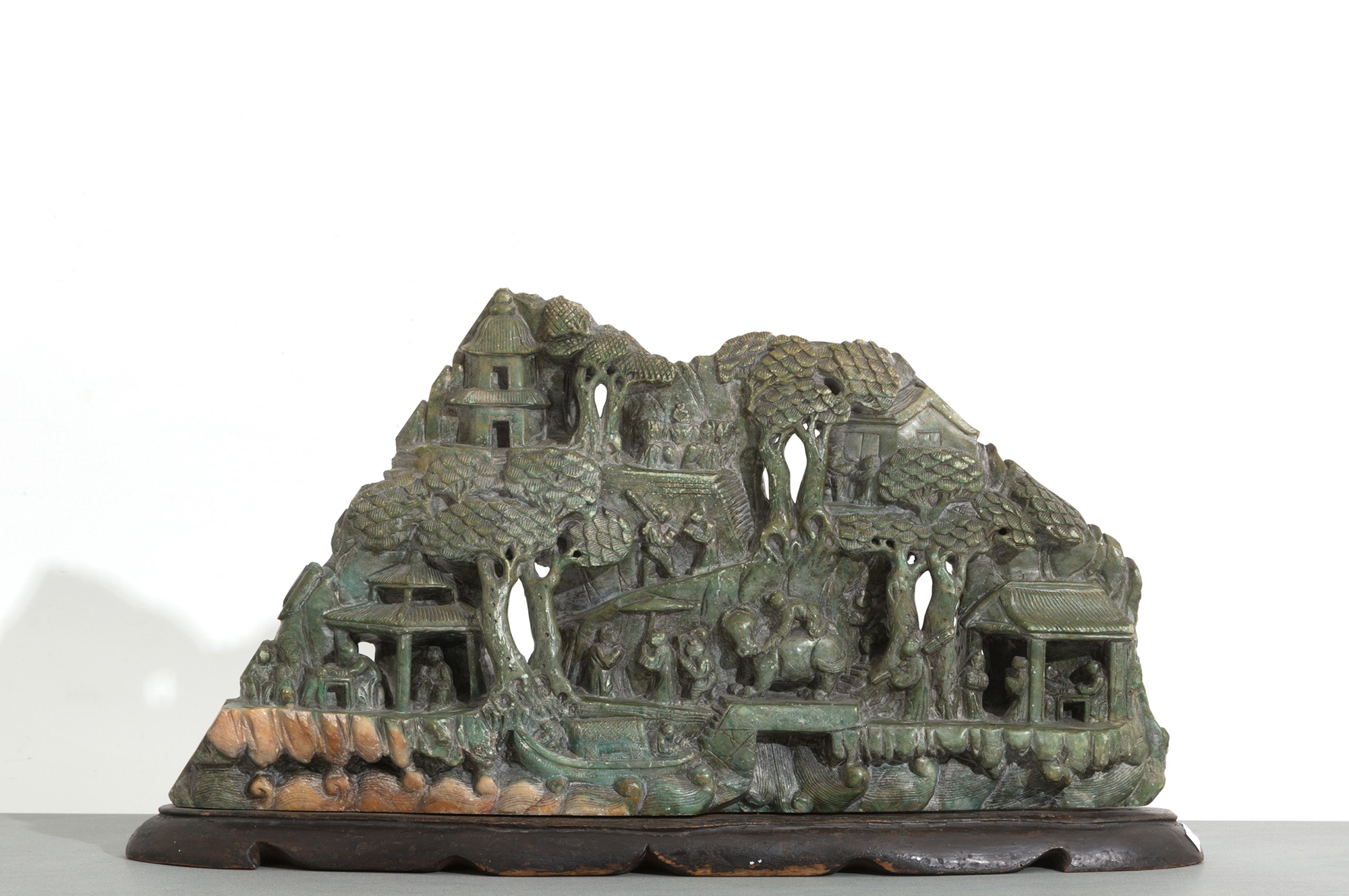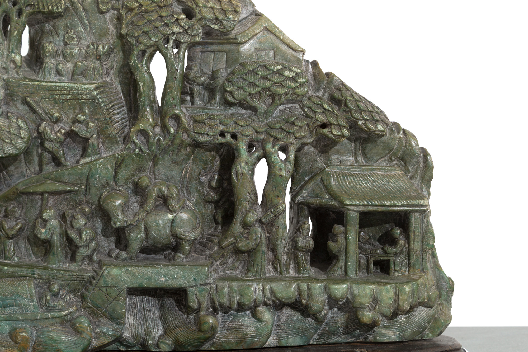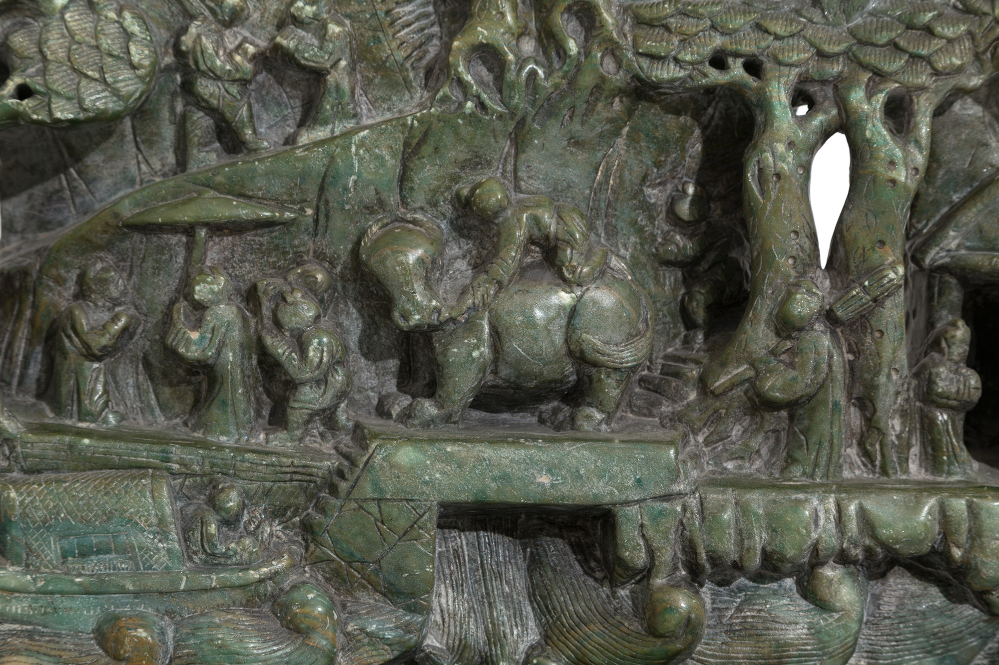 Scultura in pietra saponaria nei toni del verde raff. ''SCENA DI VITA ORIENTALE''. Base in legno. Cina. XIX secolo. Mis. Lung. cm. 64 Alt. cm. 35.5 Prof. cm. 8 ca.