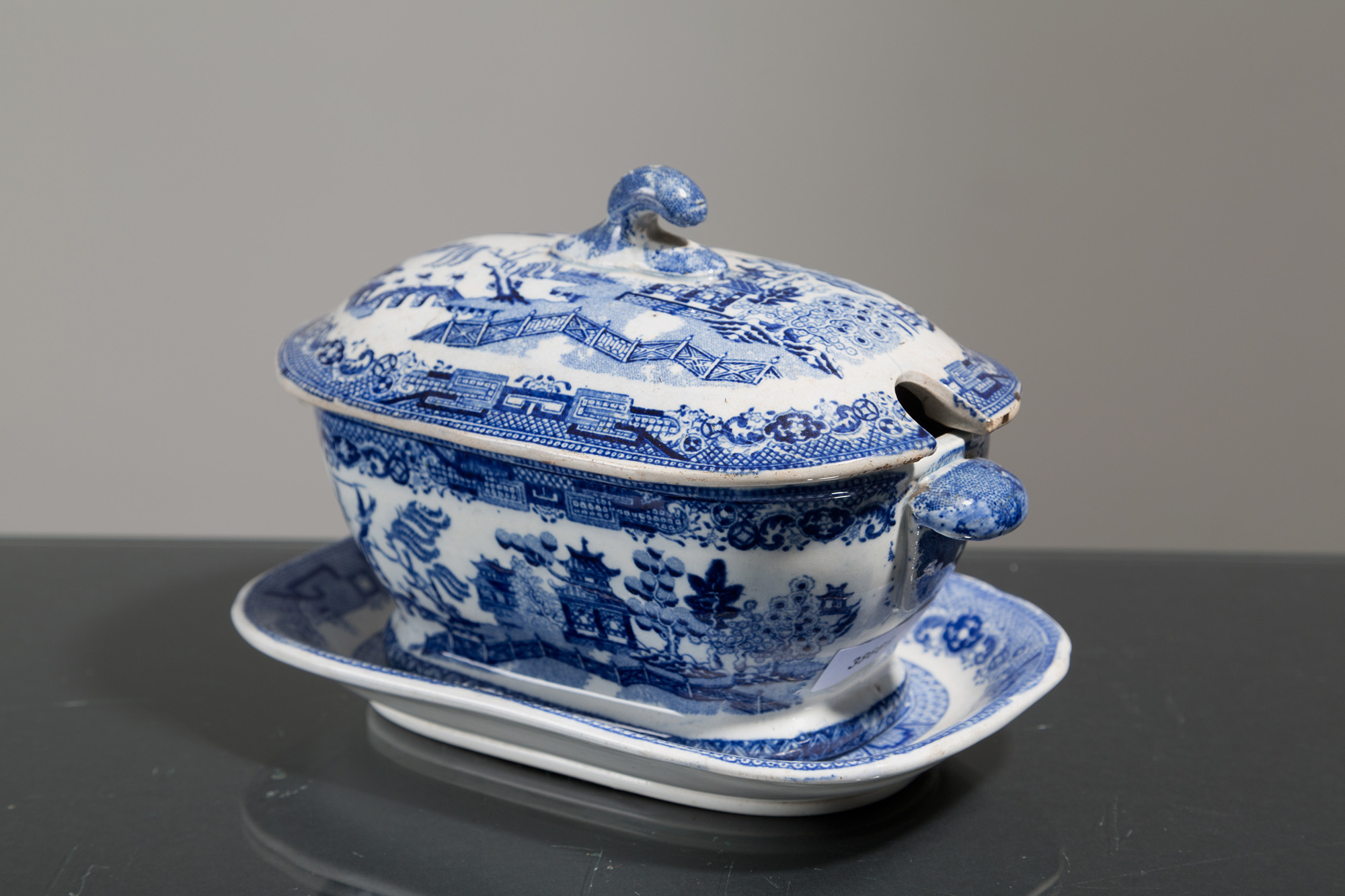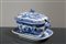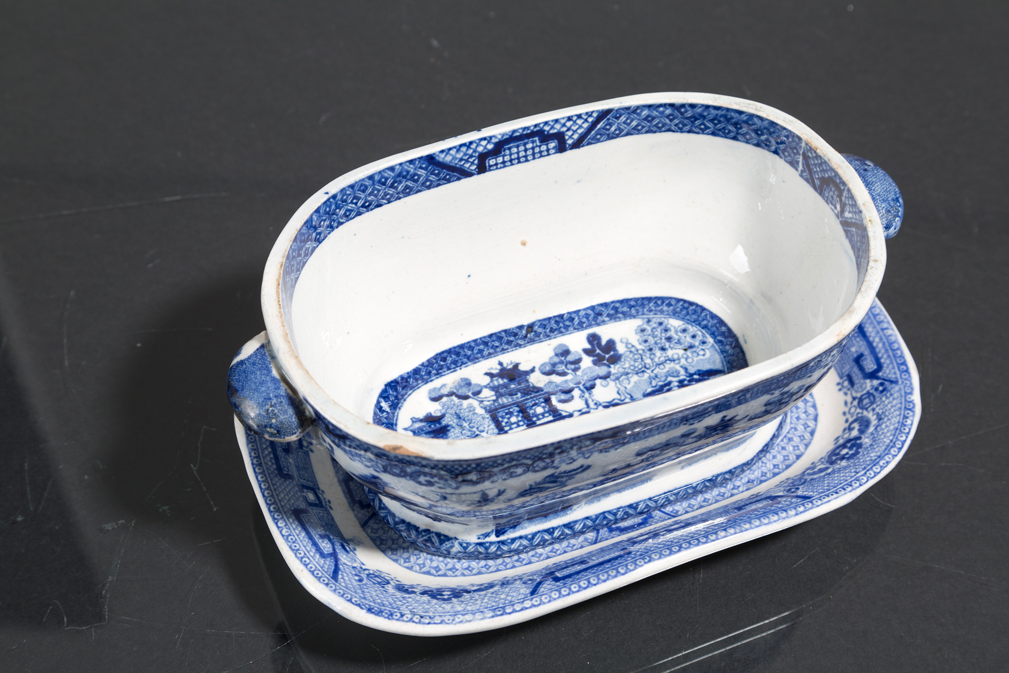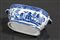 Salsiera con piattino in porcellana bianca con decori nei toni del blu. Cina. XIX secolo. Mis. Lung. cm. 13 Alt. cm. 12 Prof. cm. 20 ca.