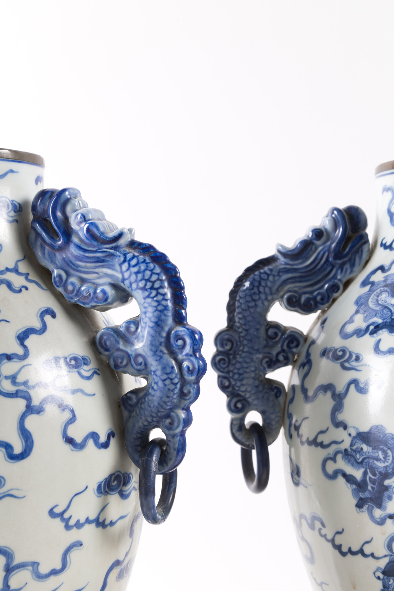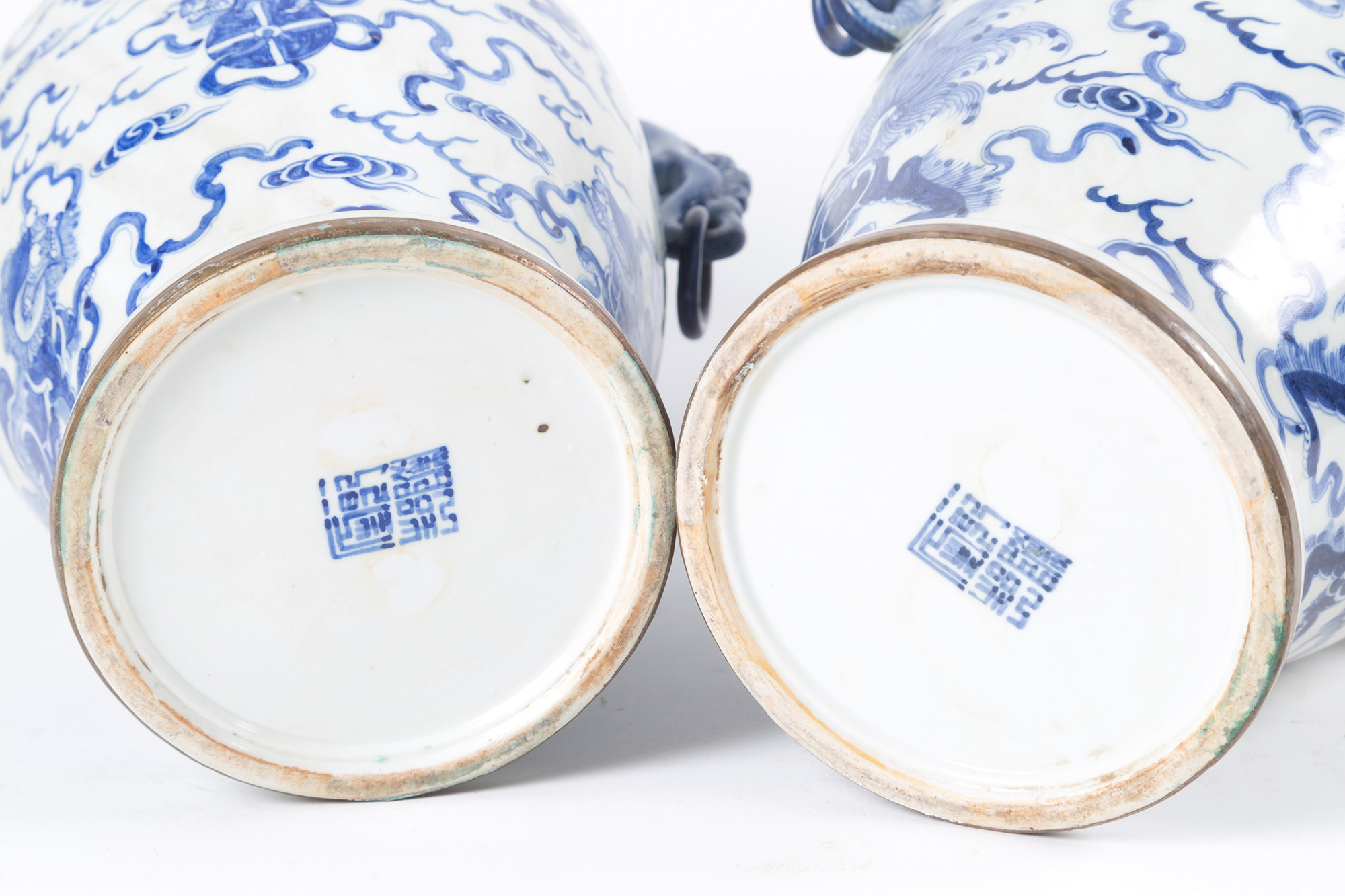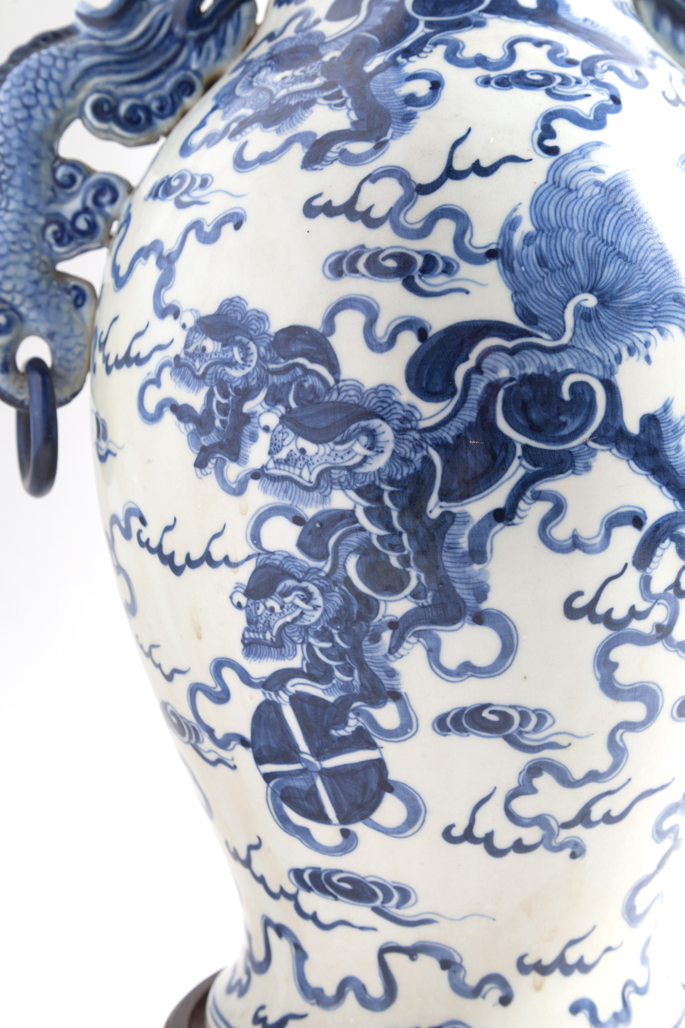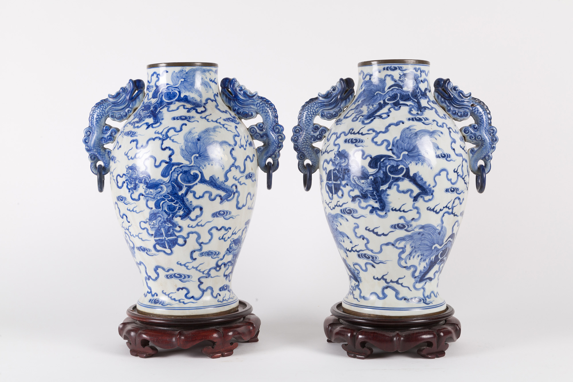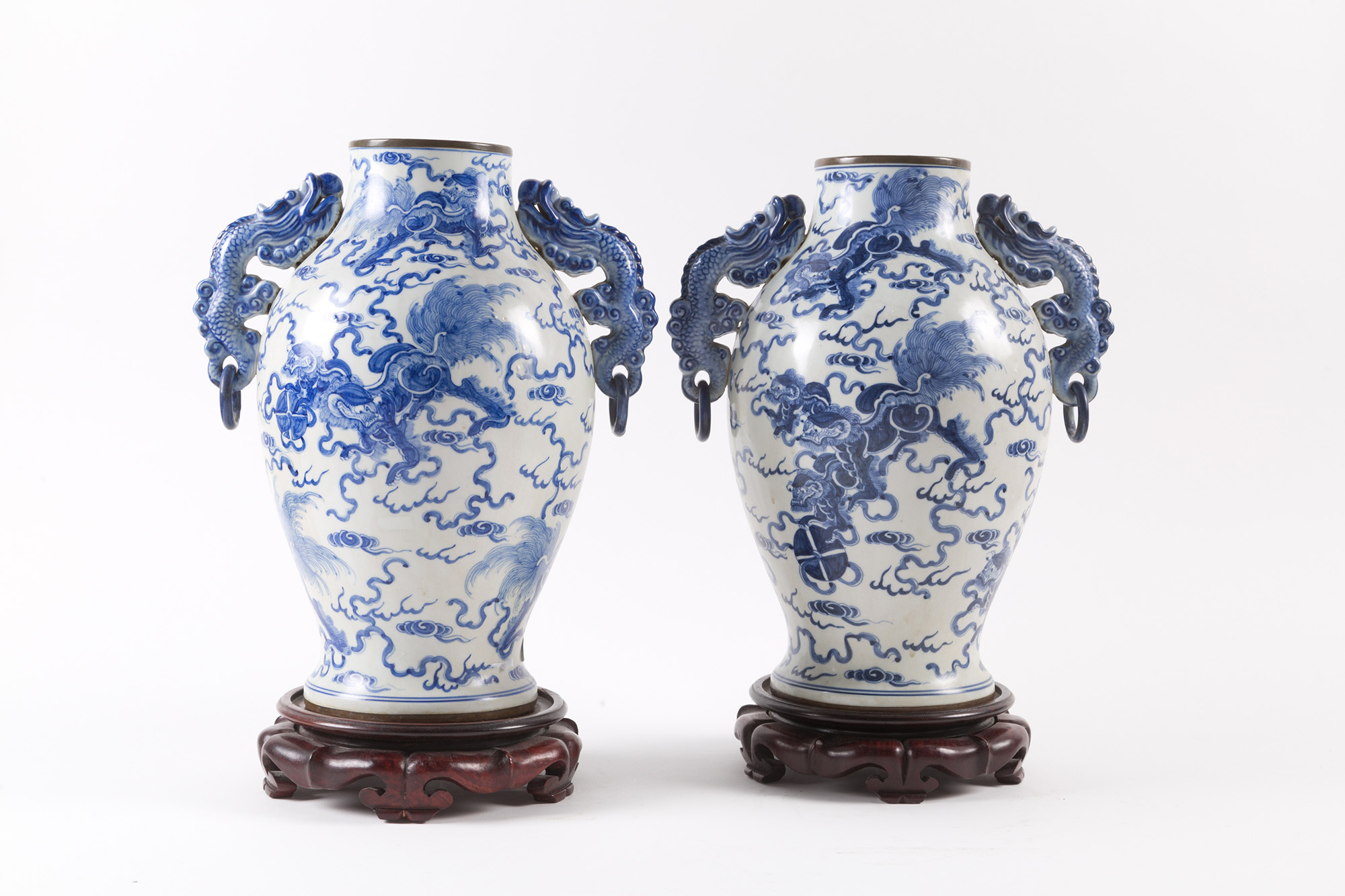 Coppia di vasi in porcellana bianca e blu con anse a guisa di draghi. Marcati sul fondo. Basi in legno. Cina. XIX secolo. Mis. Alt. cm. 34 ca.
