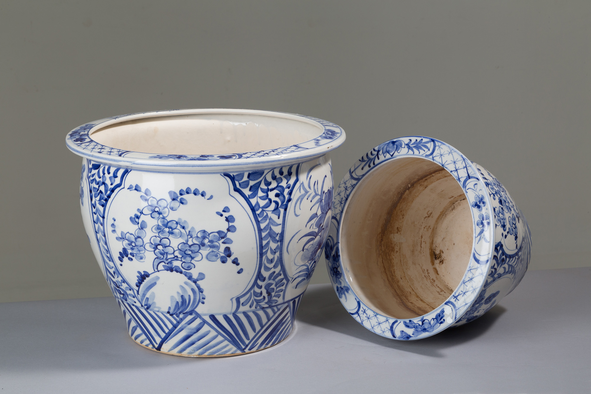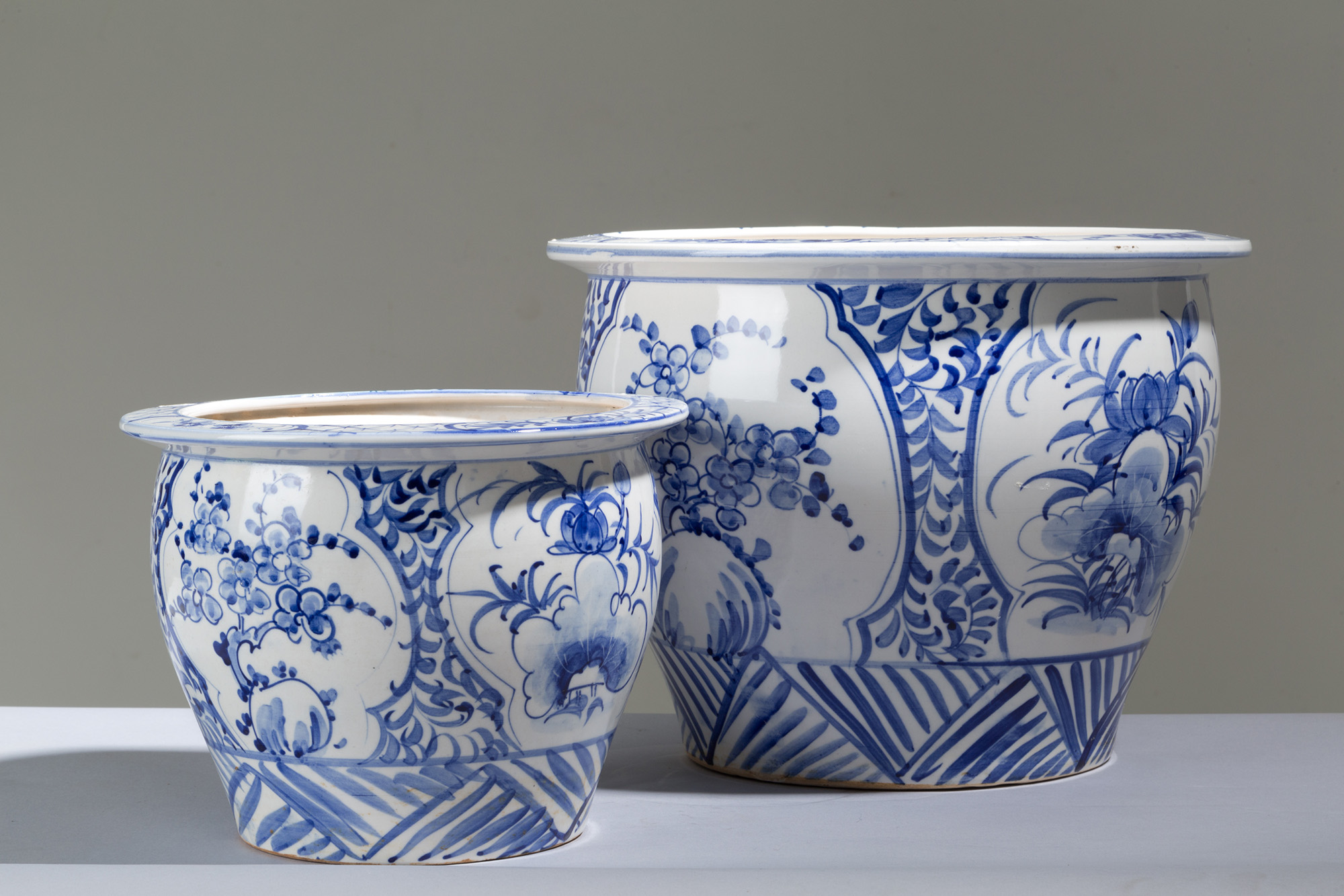 Due cachepot in ceramica bianca e blu decorati a motivo floreale. XIX secolo. Mis. Alt. cm. 28, Diam. cm. 38 ca. Mis Alt. cm. 20, Diam. cm. 27 ca.