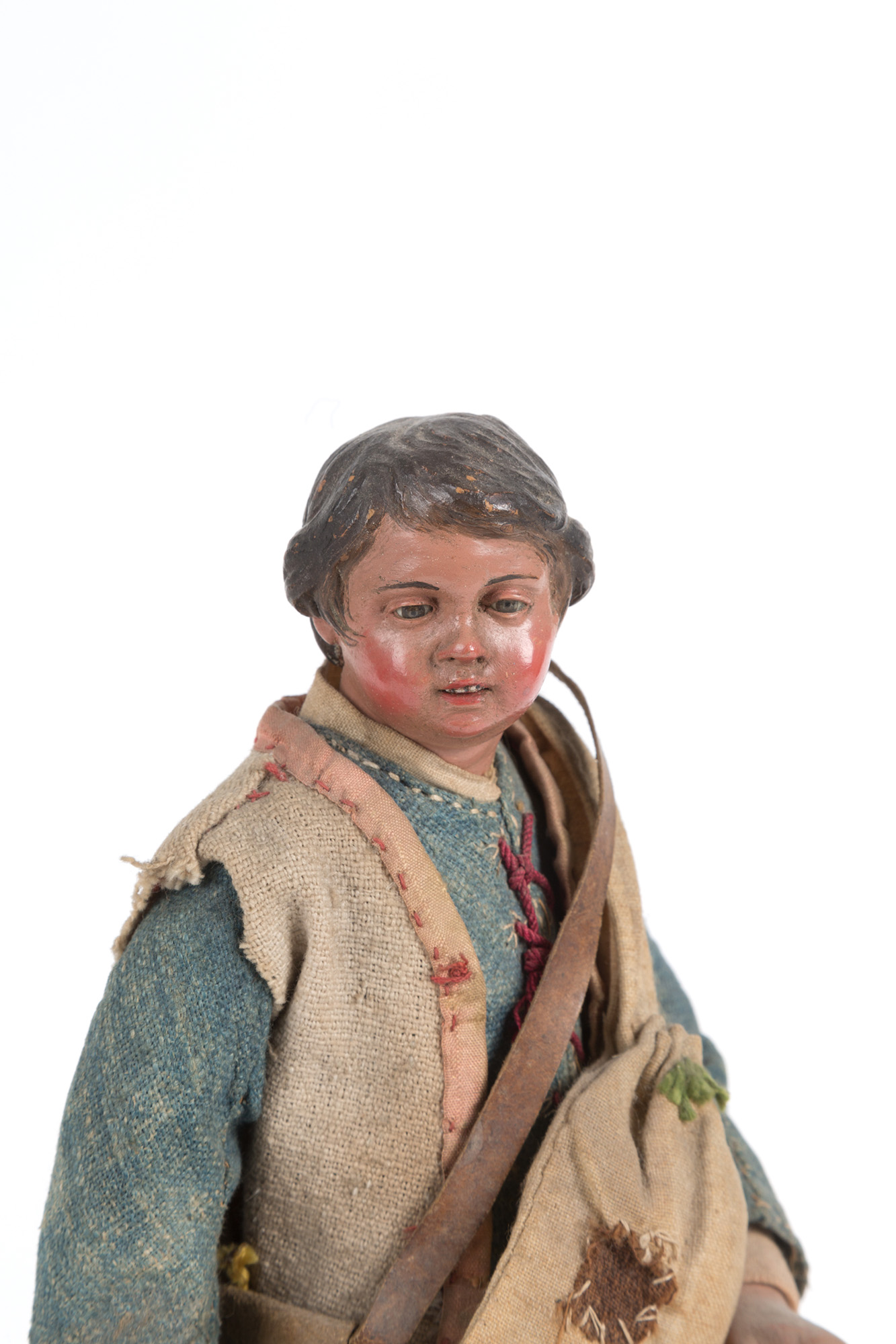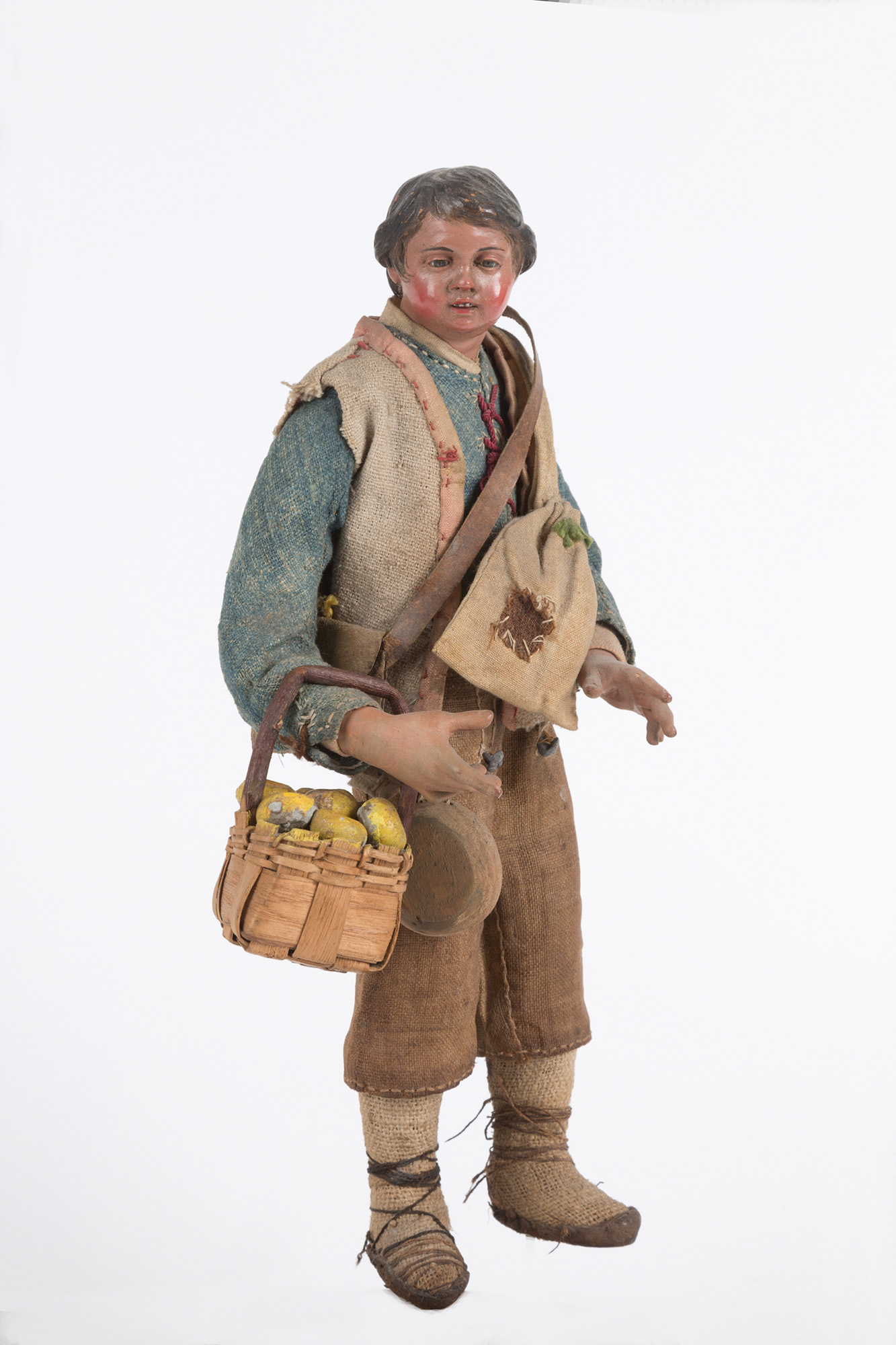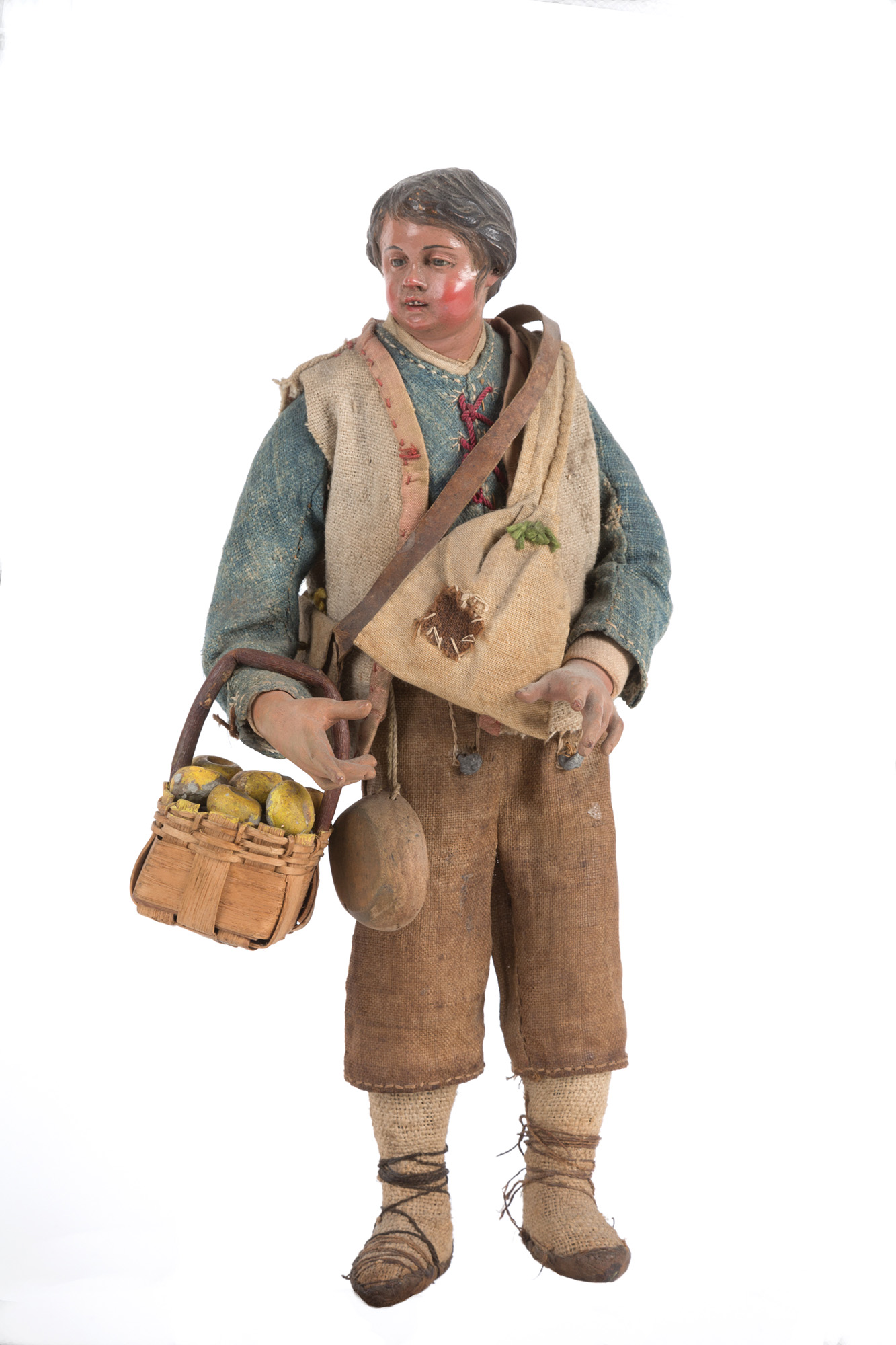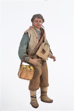 Contadino con cesto di mele in terracotta, legno, paglia e vestiti originali. Napoli. XIX secolo. Mis. Alt. cm. 27.5 ca.