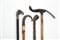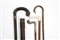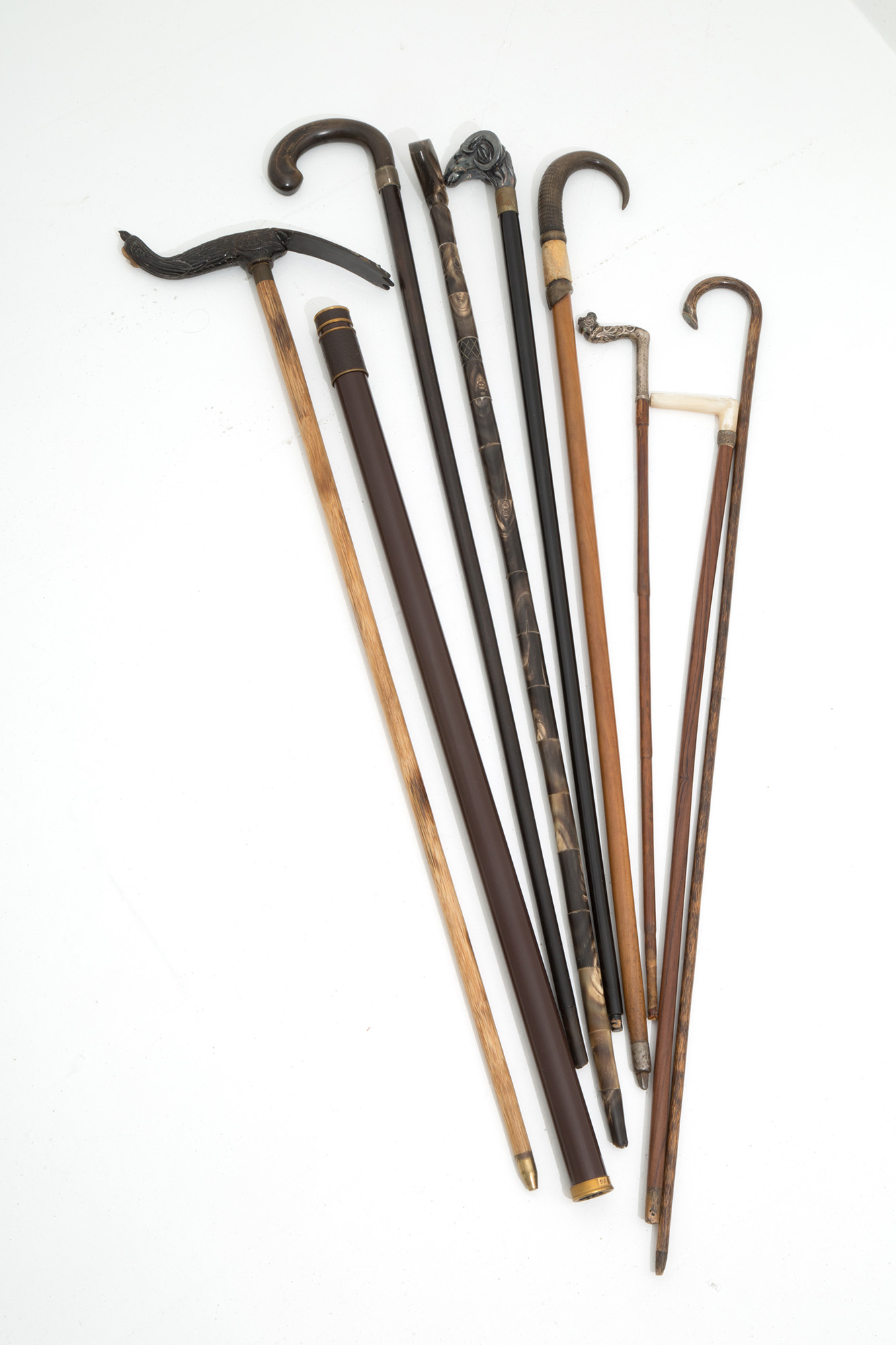 Nove bastoni da passeggio in materiali vari di cui uno animato con ombrello. XIX secolo. Misure varie.