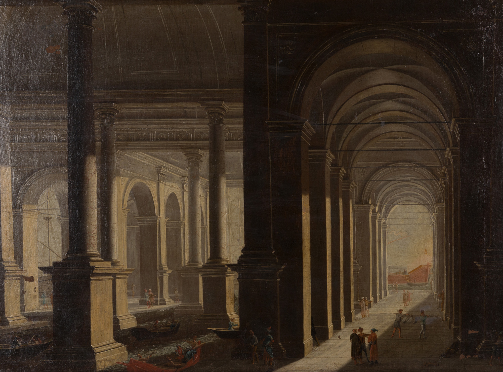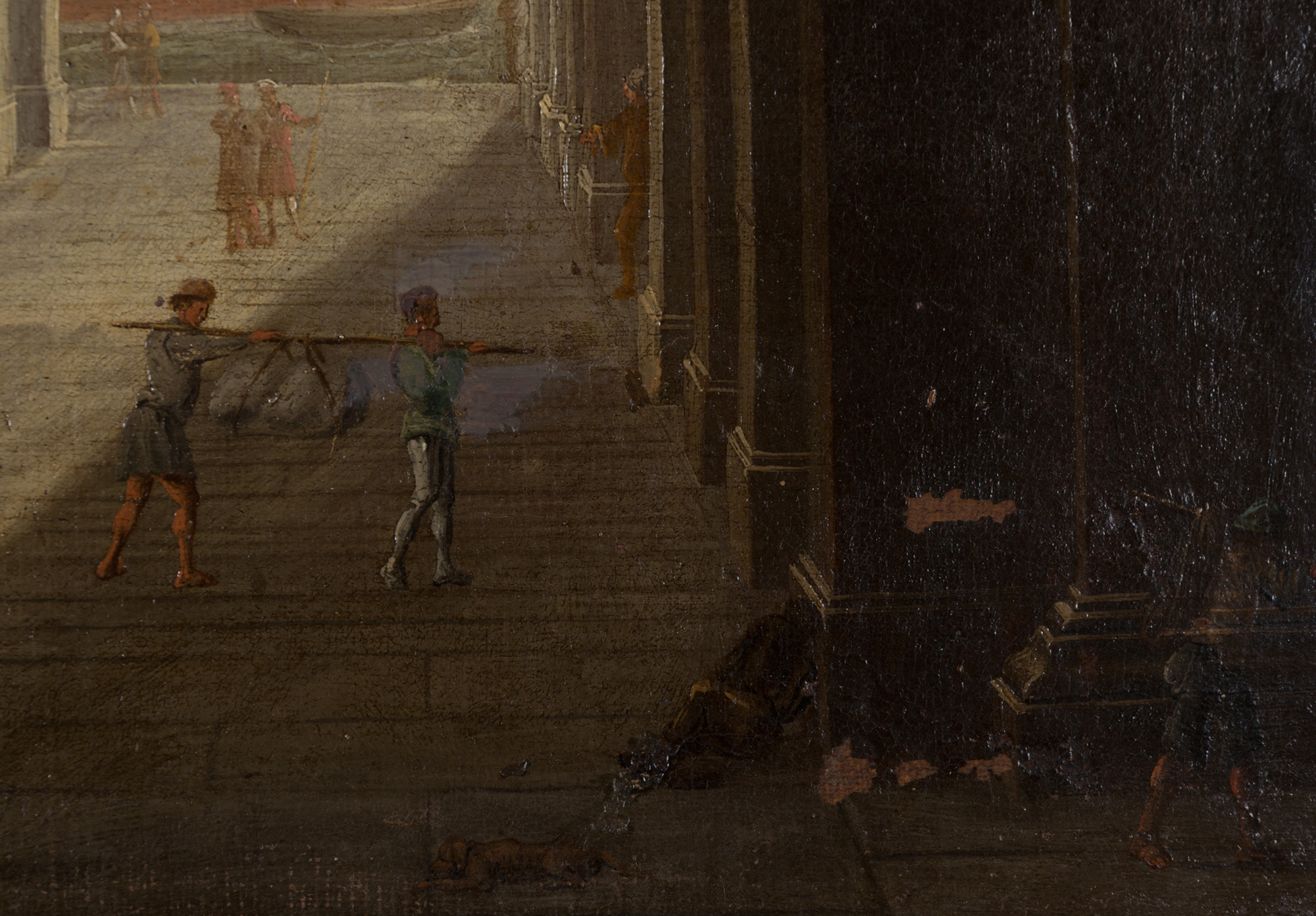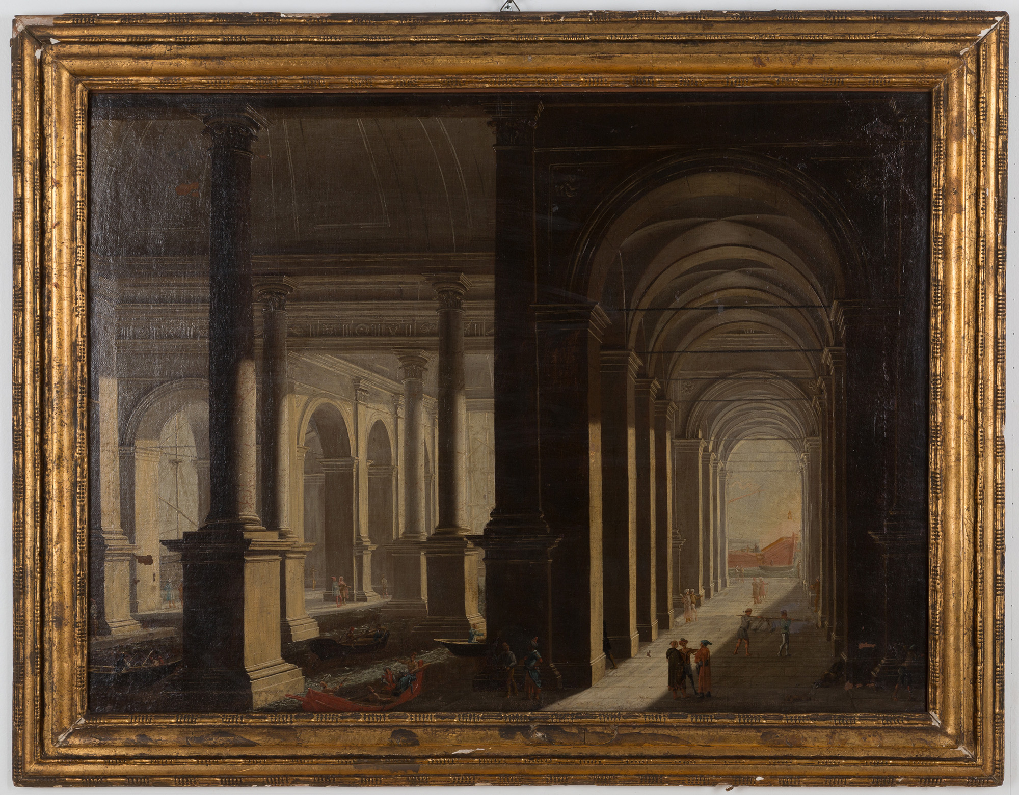 SCUOLA ROMANA DEL XVIII SECOLO. Dipinto olio su tela raff. ''ARCHITETTURA CON FIGURA''. In cornice. Difetti e restauri. Già rintelato e rintelaiato. Mis. Lung. cm. 98 Alt. cm. 73 ca.