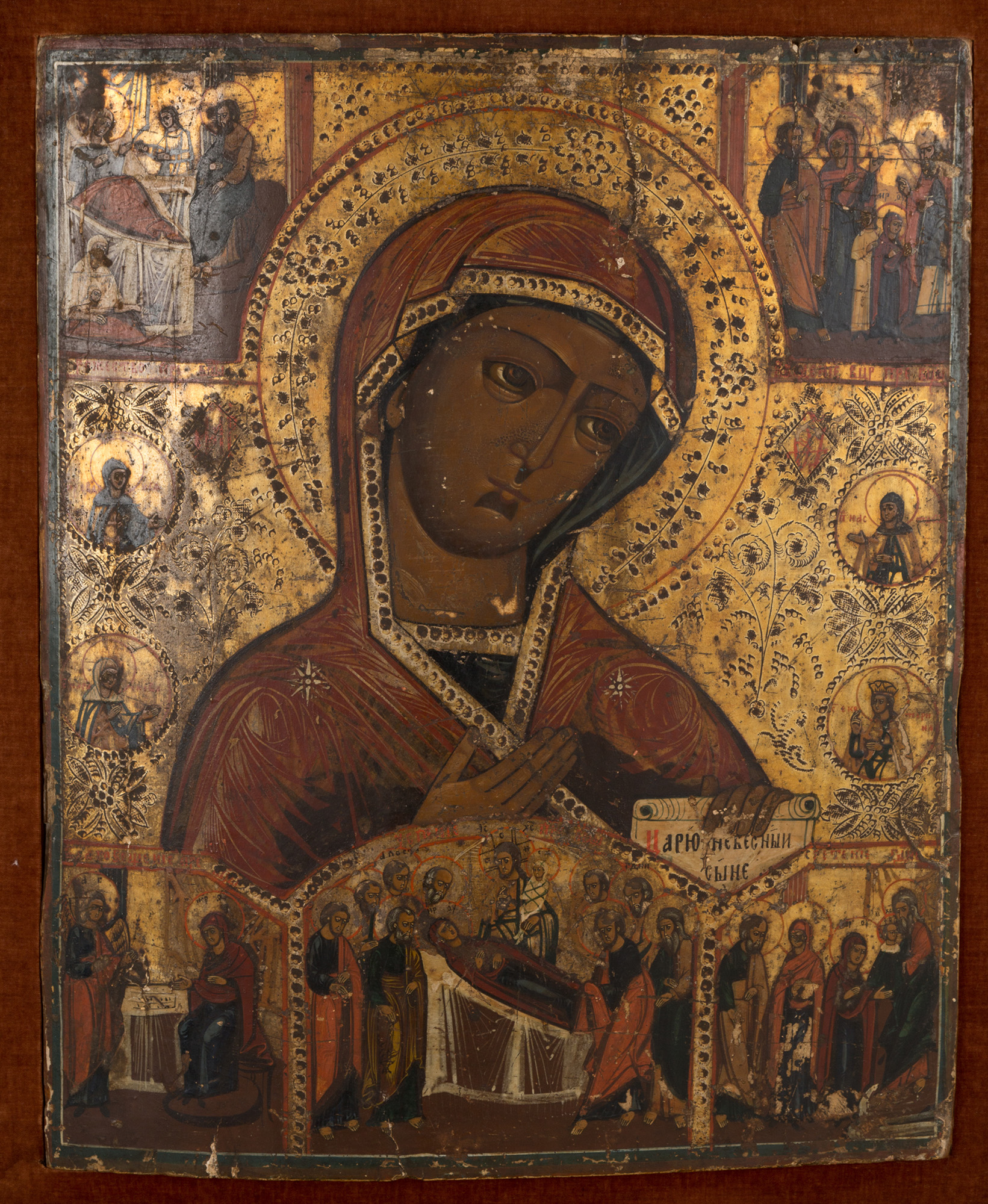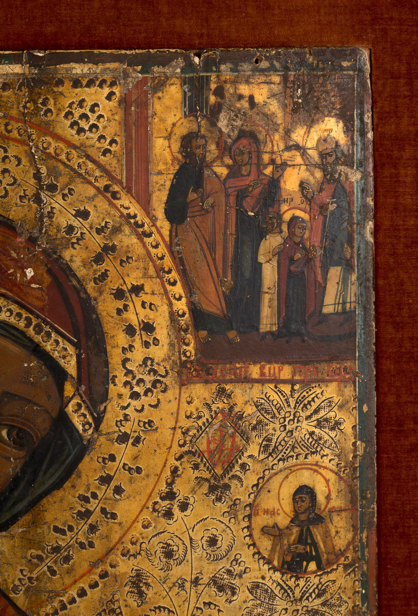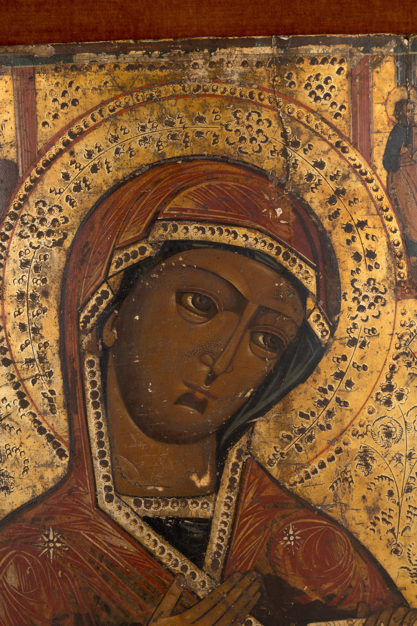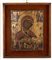 Icona su legno raff. ''MADONNA E SANTI''. XVIII secolo. In cornice. Lievi difetti. Mis. Lung. cm. 44, Alt. cm. 53 ca.