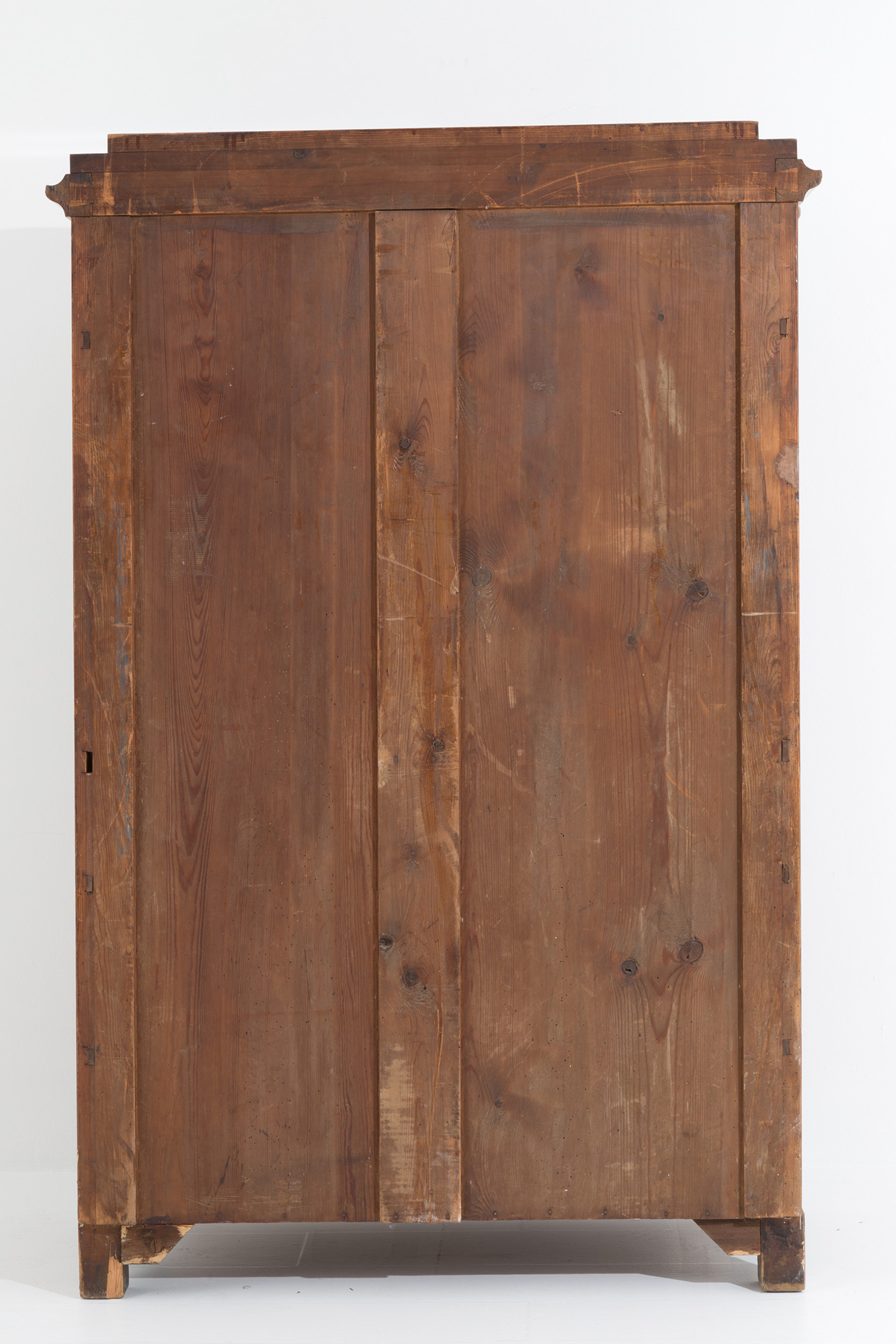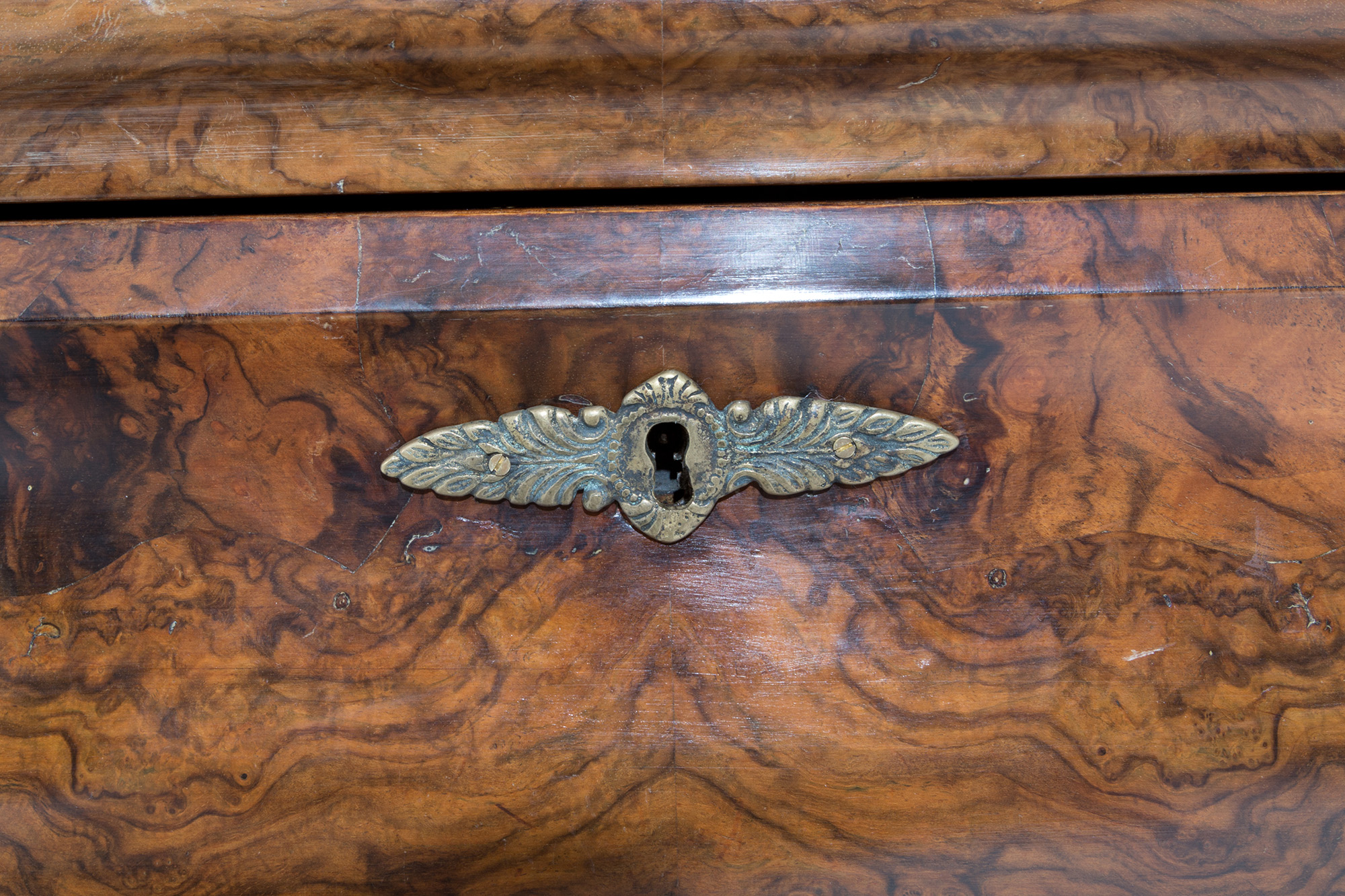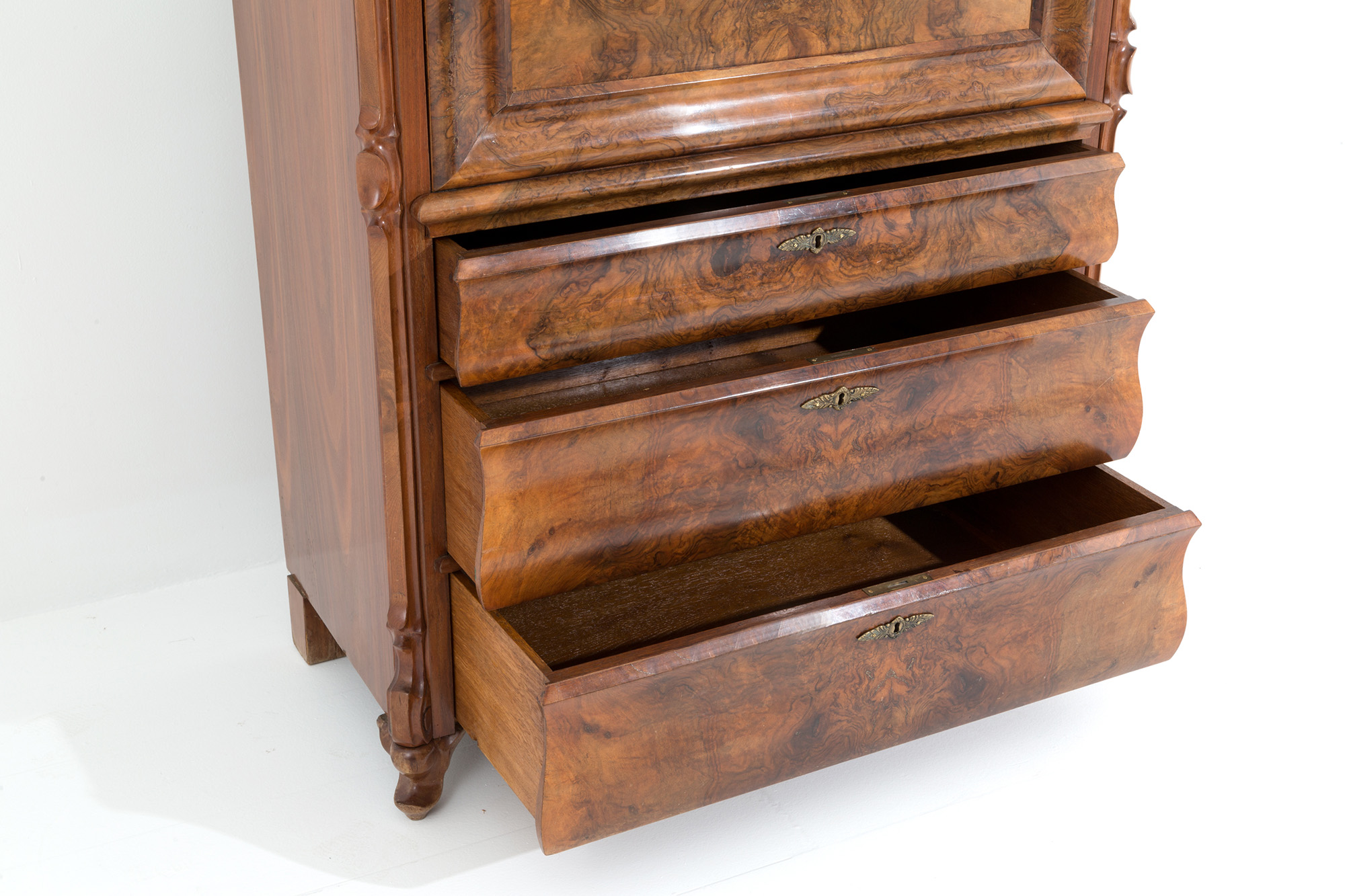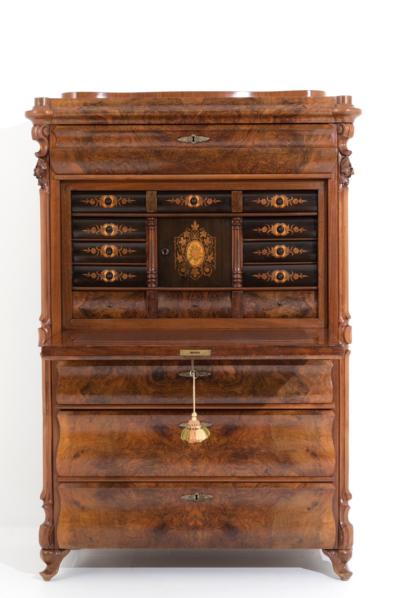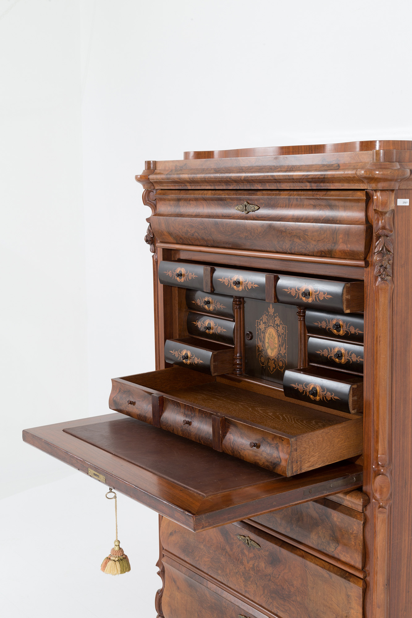 Secretaire lastronato in legni vari con lesene intagliate a motivi di frutta. XIX secolo. Mis. Lung. cm. 106 Alt. cm. 157 Prof. cm. 54 ca.
