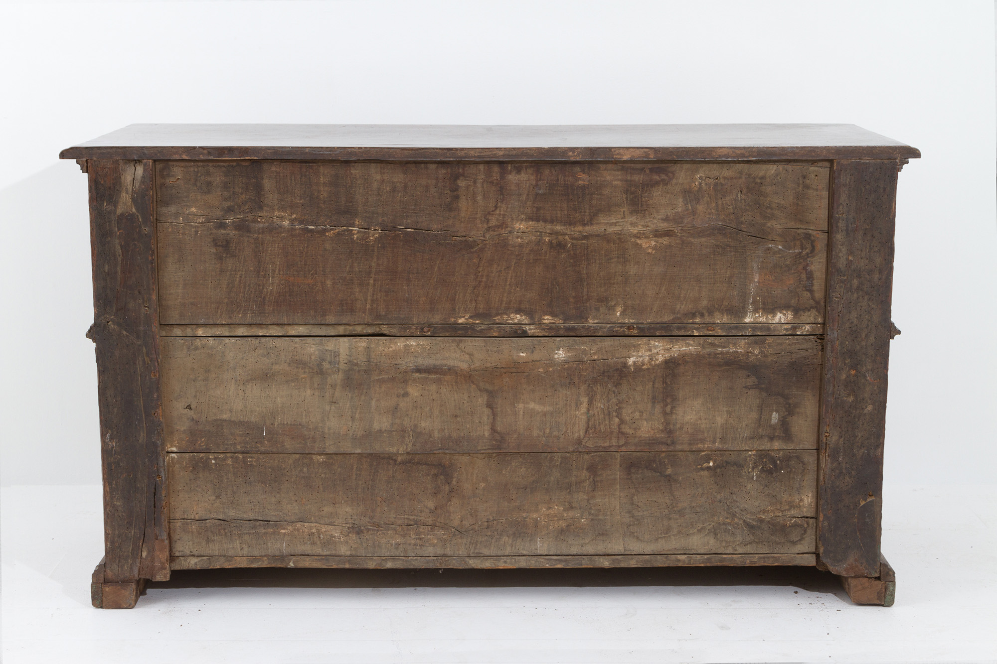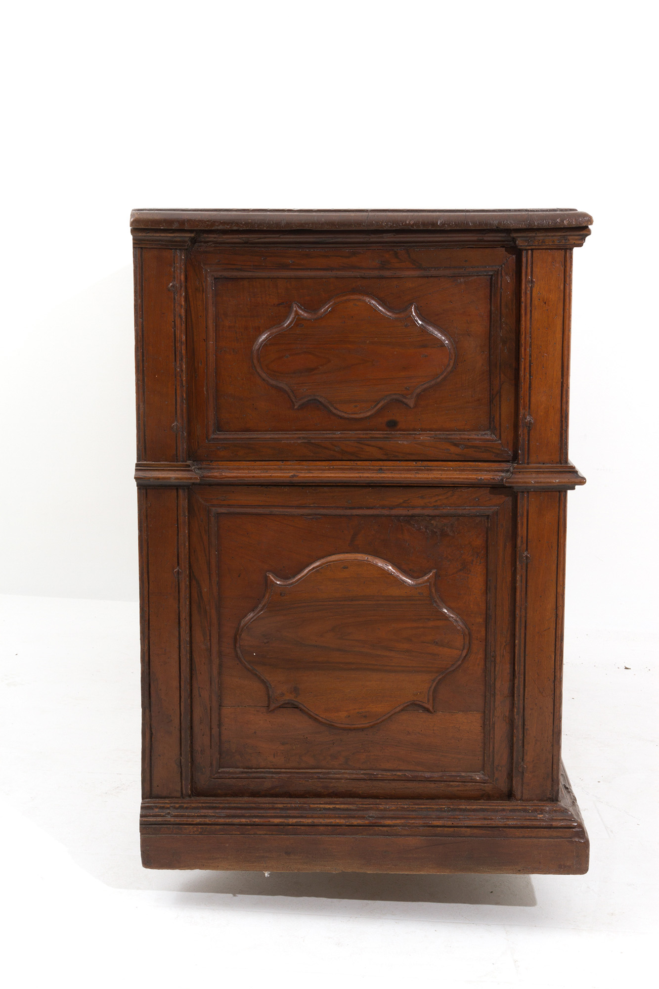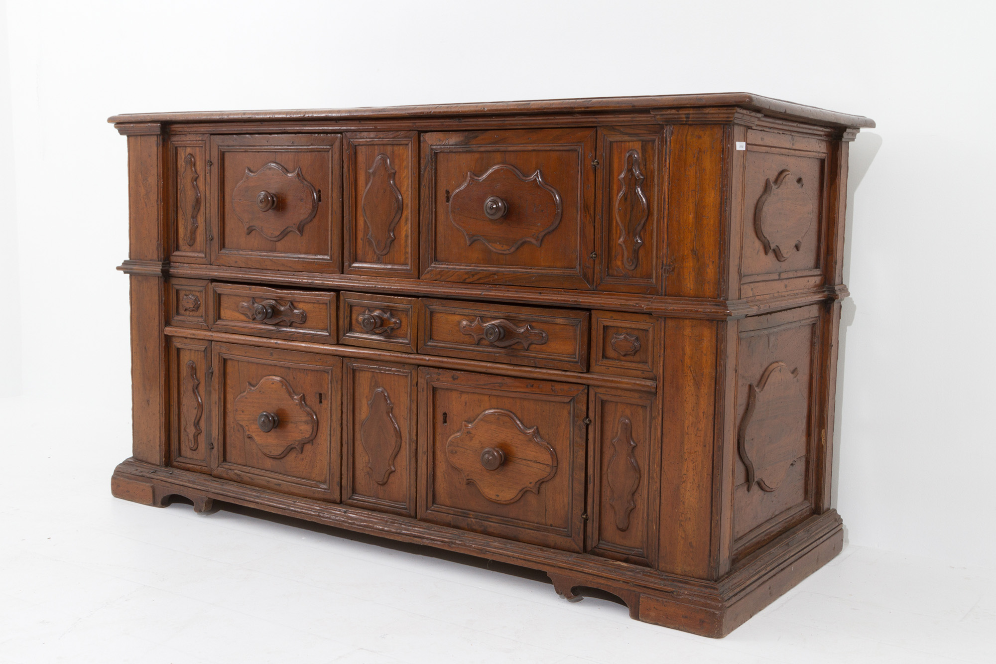 Credenza in noce con formelle sagomate. Lombardia. XVII secolo. Difetti e restauri. Mis. Lung. cm. 176 Alt. cm. 100 Prof. cm. 66.5 ca.