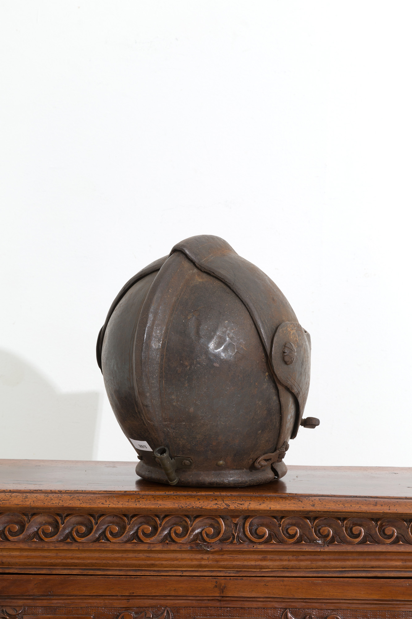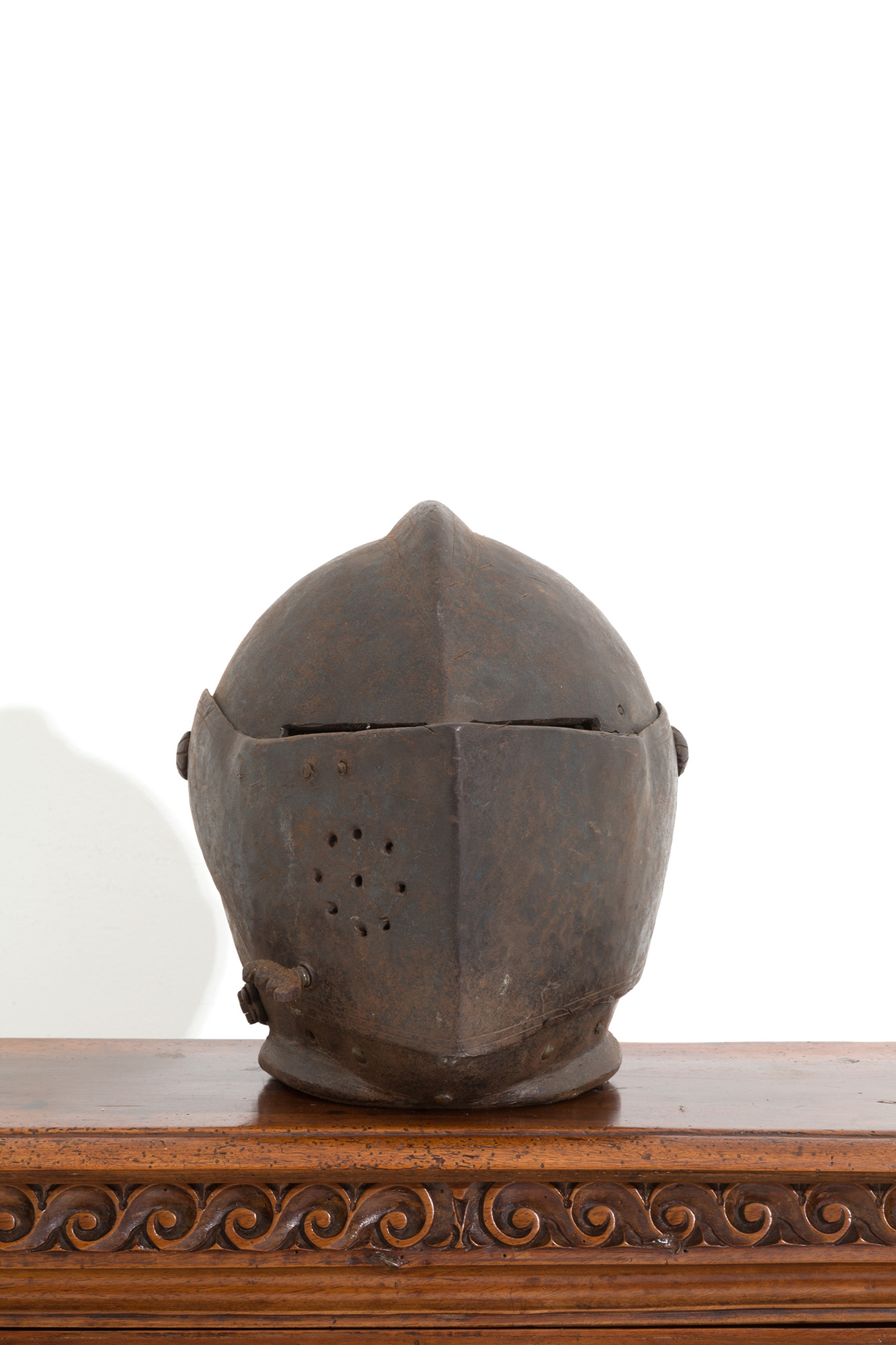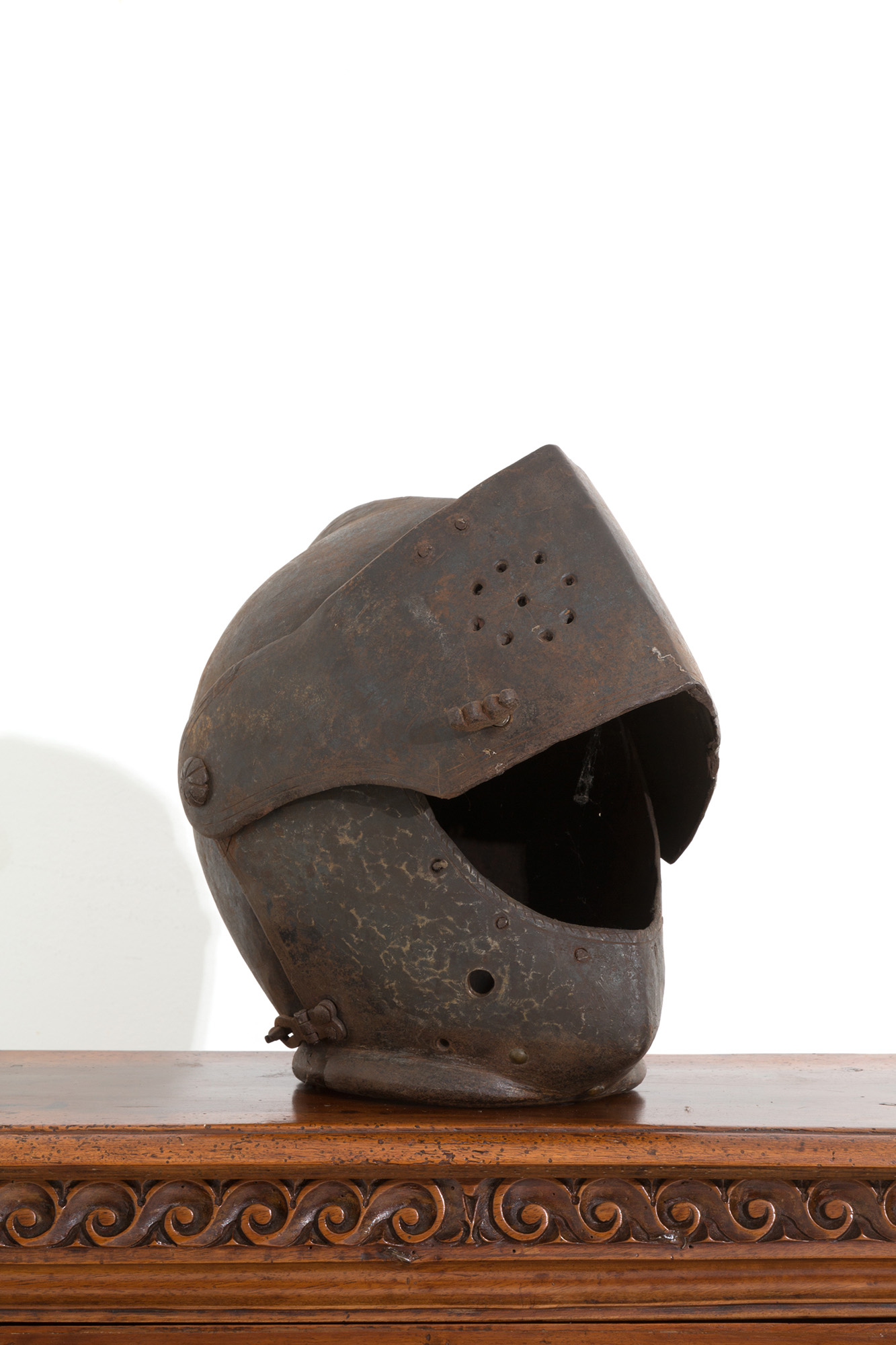 Elmo in ferro battuto con celata. XX secolo. Mis. Lung. cm. 30 Alt. cm. 26 Prof. cm. 34 ca.