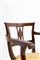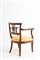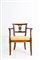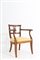 Poltrona in noce con schienale curvo traforato con intarsi in ottone, gambe a sciabola e seduta imbottita. Inizi XIX secolo. Mis. Lung. cm. 56.5 Alt. cm. 80 Prof. cm. 45 ca.