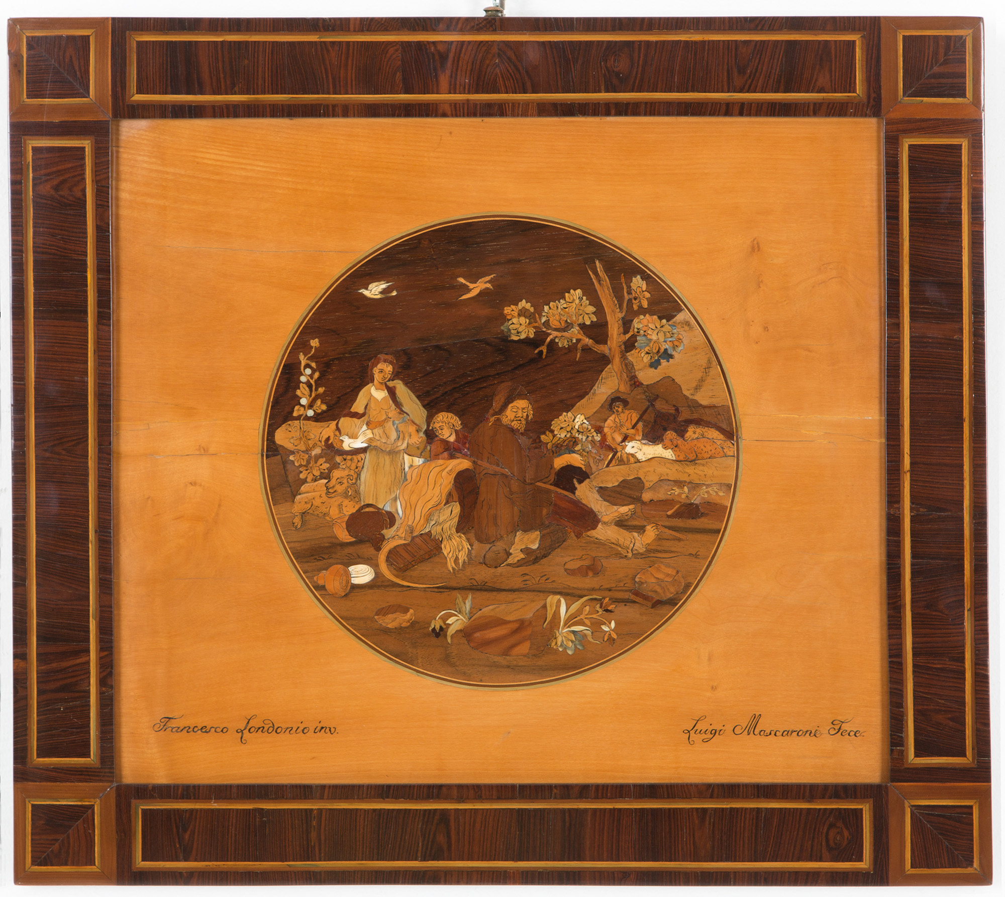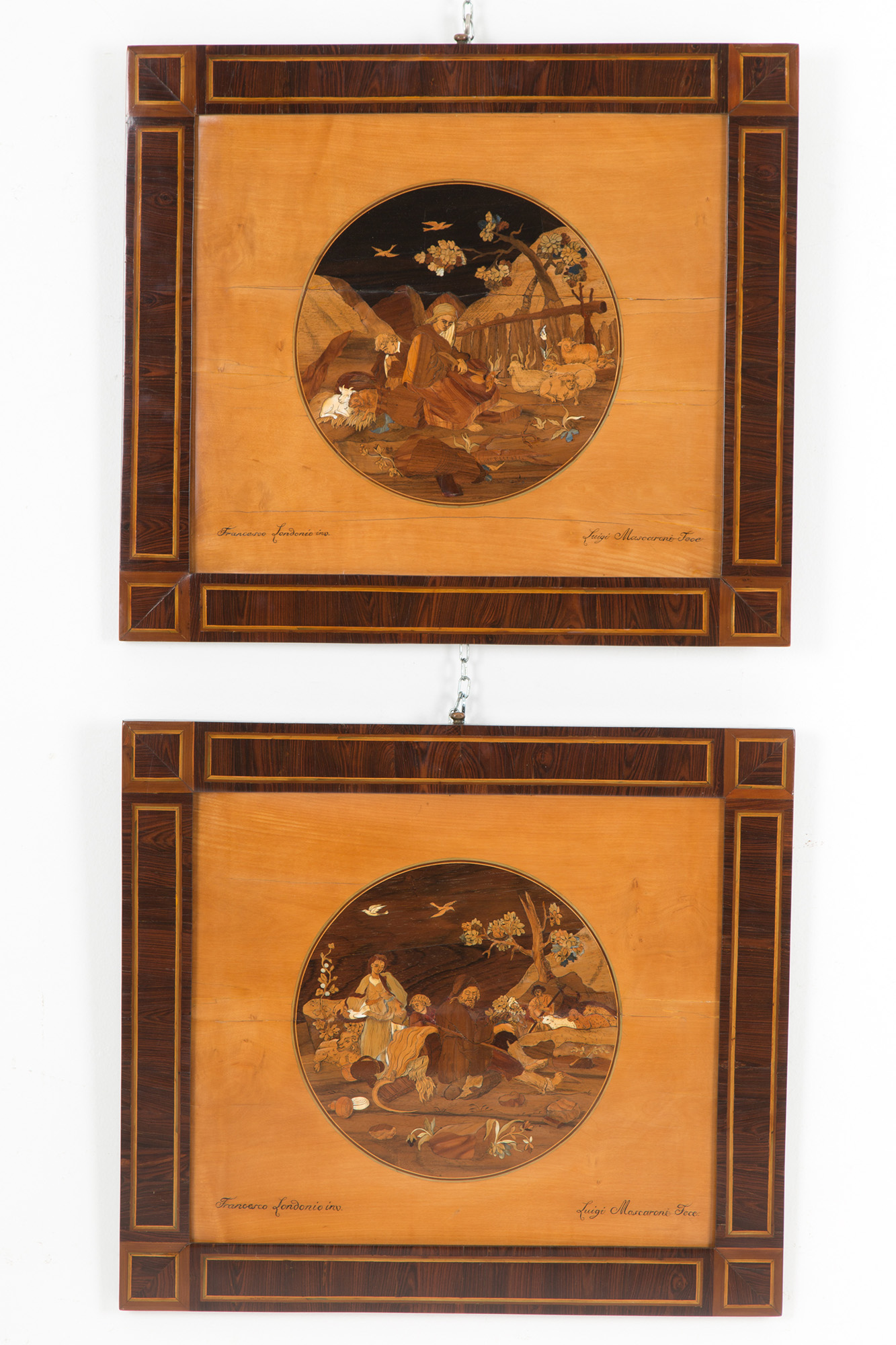 Coppia di pannelli intarsiati in legni pregiati raff. ''SCENE PASTORALI'' tratte da incisioni di Francesco Londonio. Realizzati da LUIGI MASCARONI. Firmati in basso. Periodo Luigi XVI. In cornice coeva. Mis. Lung. cm. 47.5 Alt. cm. 41 ca.