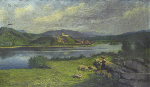 Rocco Ronoletti PAESAGGIO CON PASTORELLA E GREGGE, 1919 Olio su tela, cm. 100x60 Firma e data in basso a destra.
