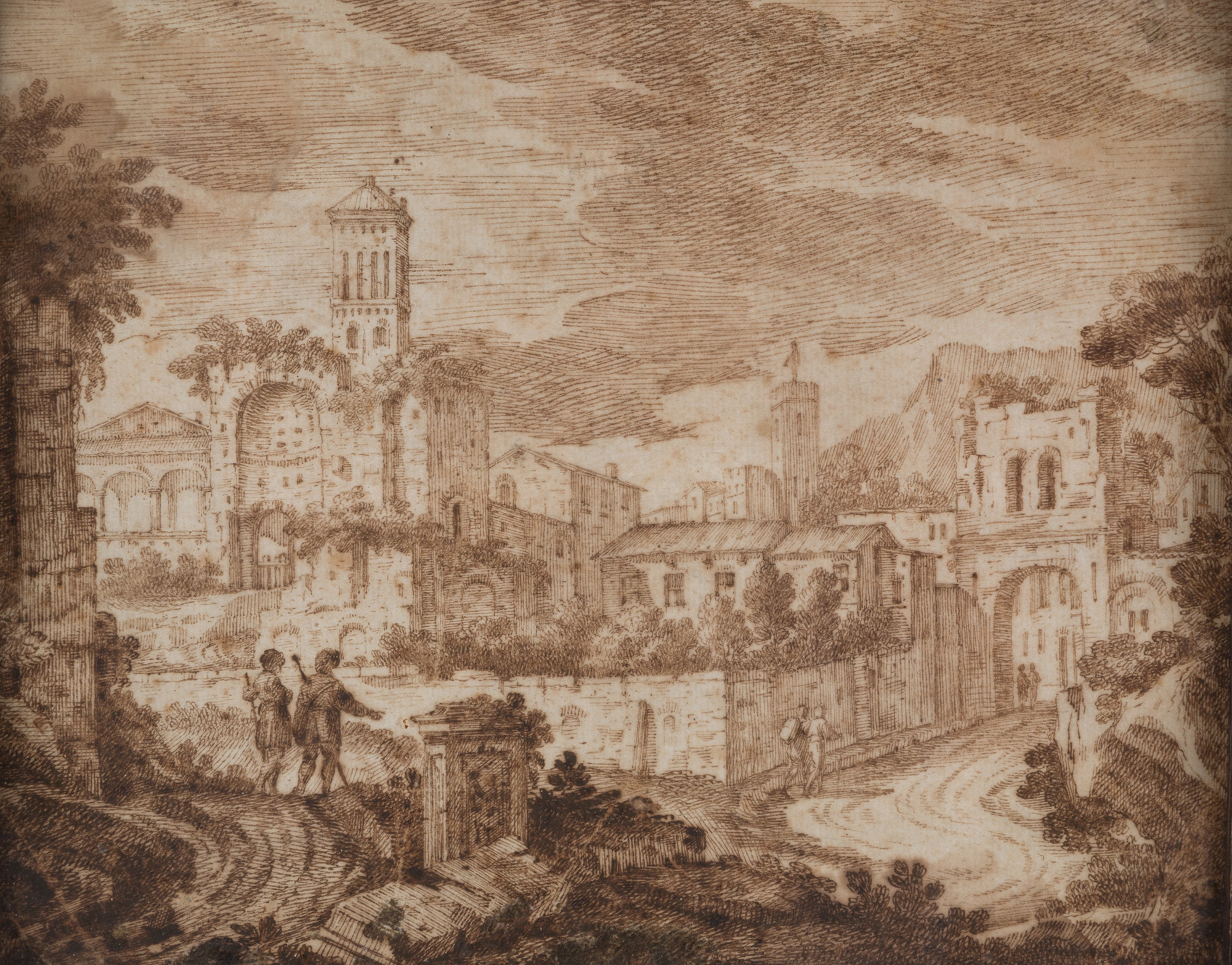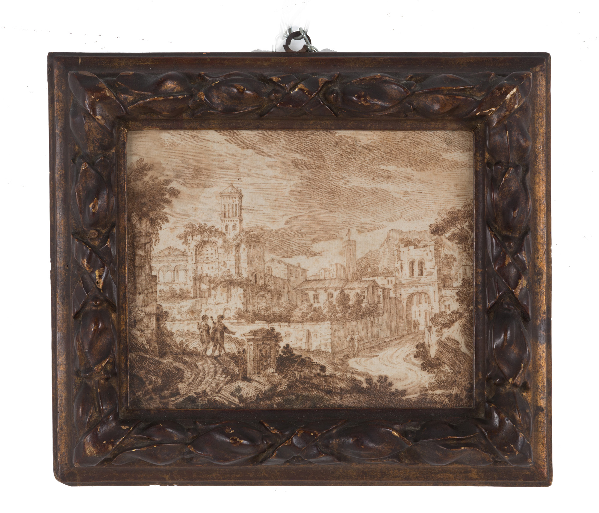 HENDRICK VAN CLEVE III (Attr.) (Anversa, 1525-1589). Disegno su carta raff. ''VEDUTA FANTASTICA DI ROMA''. In cornice coeva. Mis. Lung. cm. 21 Alt. cm. 17 ca.