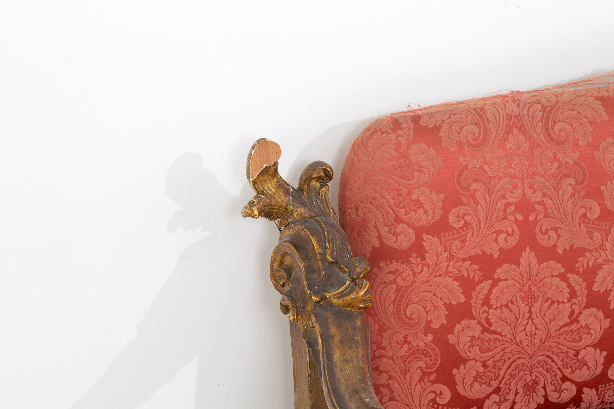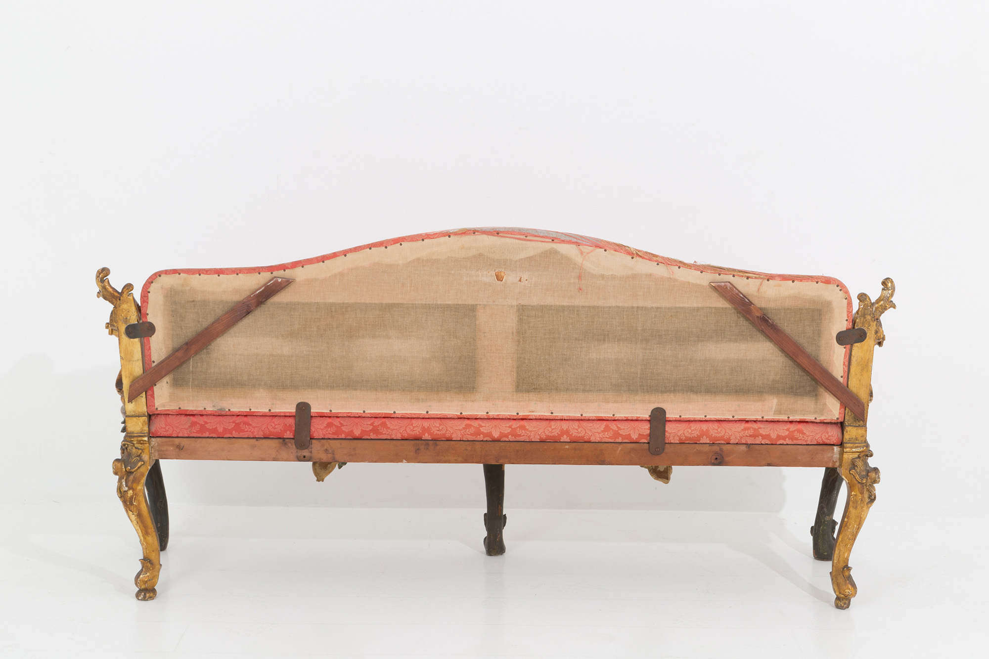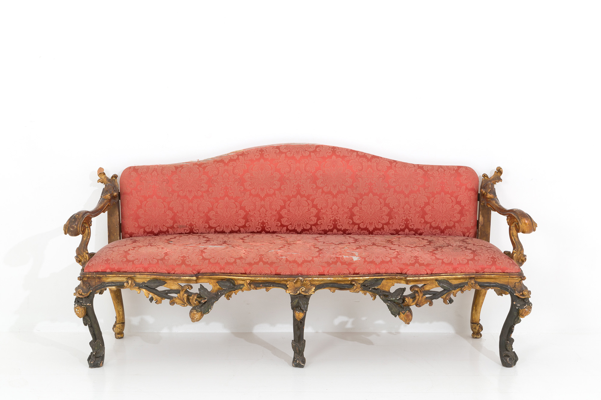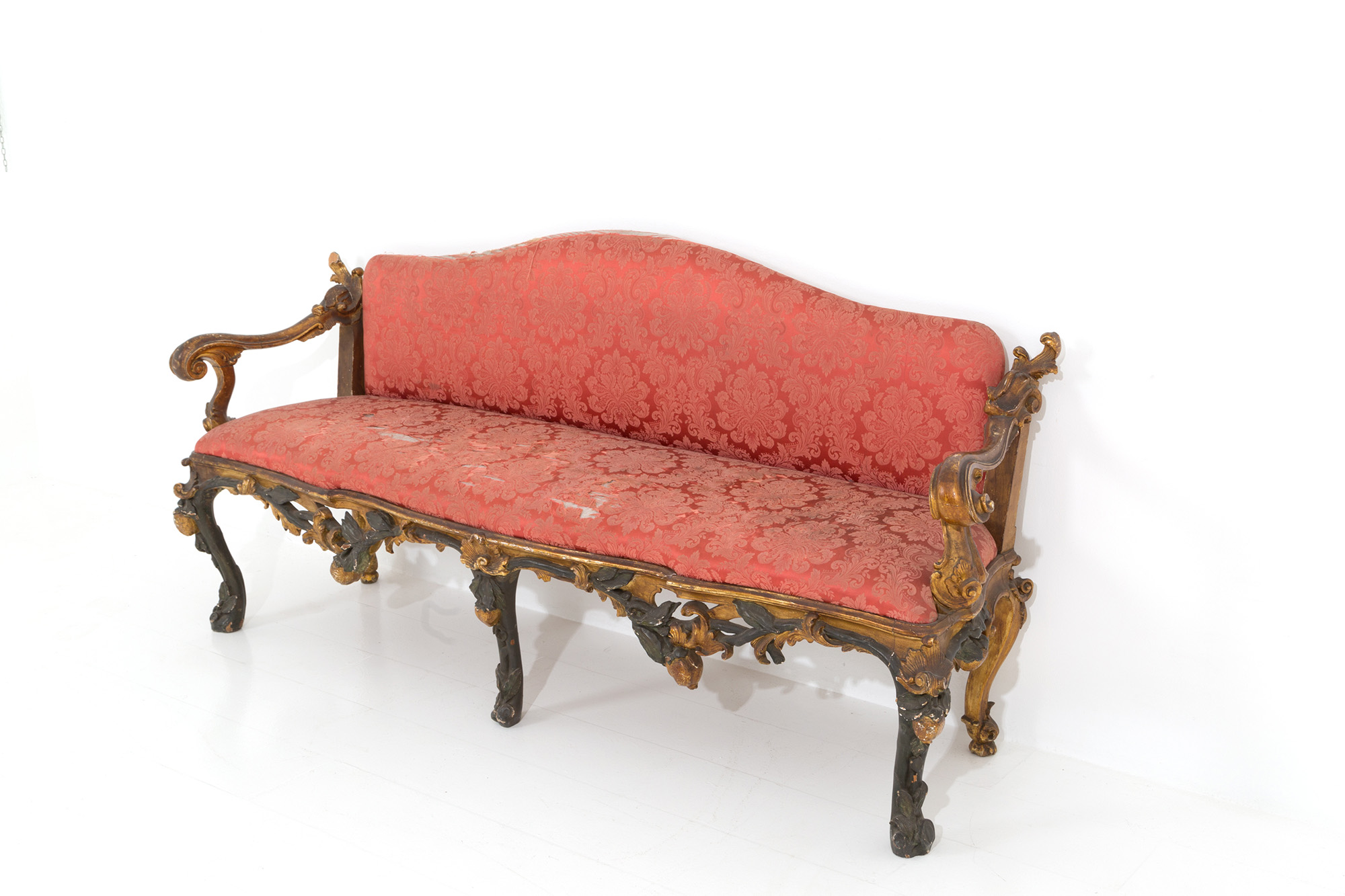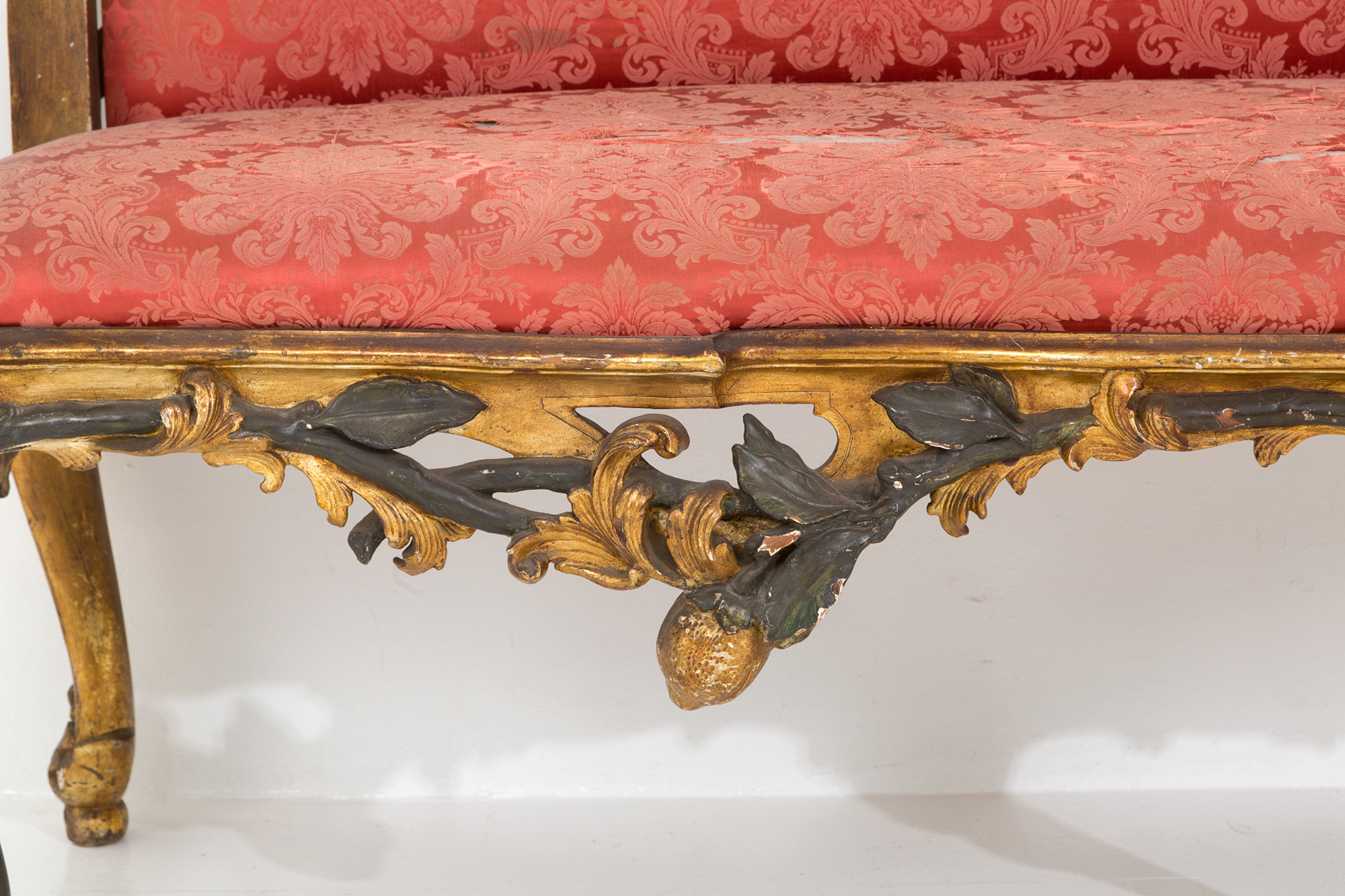 Divanetto in legno finemente intagliato con melograni, laccato e dorato con schienale e seduta imbottiti. Fine XVIII-inizi XIX secolo. Lievi difetti. Mis. Lung. cm. 197 Alt. cm. 90 Prof. cm. 50 ca.