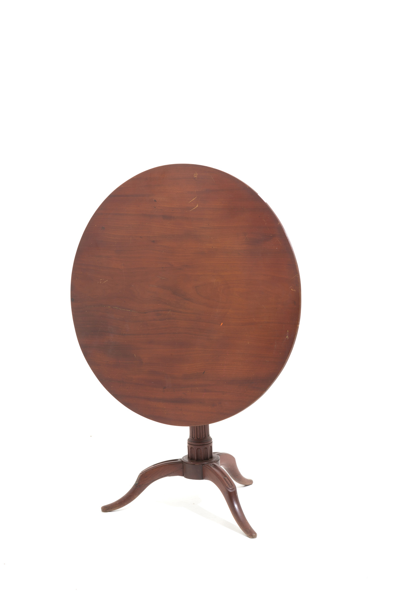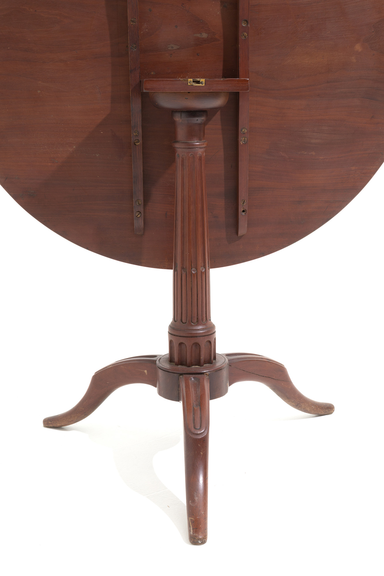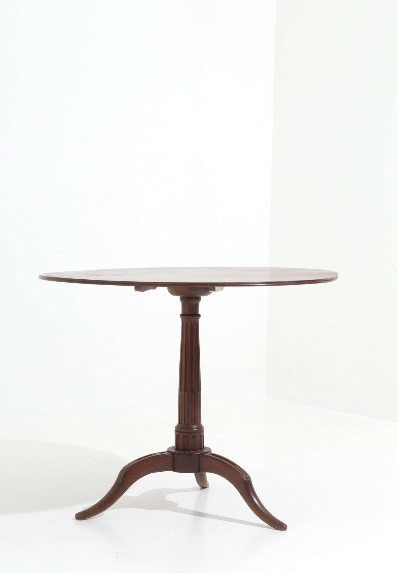 Tavolino rotondo a vela in legno di mogano. Inghilterra. XIX secolo. Difetti. Mis. Alt. cm. 71 Diam. cm. 85.5 ca.