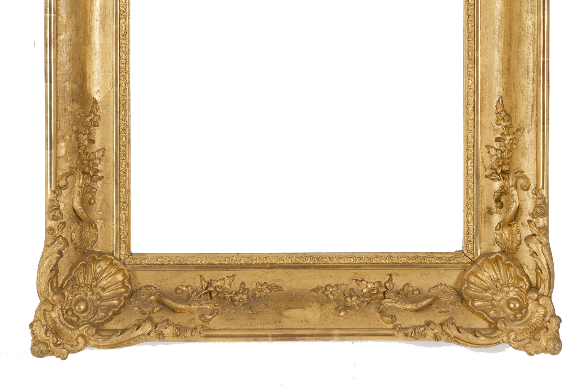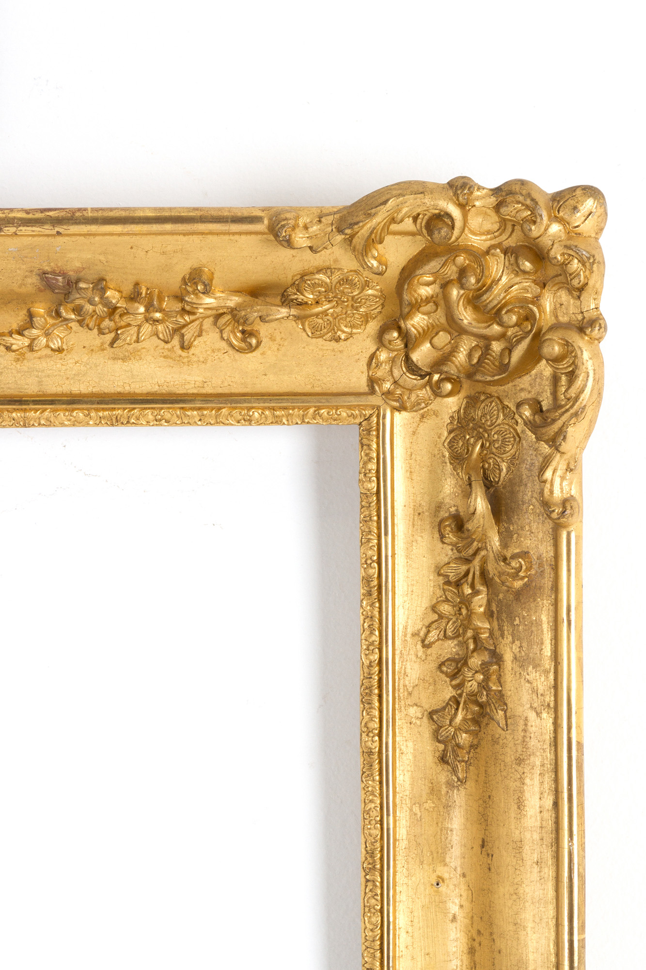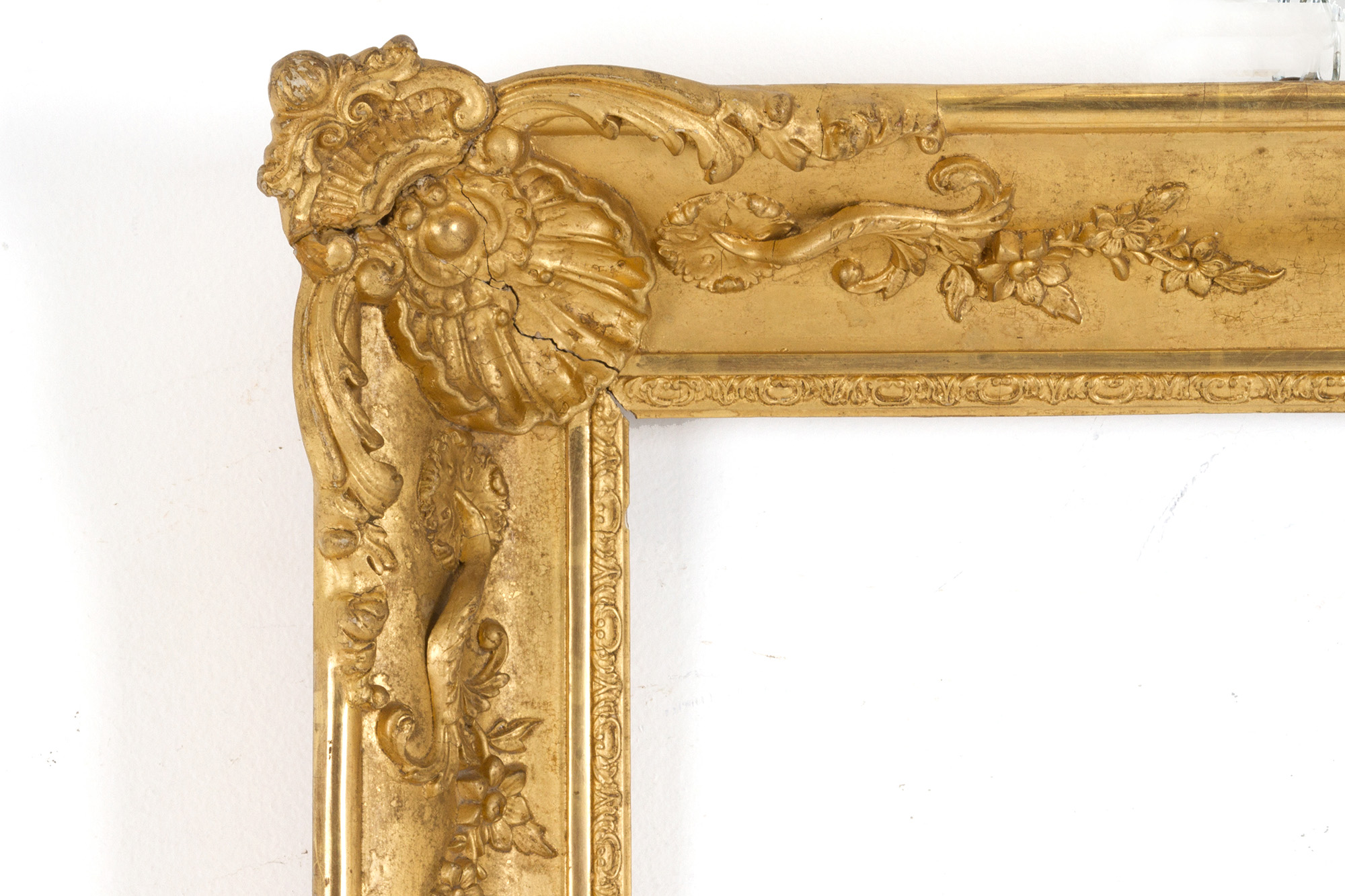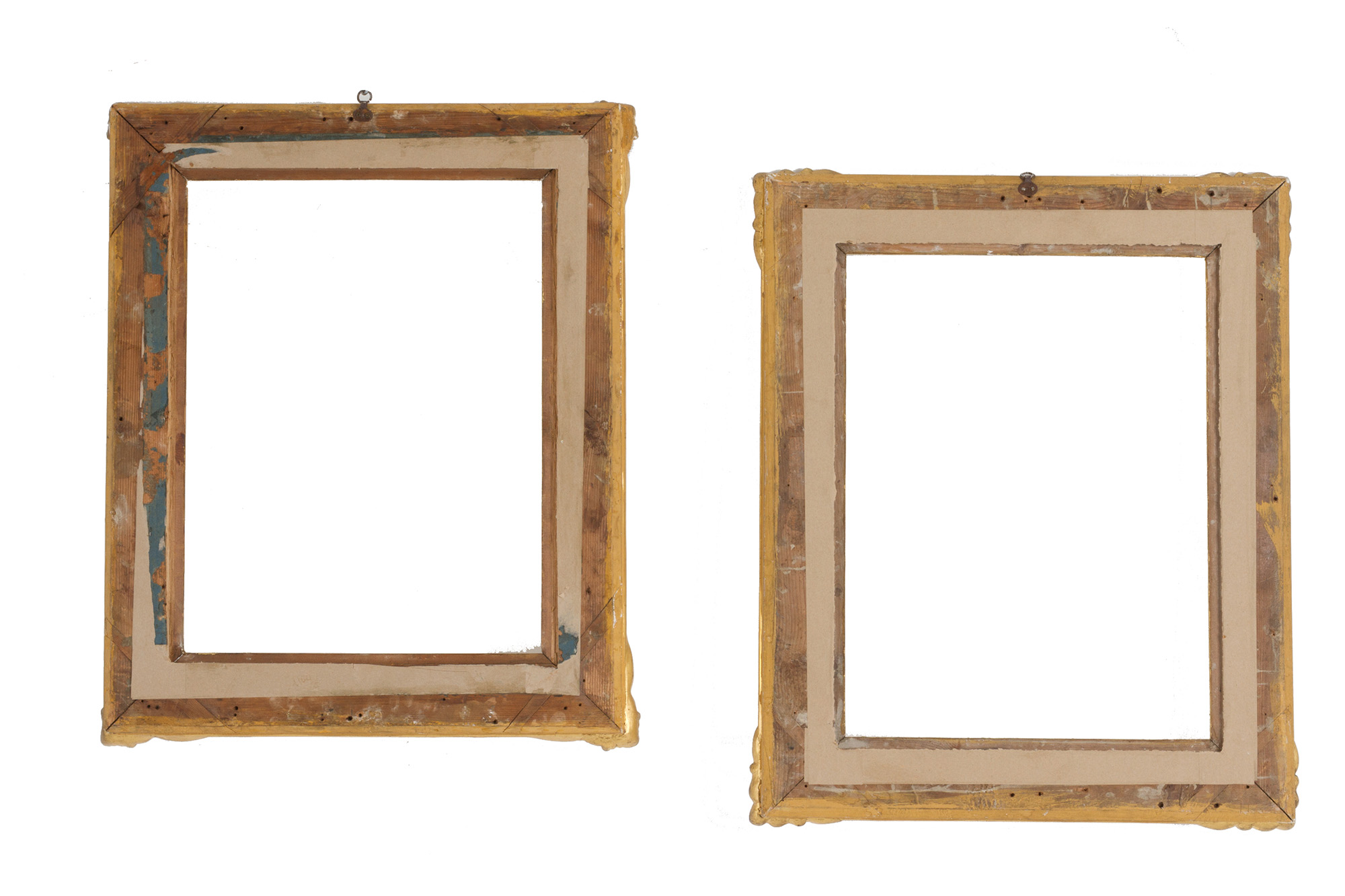 Coppia di cornici in pastiglia dorata. XIX secolo. Mis. interne: Lung. cm. 43 Alt. cm. 57 ca. Mis. esterne: Lung. cm. 62 Alt. cm. 76 ca.