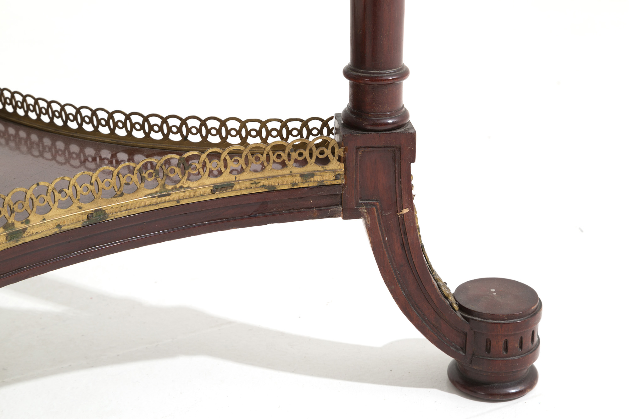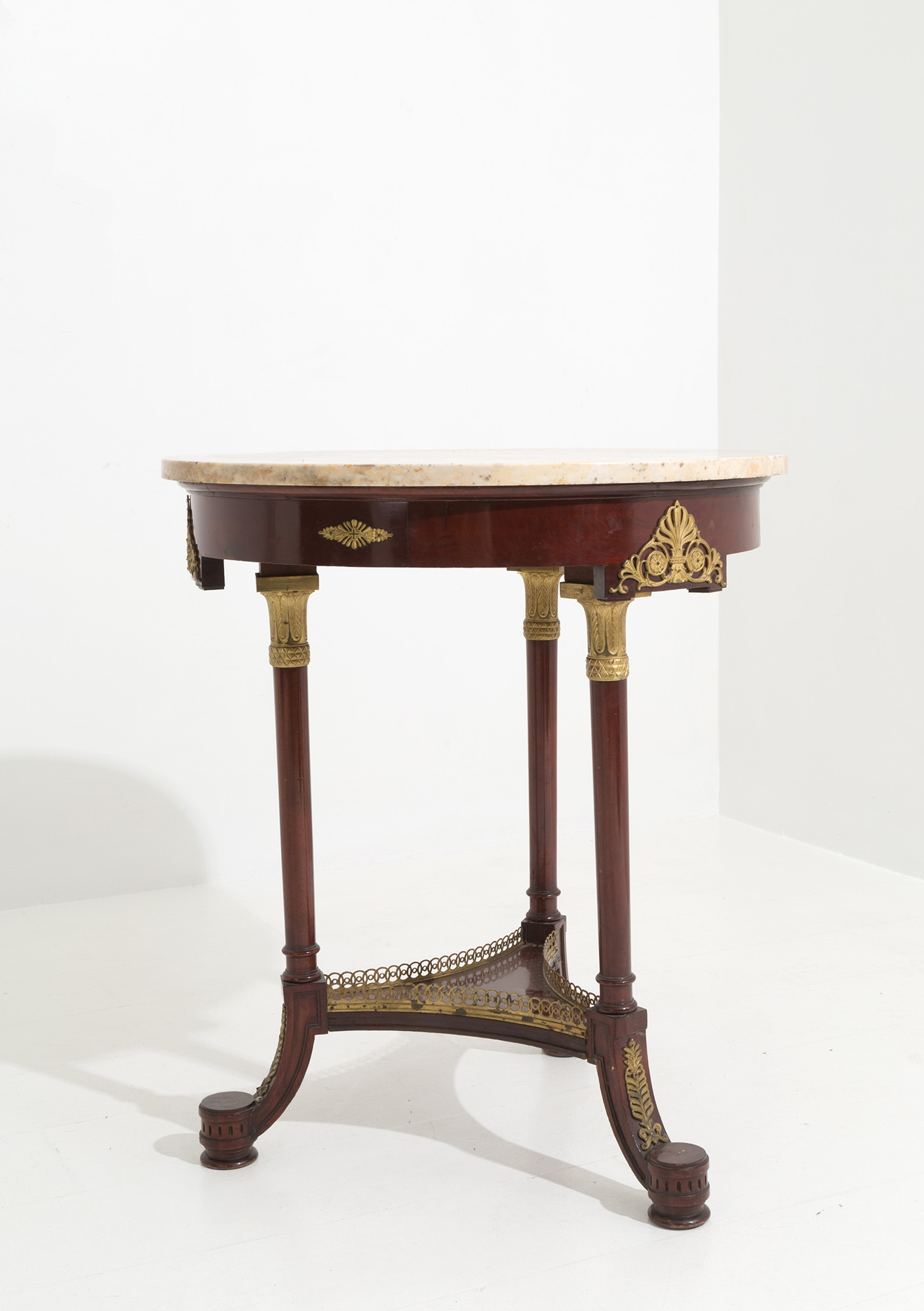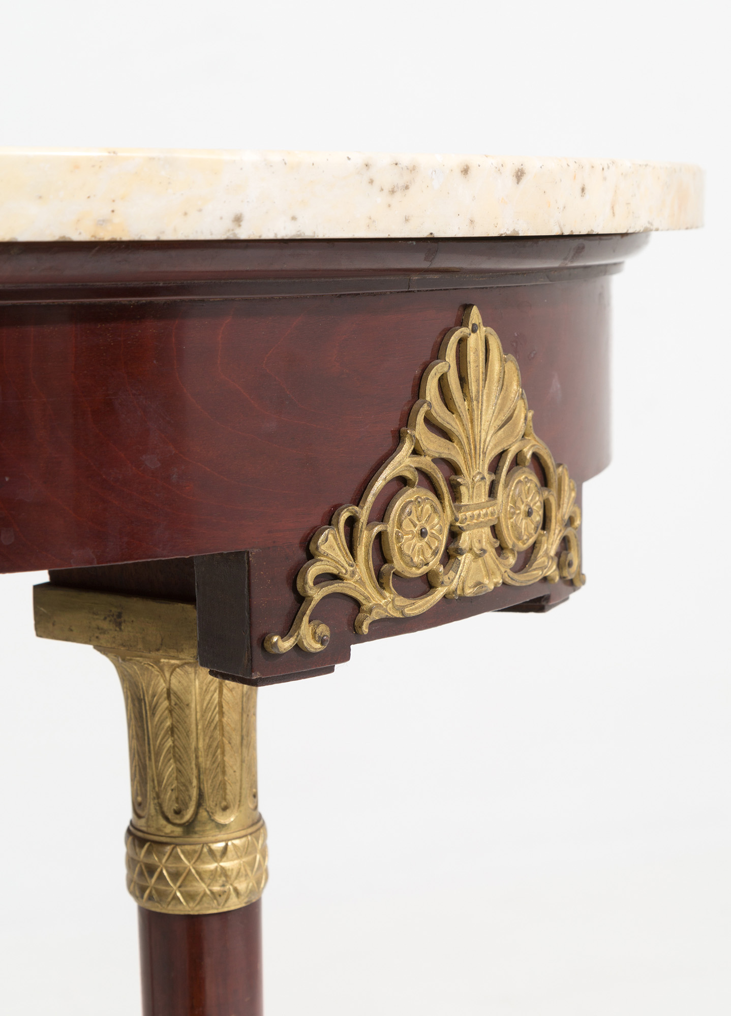 Tavolino rotondo in legno in mogano con finiture in bronzo finemente cesellato e dorato al mercurio e piano in marmo. Francia. Periodo Impero. Mis. Alt. cm. 76.5 Diam. cm. 27 ca.
