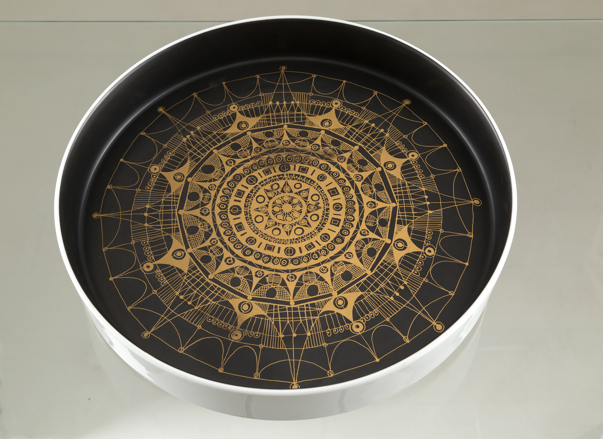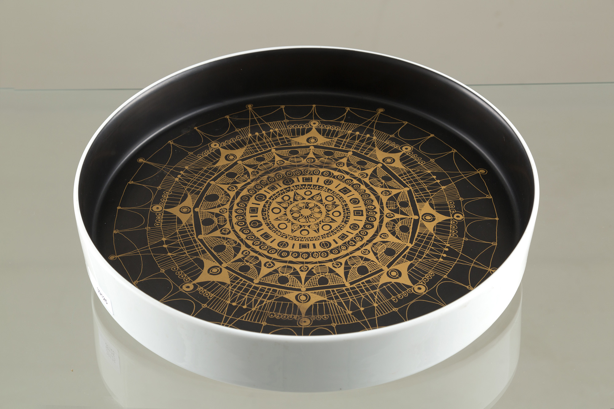 HANS THEO BAUMANN (Basilea, 1924 - Schopfheim, 2016) per ROSENTHAL, STUDIO LINIE. Centrotavola rotondo in ceramica dipinta a motivi geometrici nei toni del nero e dell'oro. Firmato e marcato sul fondo. Anni '60. Difetti. Mis. Alt. cm. 5 Diam. cm. 32 ca.