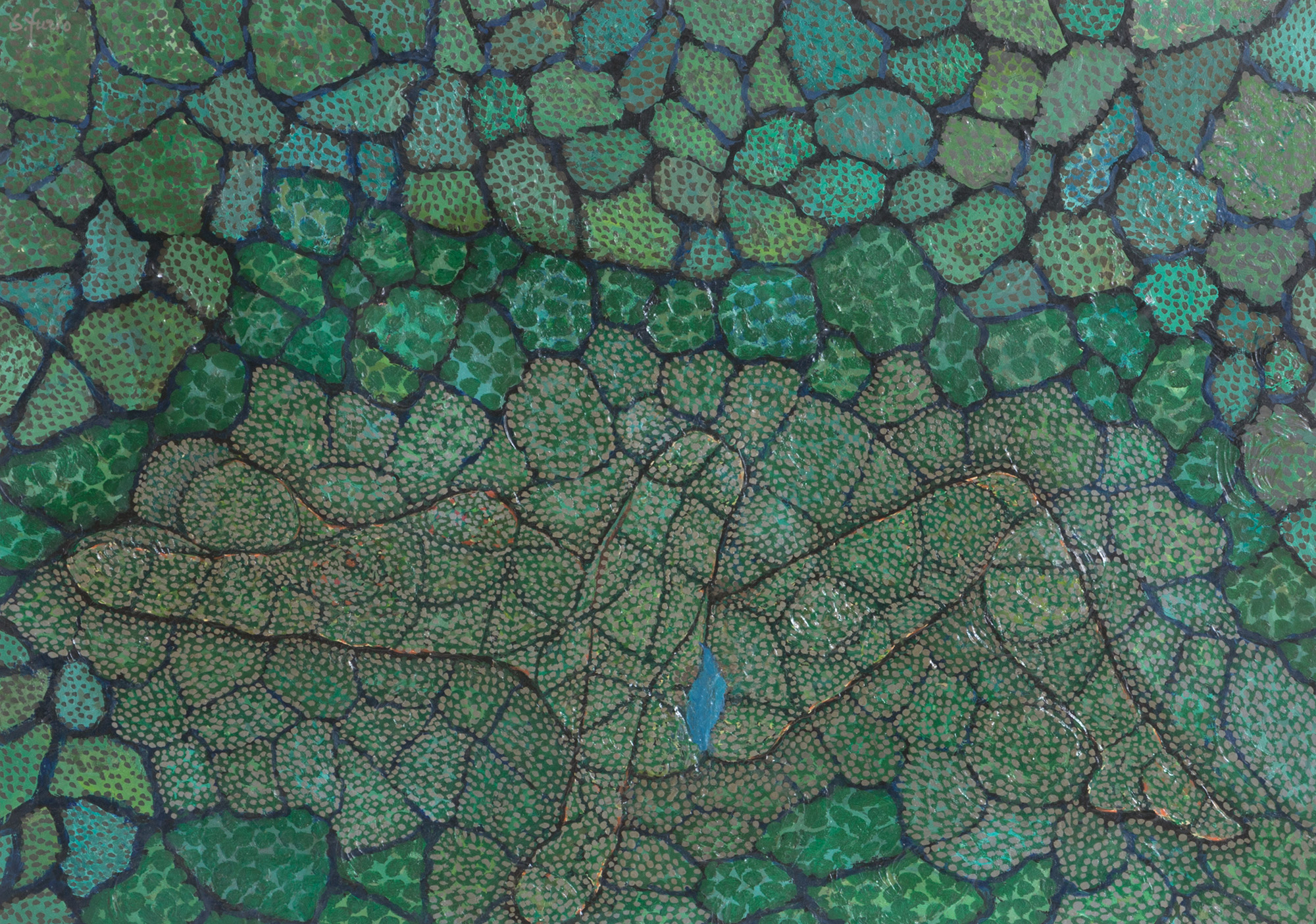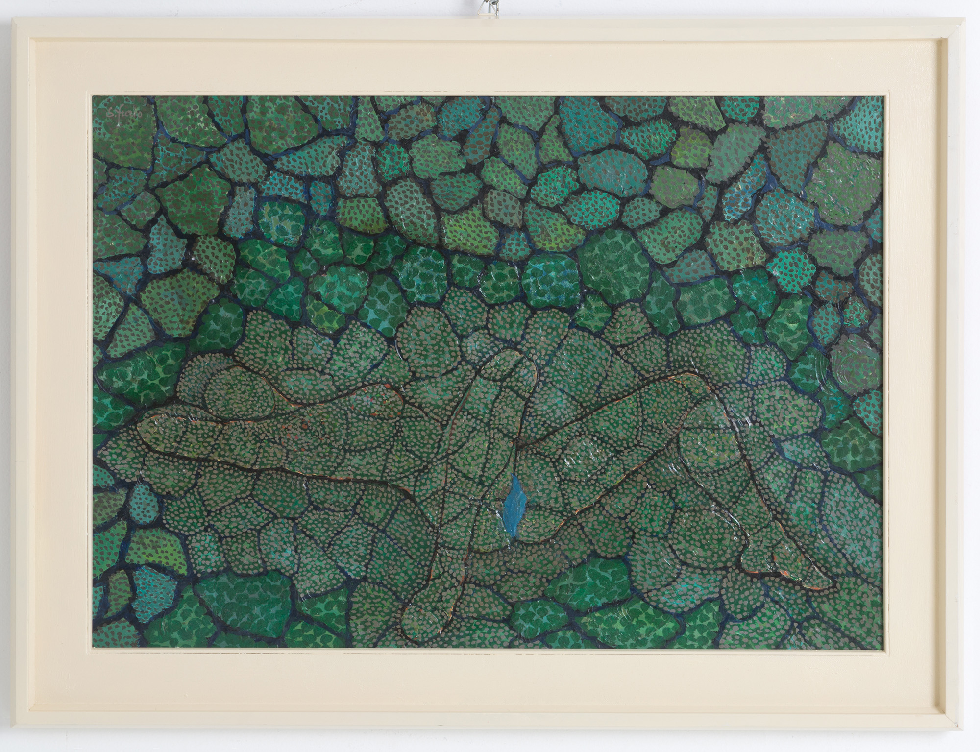 FURIO SANTINI detto SANFURIO (Cortona, 1947 - Milano, 2004). Dipinto olio su masonite raff. ''SOGGETTO INFORMALE''. Firmato in alto a sinistra. In cornice. Mis. Lung. cm. 70 Alt. cm. 51 ca.