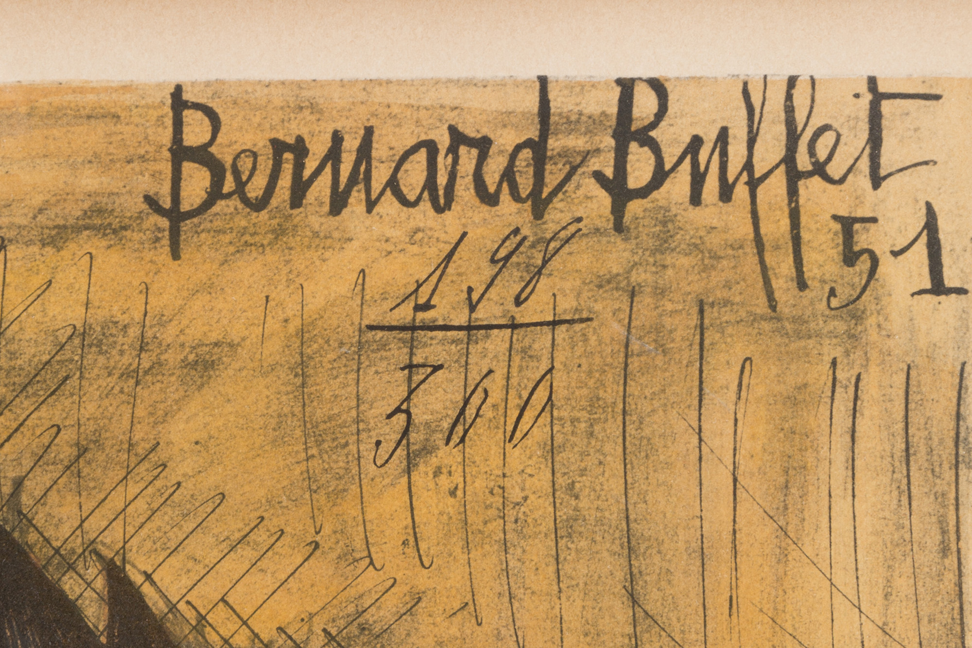 BERNARD BUFFET (Parigi, 1928 - Tourtour, 1999). Litografia su carta raff. ''GALLO''. 1951. Esemplare 198/300. In cornice. Mis. Lung. cm. 48 Alt. cm. 60 ca.
