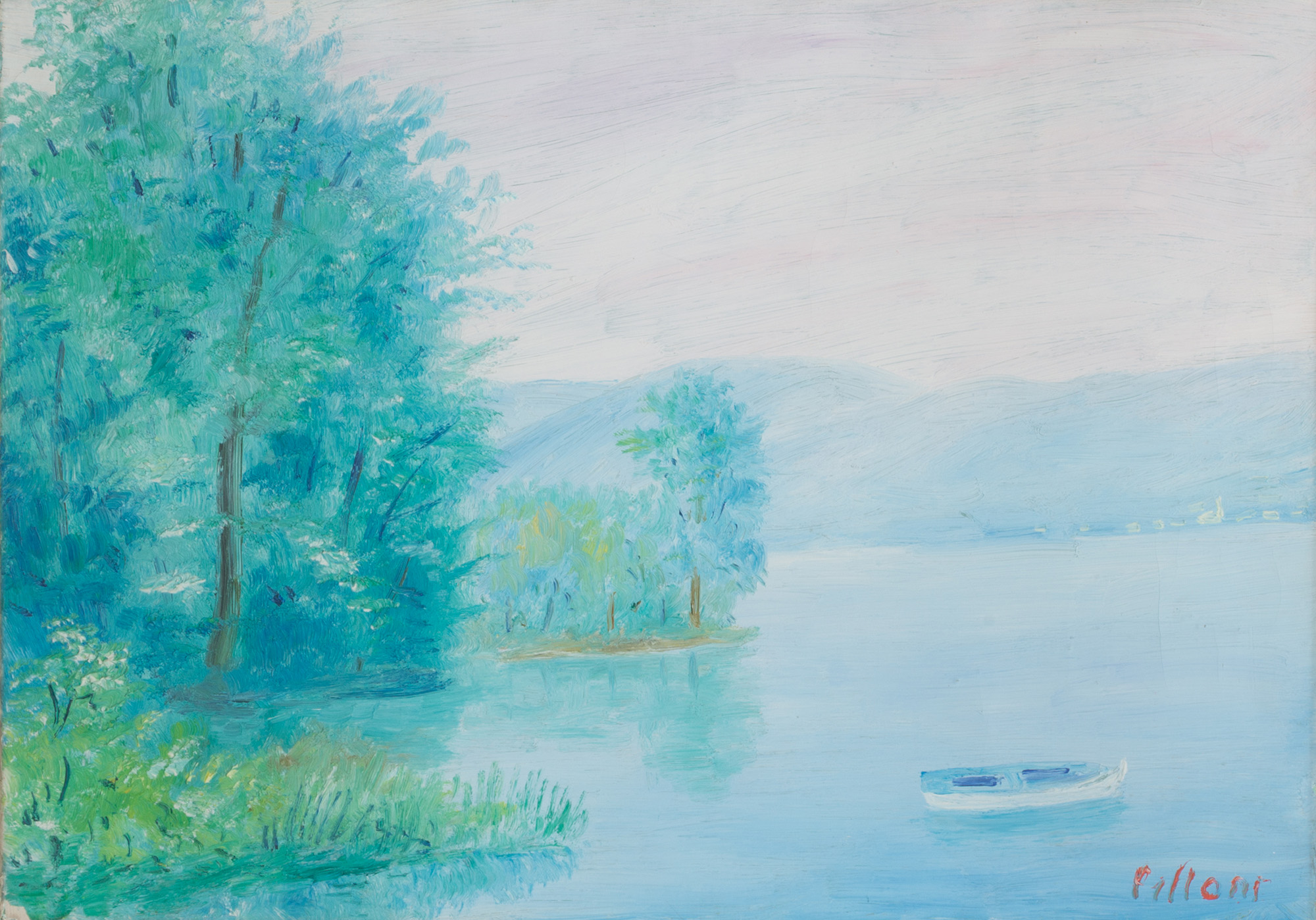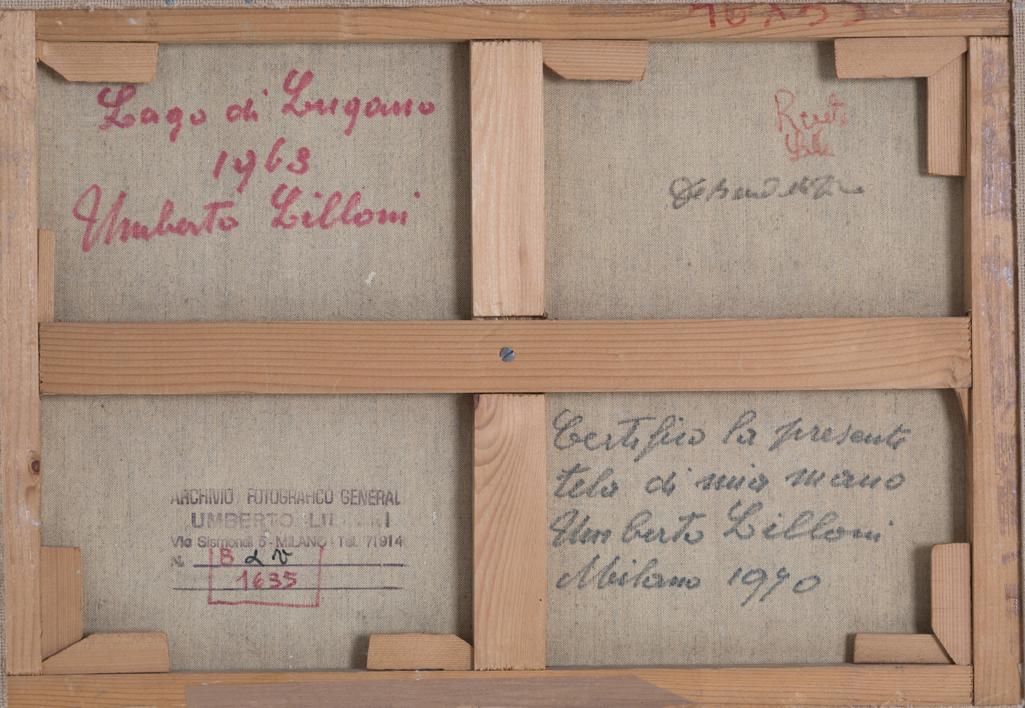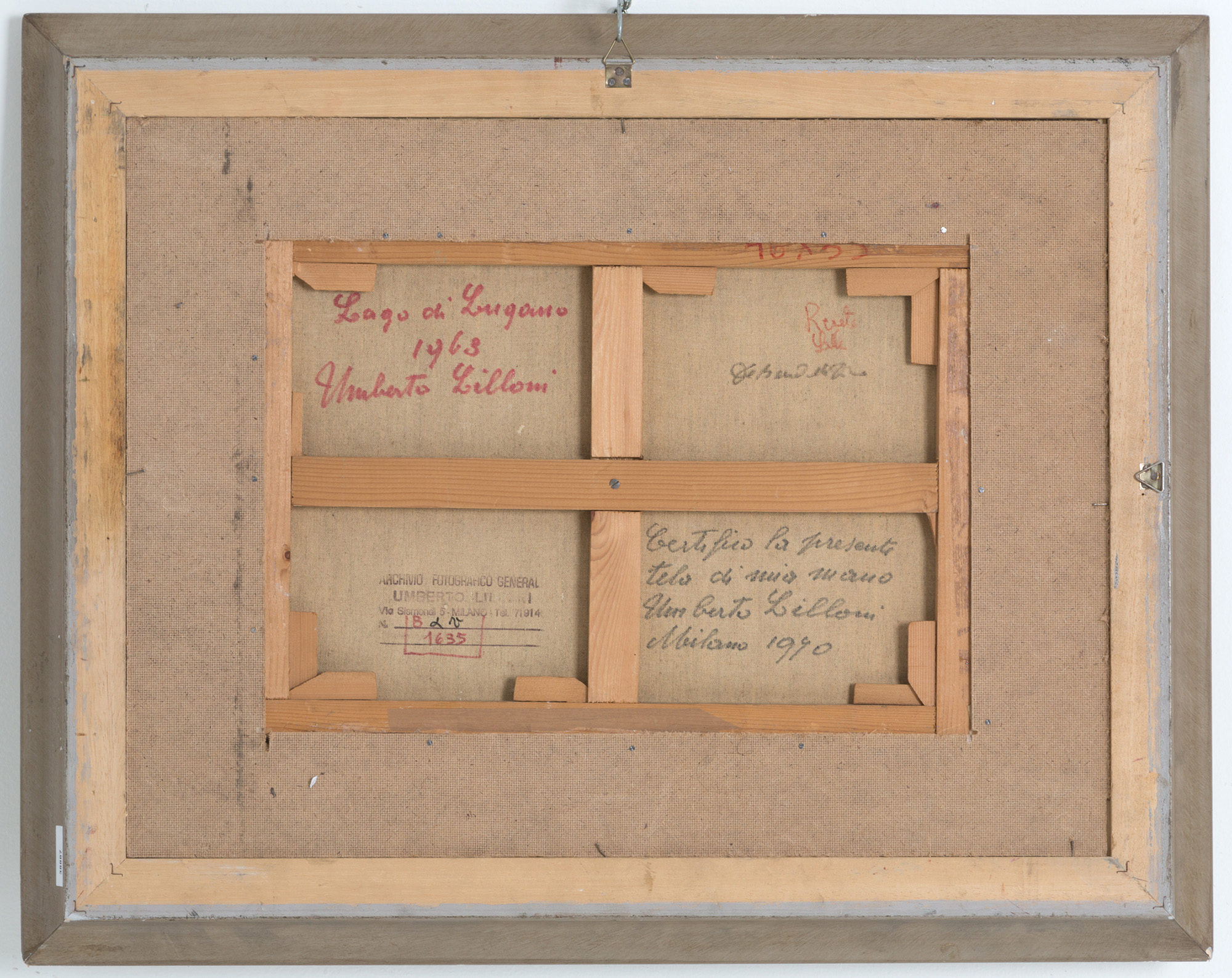 UMBERTO LILLONI (Milano, 1898-1980). Dipinto olio su tela intitolato ''LAGO DI LUGANO''. Firmato in basso a destra. Intitolato, controfirmato, datato 1969, con timbo dell'Archivio Fotografico Generale Umberto Lilloni n. B L V 1635 e autentica dell'artista sul reto. In cornice. Mis. Lung. cm. 46 Alt. cm. 33 ca.