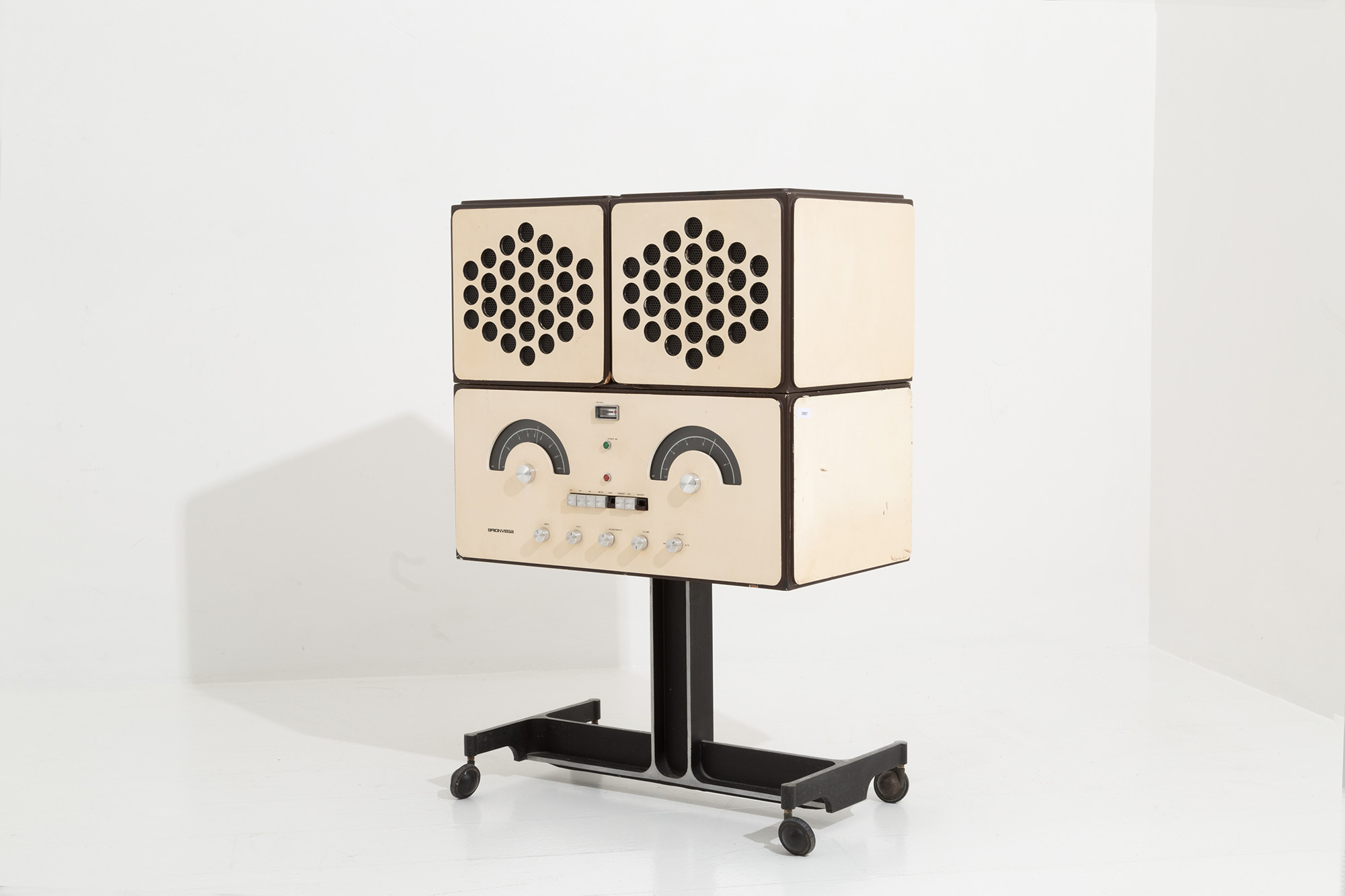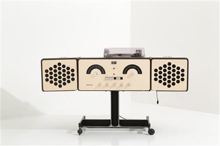 ACHILLE (Milano 1918-2002) e PIER GIACOMO (Milano, 1913-1968) CASTIGLIONI. Radiofonografo Brionvega RR126 con scocca in legno laccato bianco, casse modulari asportabili e sostegno a rotelle in alluminio. Anni '70. Difetti e mancanze. Non funzionante. Da revisionare. Misure cm. 92x62x37 ca. chiuso e cm. 75x124x37 ca. aperto.