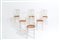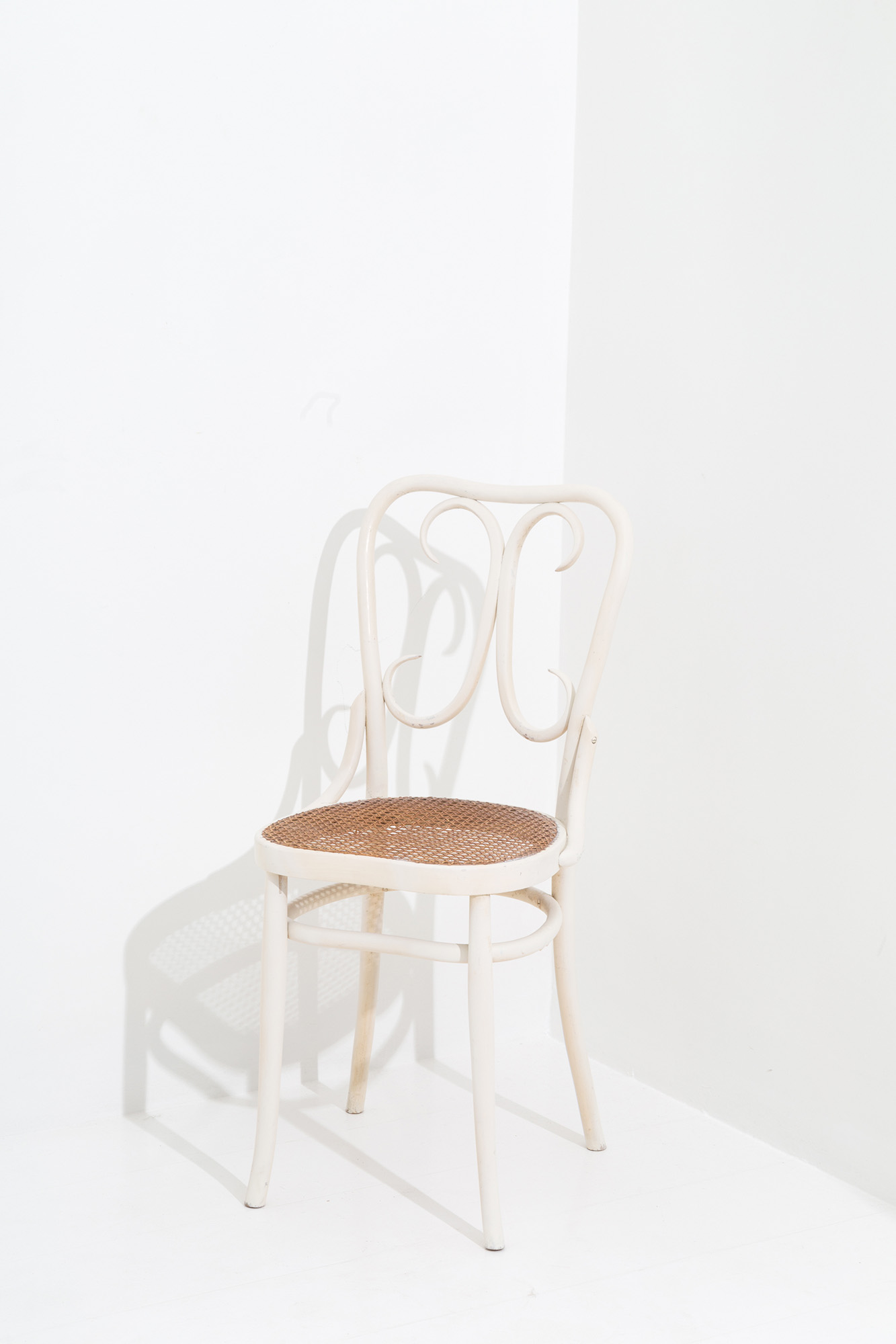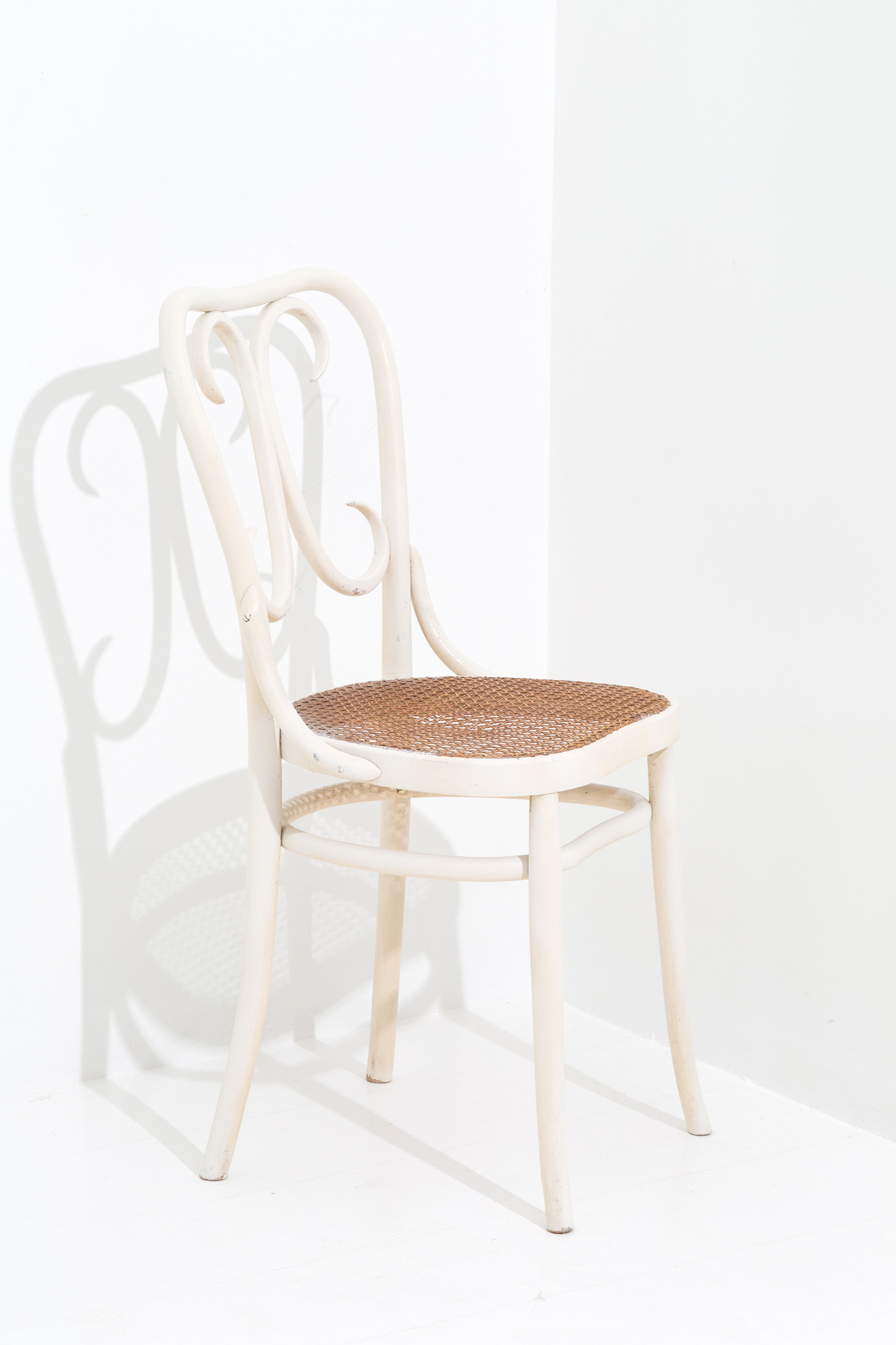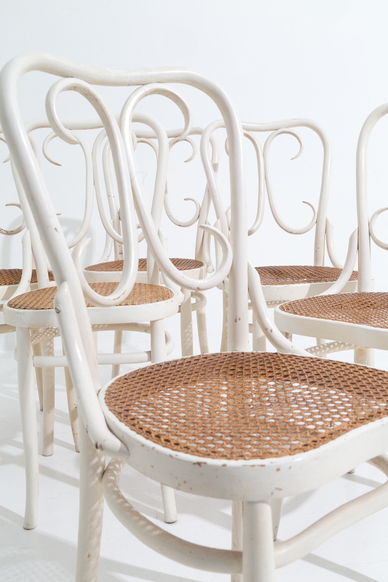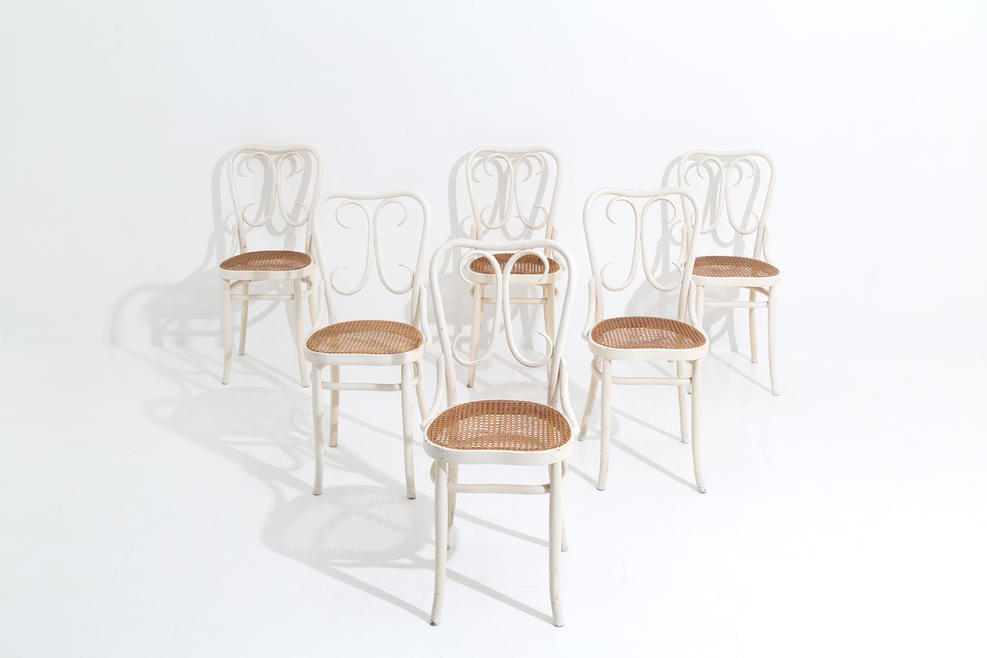 Sei sedie in legno laccato bianco con seduta in paglia. Vienna. Inizi XX secolo. Segni di usura. Pubblicate in Domus n. 427, giugno 1965 e in Antonello Mosca (a cura di), Casa Amica, Le Belle Case di Campagna, secondo inserto. Mis. Lung. cm. 40 Alt. cm. 88 Prof. cm. 40 ca.