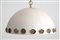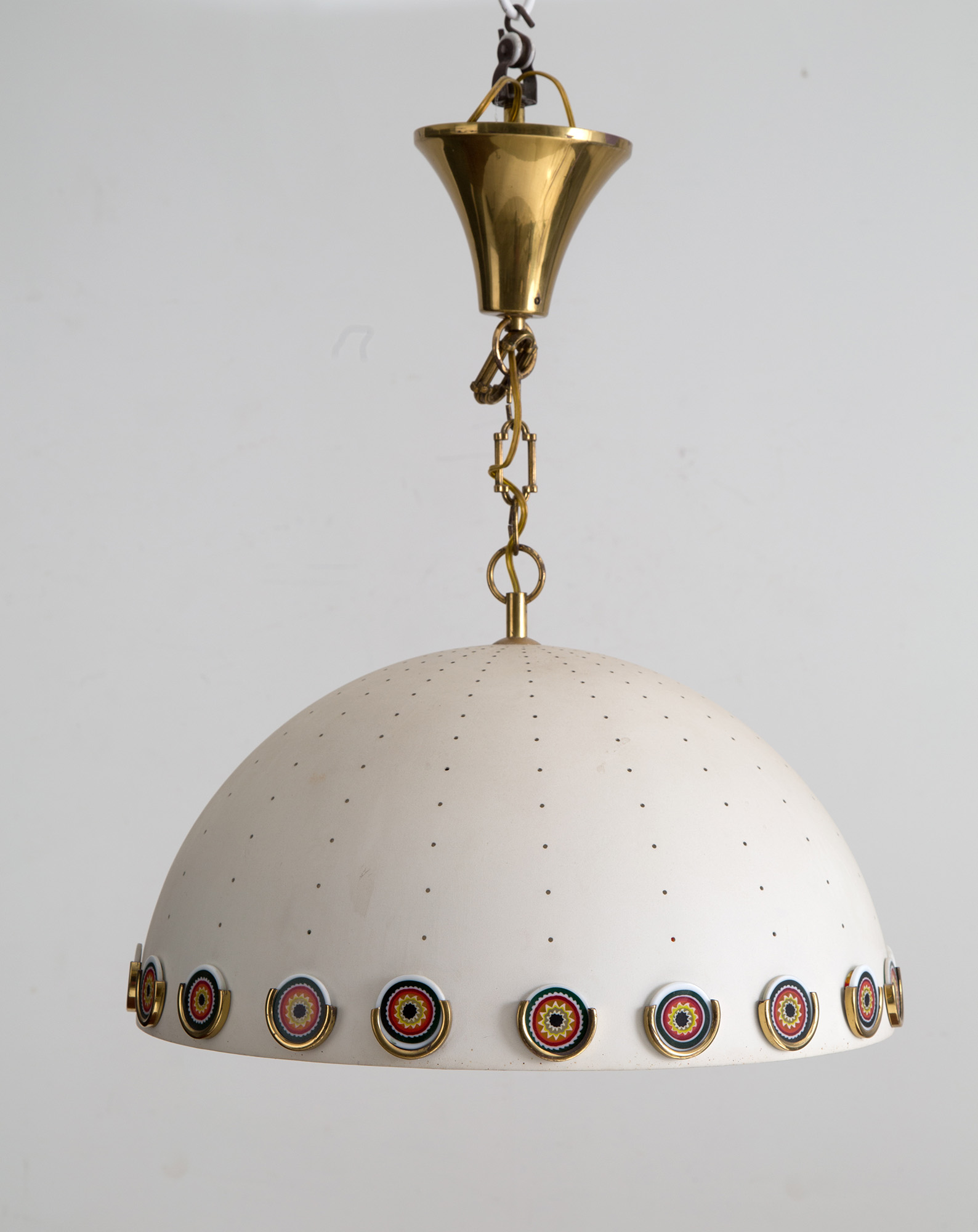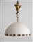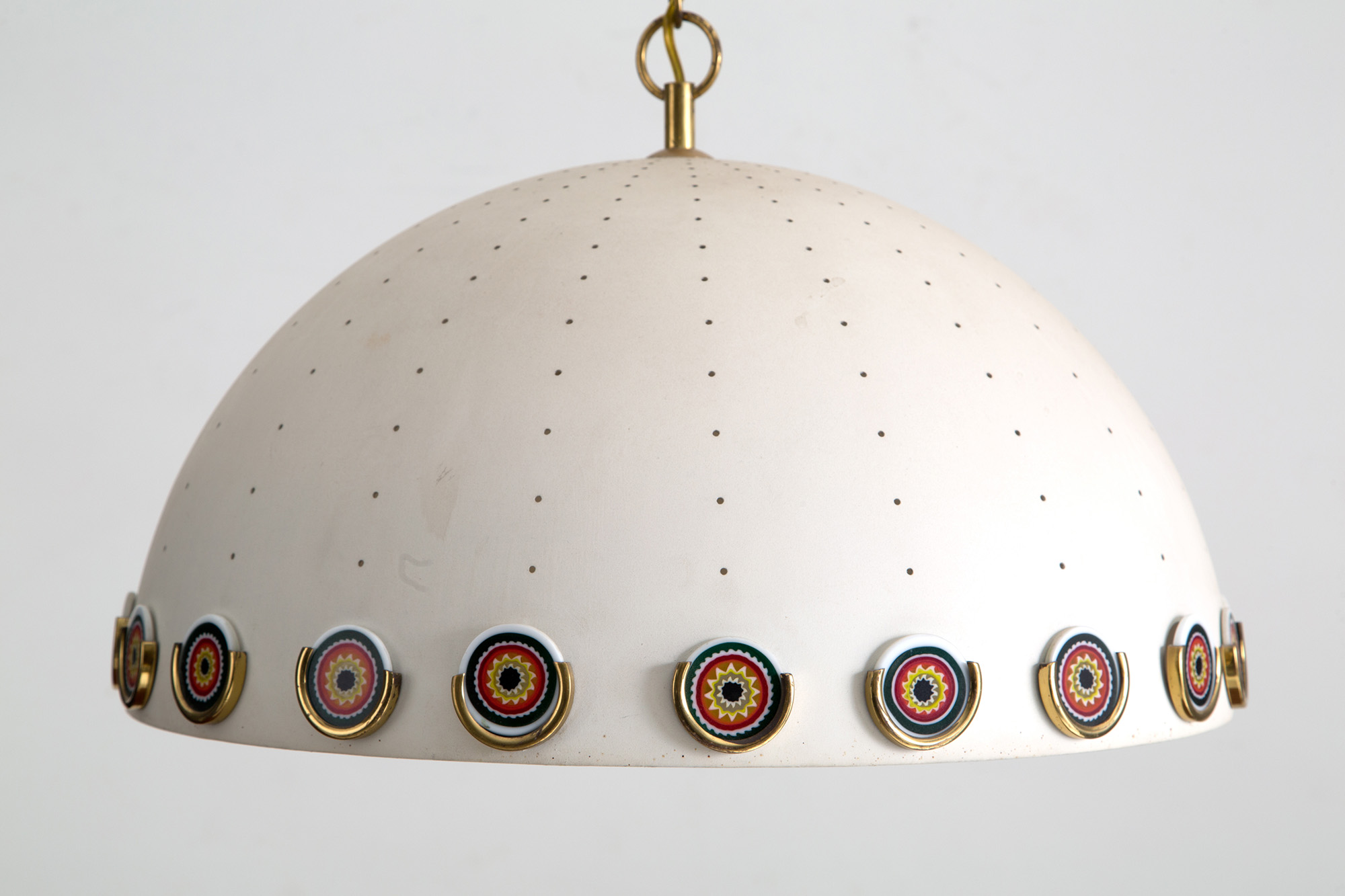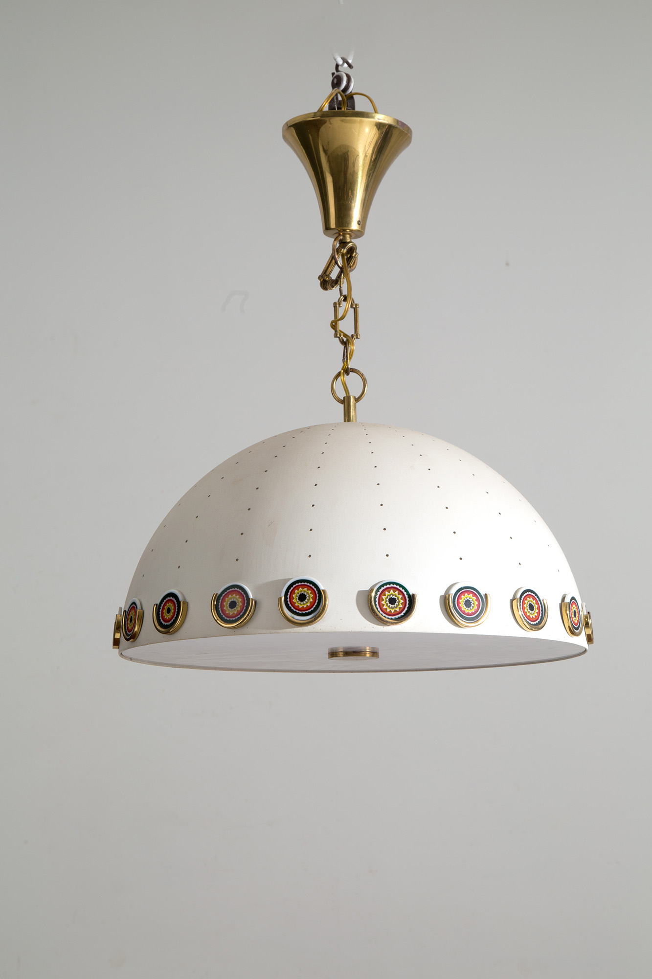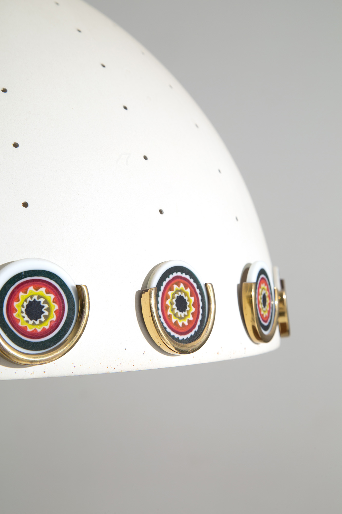 Lampadario in metallo verniciato bianco satinato con murrine e fondo in vetro. Manifattura italiana. Anni '70-'80. Mis. Alt. cm. 60 Diam. cm. 48 ca.