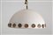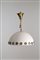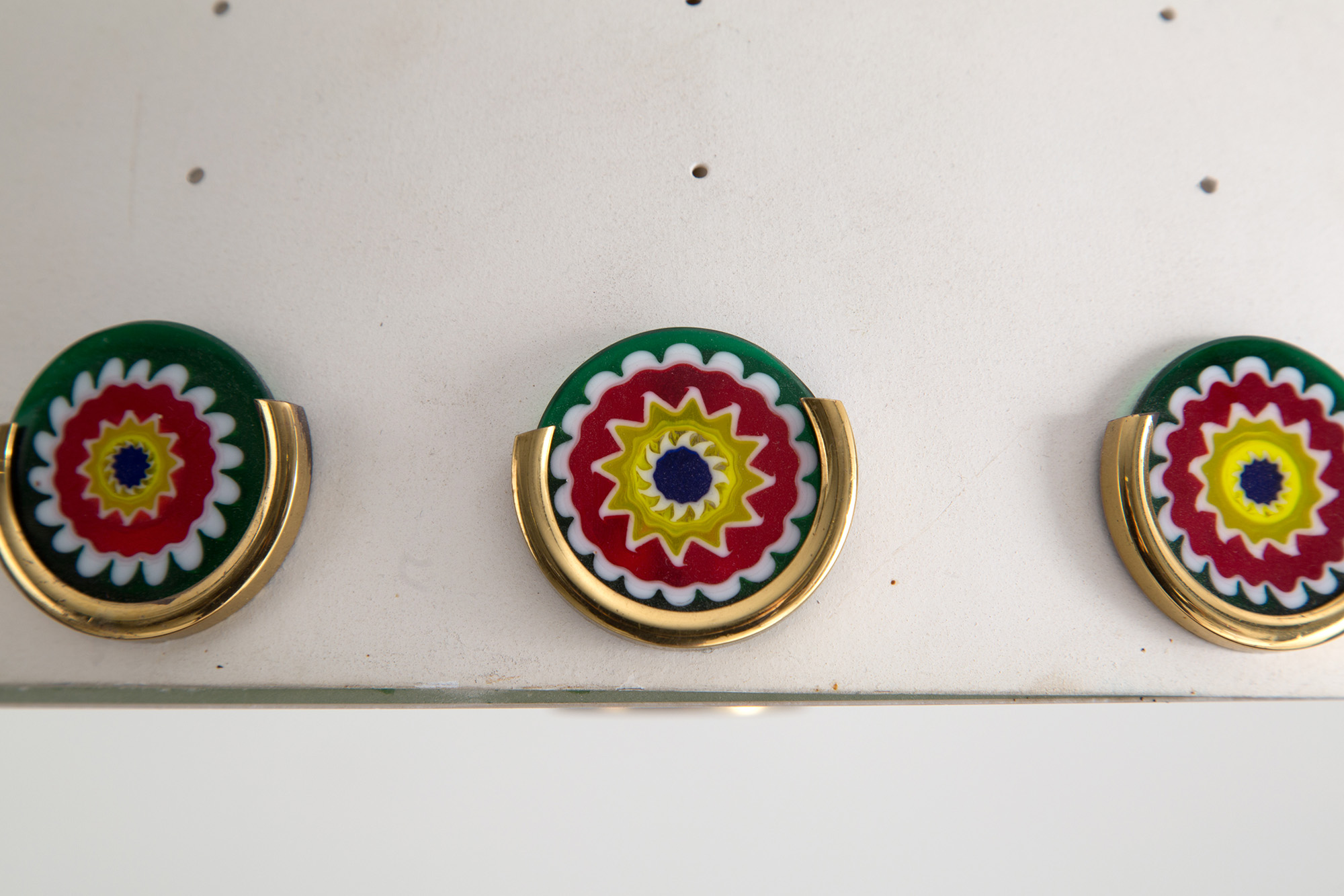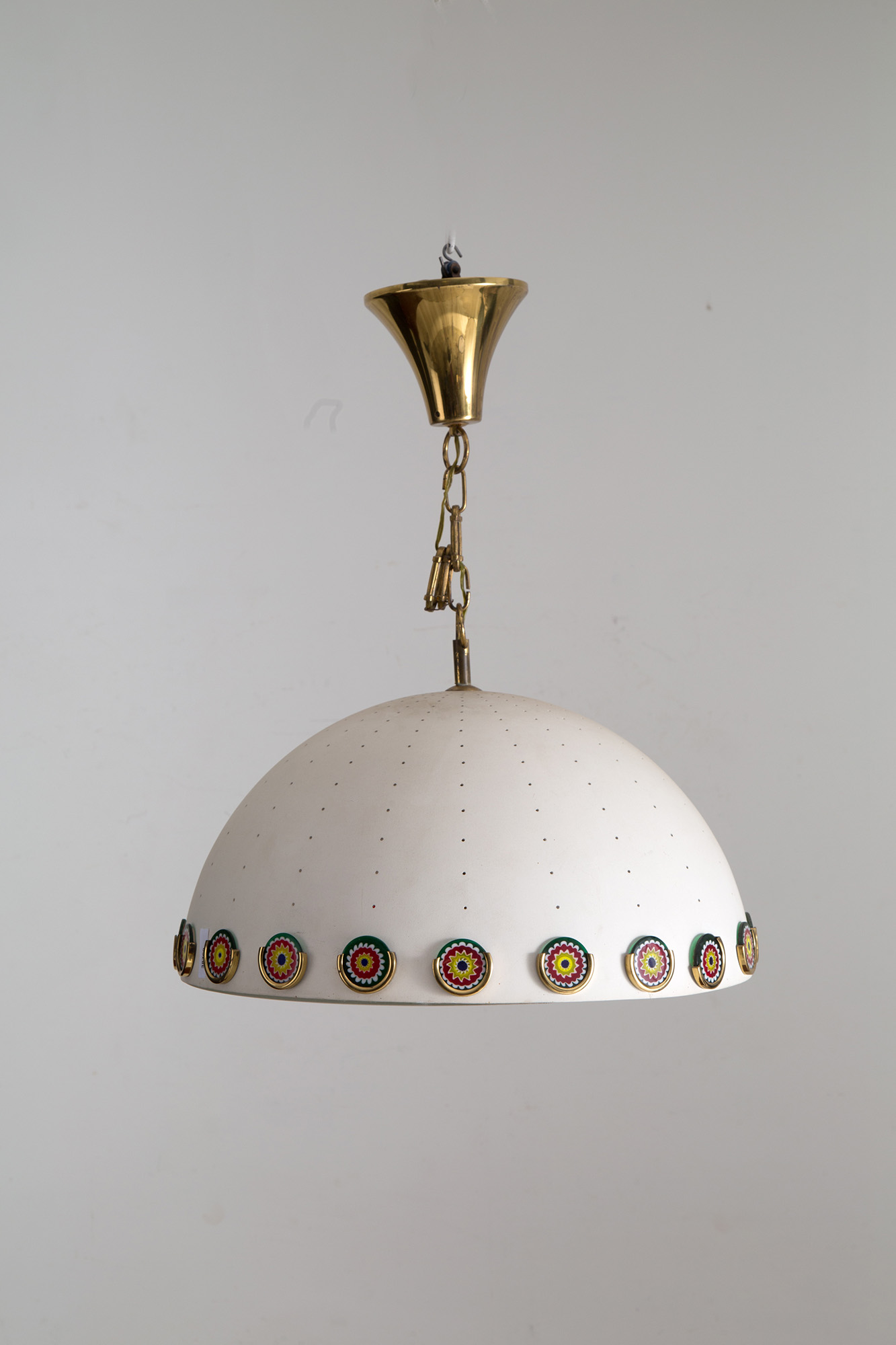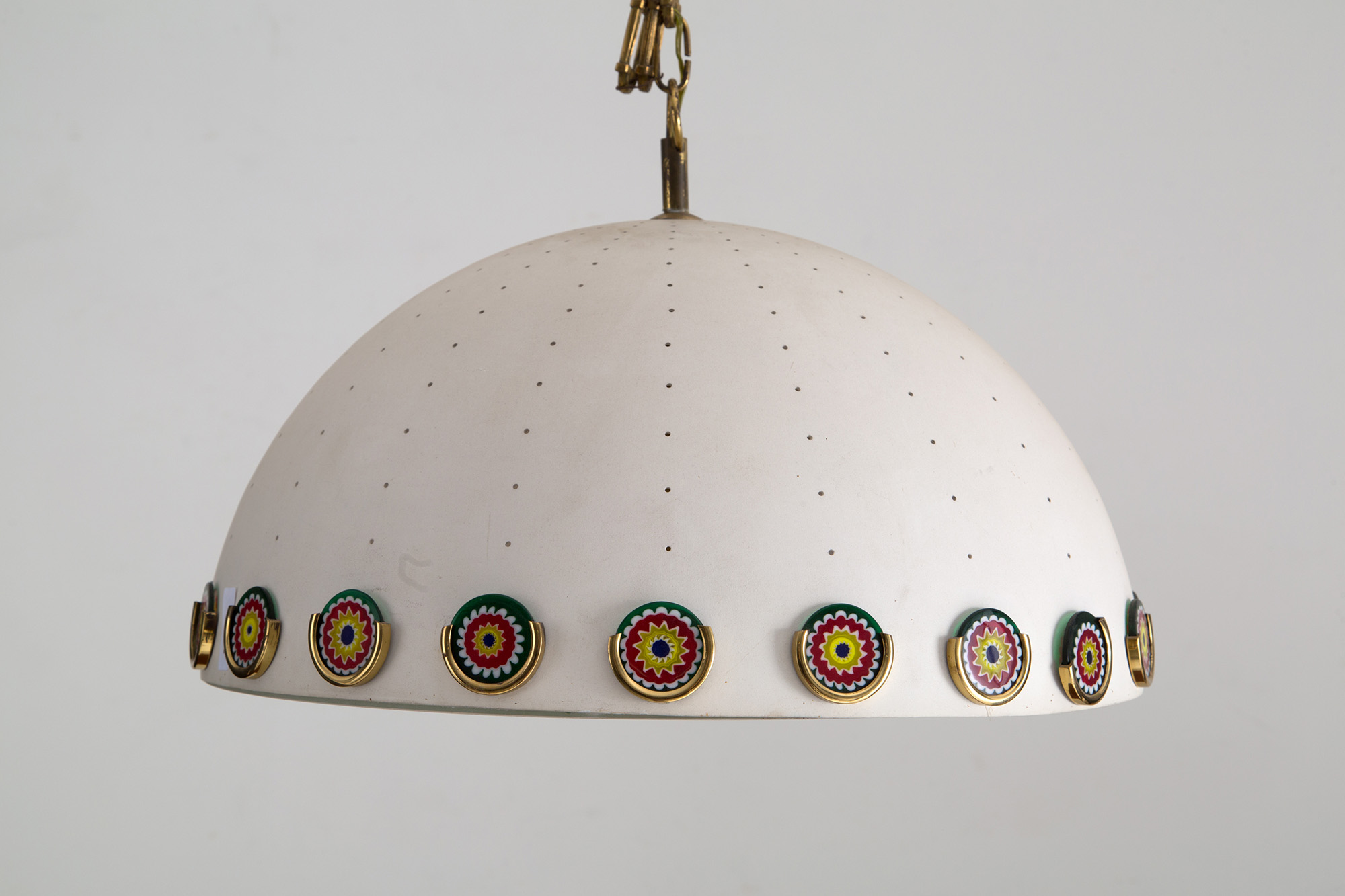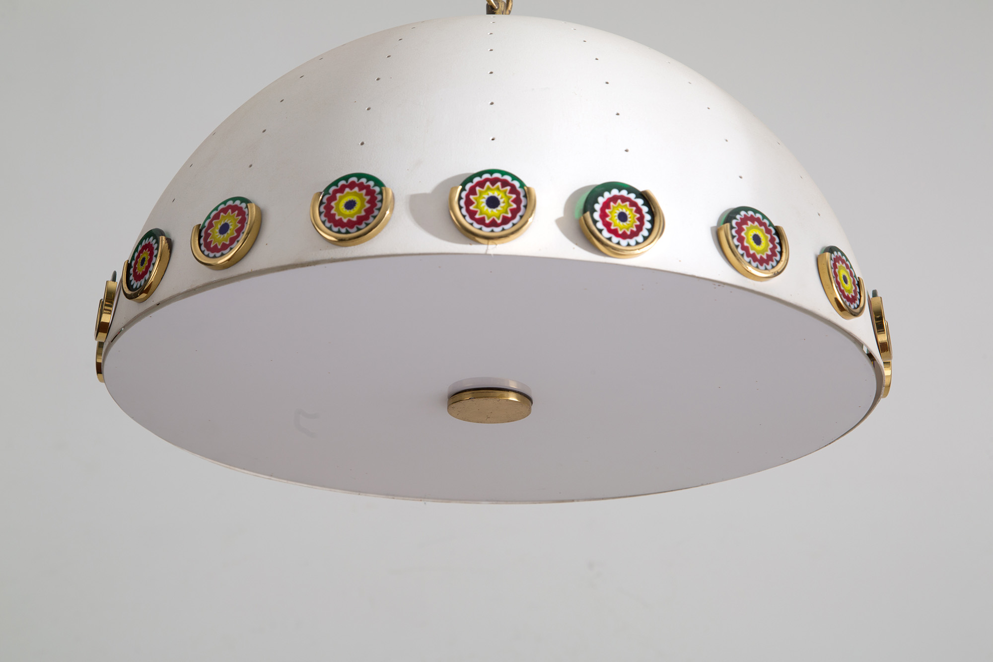 Lampadario in metallo verniciato bianco satinato con murrine e fondo in vetro. Manifattura italiana. Anni '70-'80. Mis. Lung. cm. 48 Alt. cm. 60 ca.