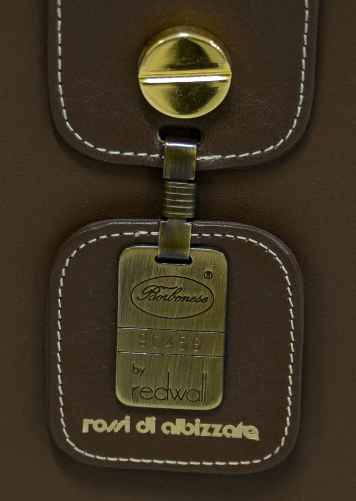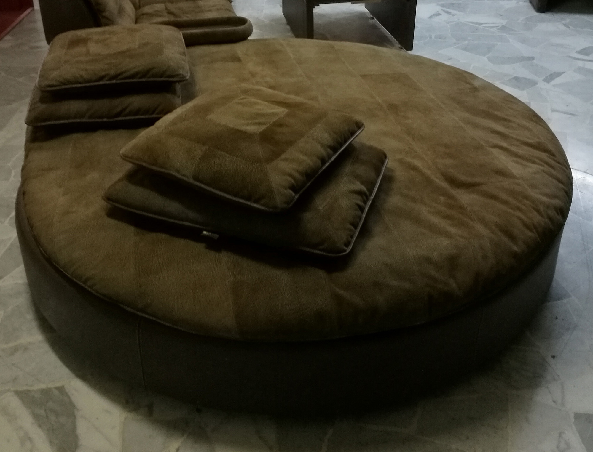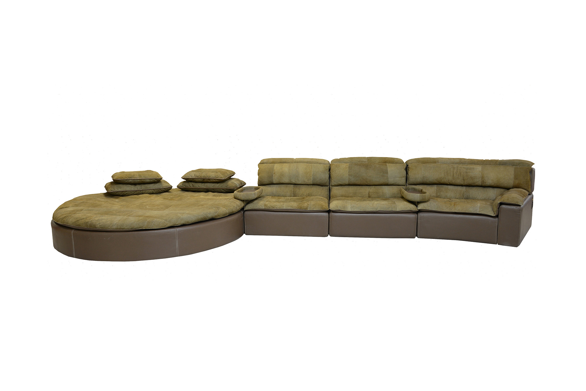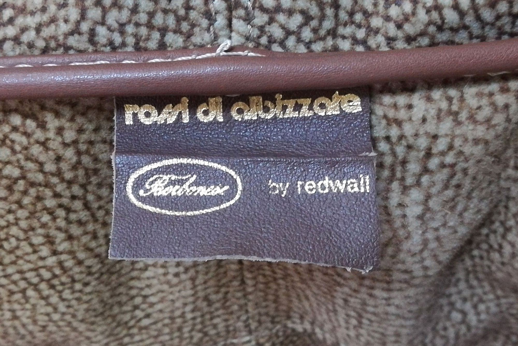 ROSSI DI ALBIZZATE E BORBONESE REDWALL. Arredo rivestito in cuoio e pelle di agnello 'Occhio di Pernice' composto da divano tre posti, penisola, tavolino e quattro cuscini di differenti dimensioni. Con piastrina 'Rossi di Albizzate Borbonese by Redwall, patented n. 90456'. Anni '80.