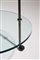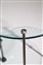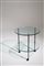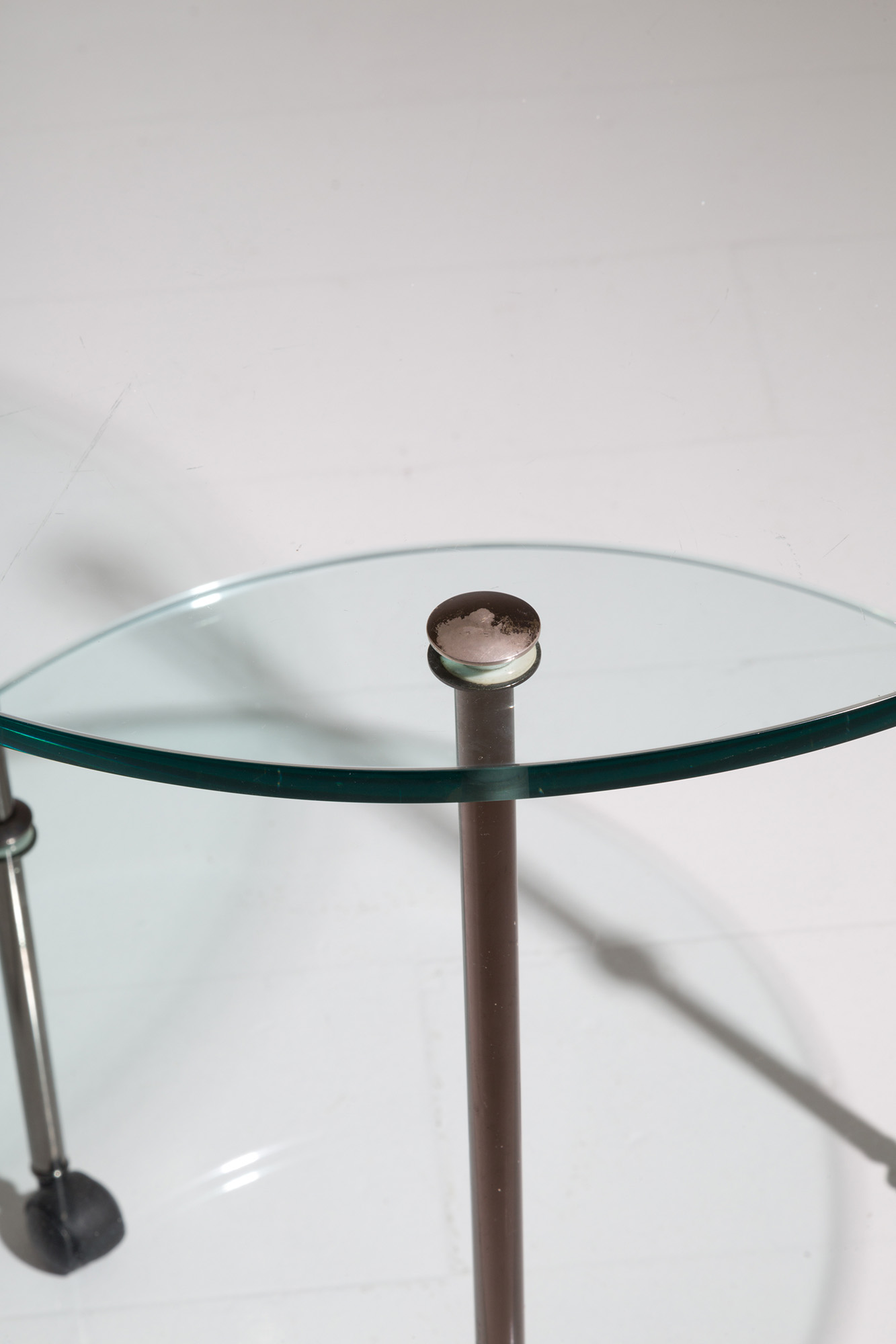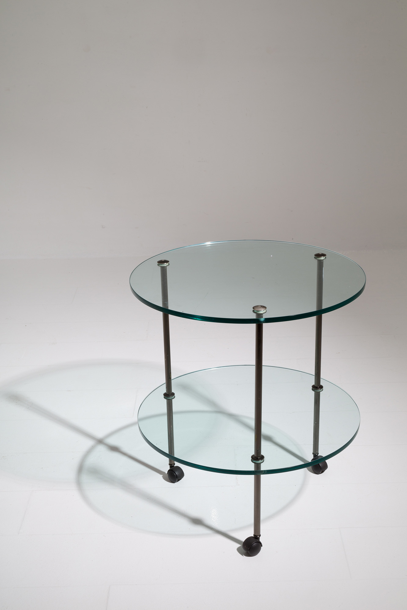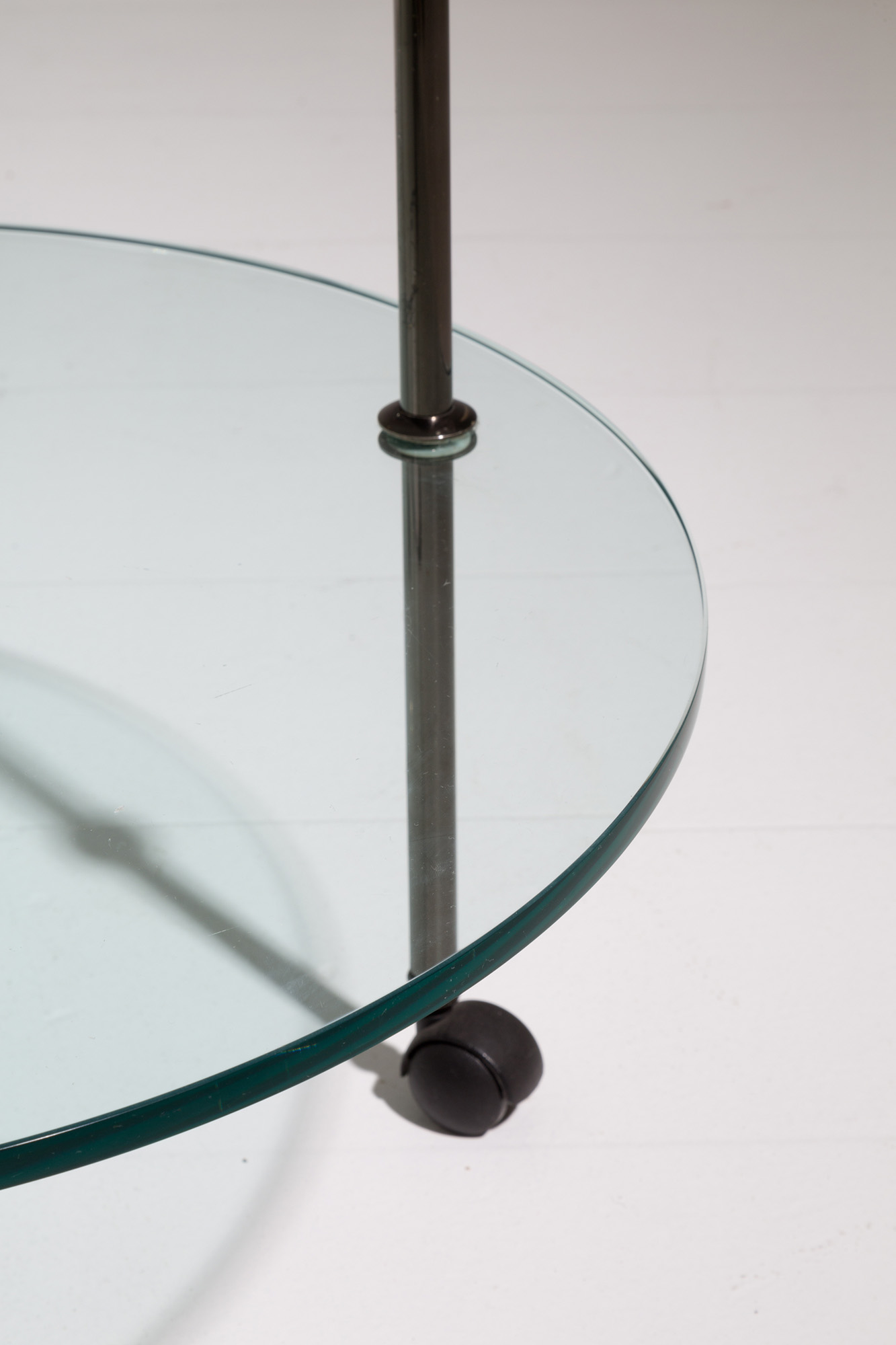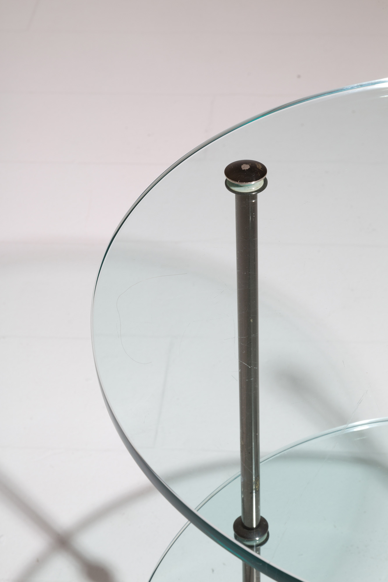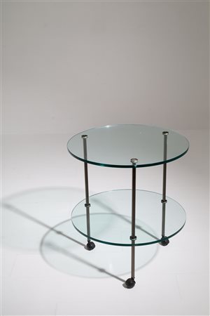 Tavolino rotondo a due ripiani in vetro con base in acciaio cromato e rotelle. Manifattura italiana. Anni '70. Mis. Alt. cm. 62 Diam. cm. 55 ca.