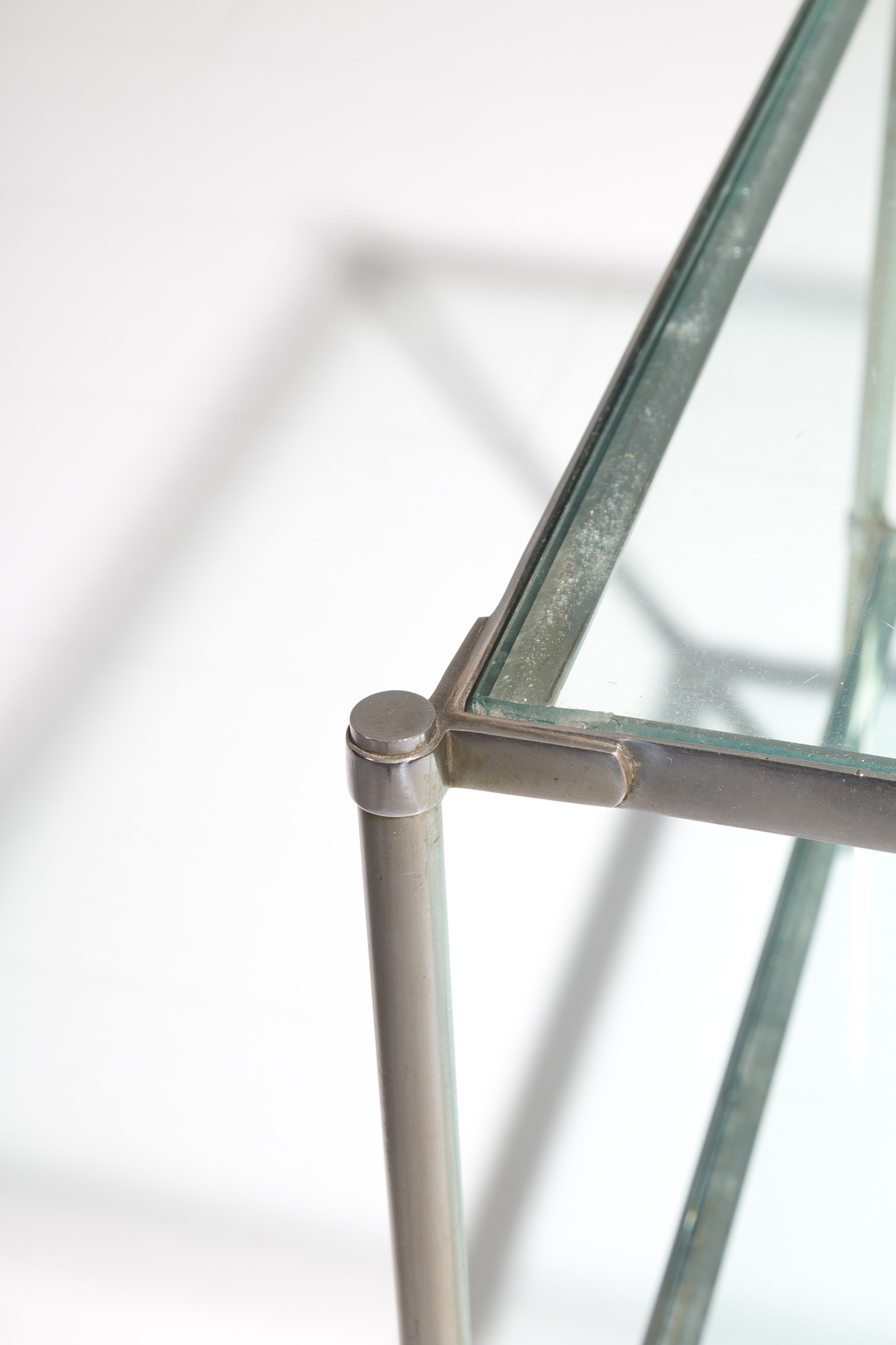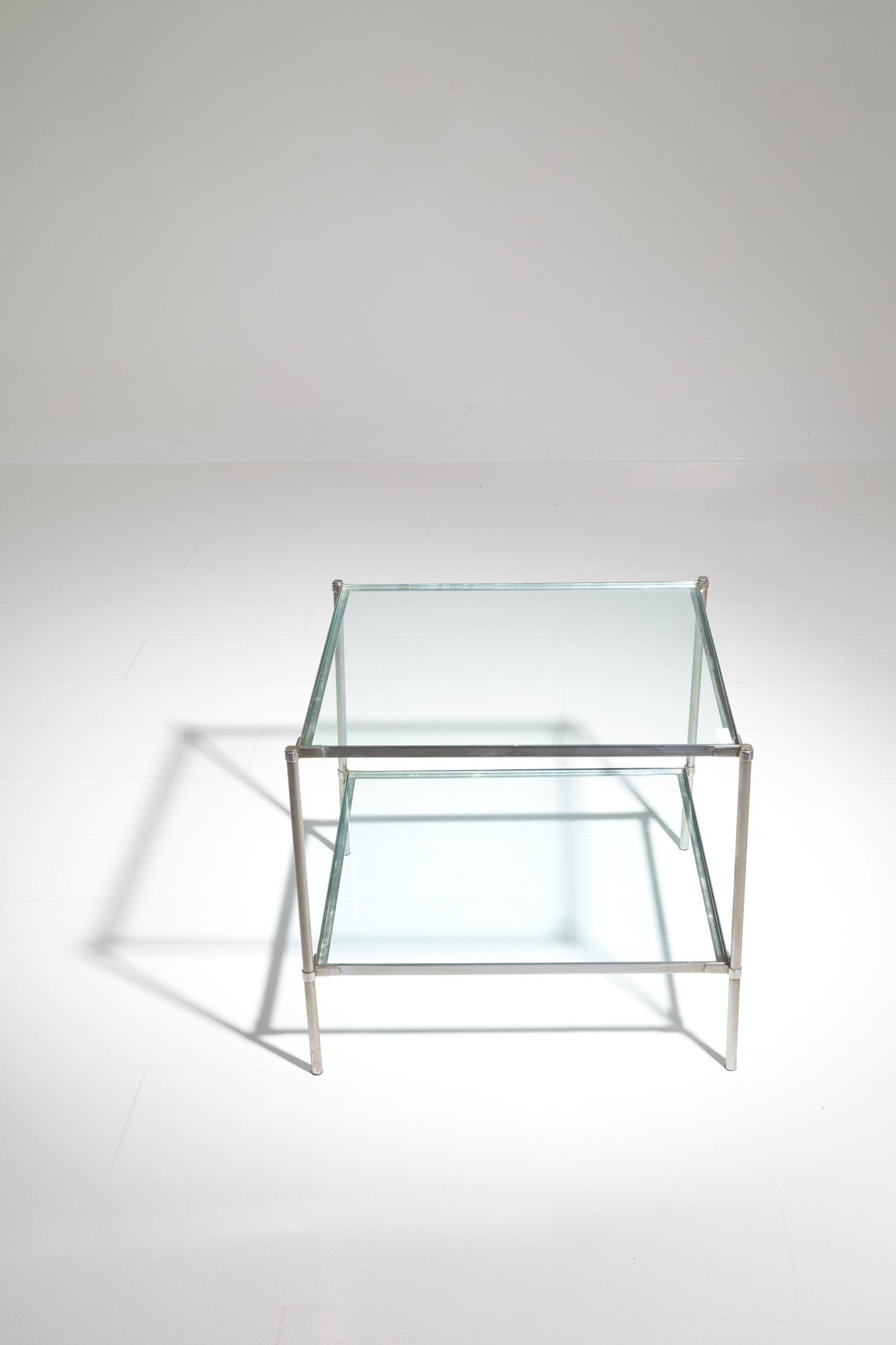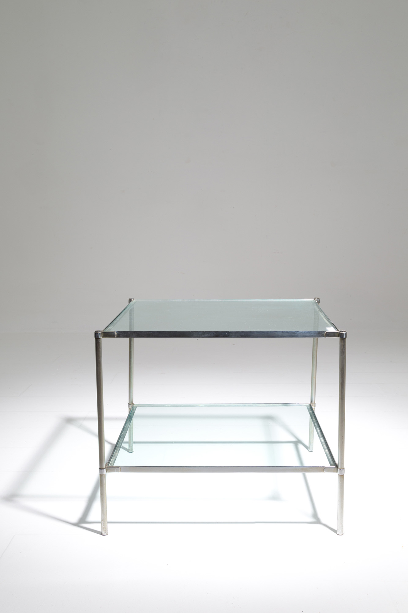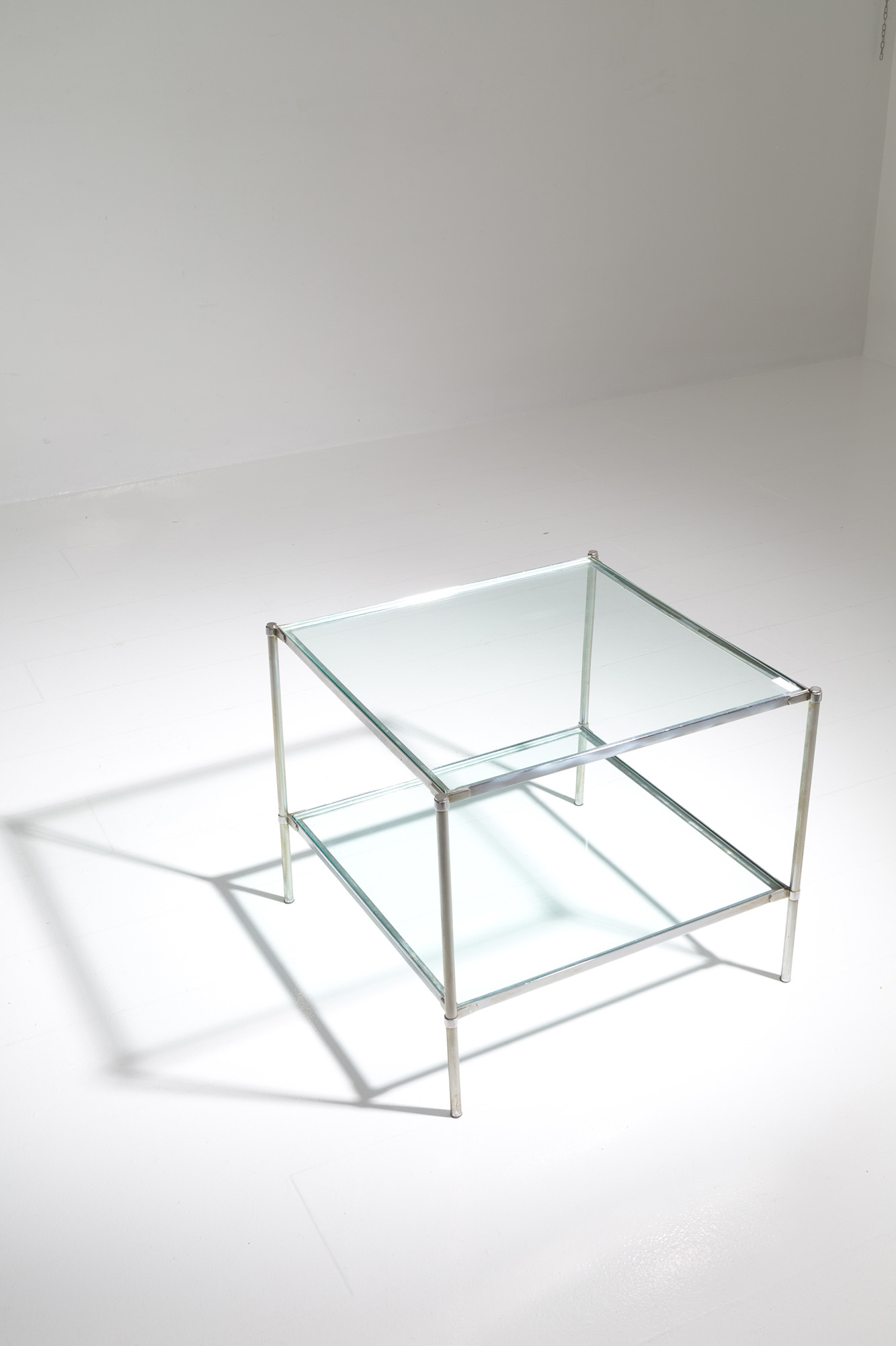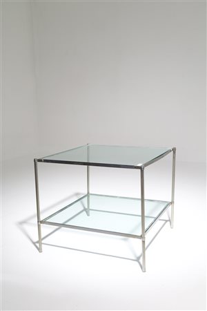 CORRADO CORRADI DELL'ACQUA (Milano, 1905 - Varese, 1982) per AZUCENA. Tavolino in accaio e vetro. Anni '70. Mis. Lung. cm. 52 Alt. cm. 46 Prof. cm. 52 ca.