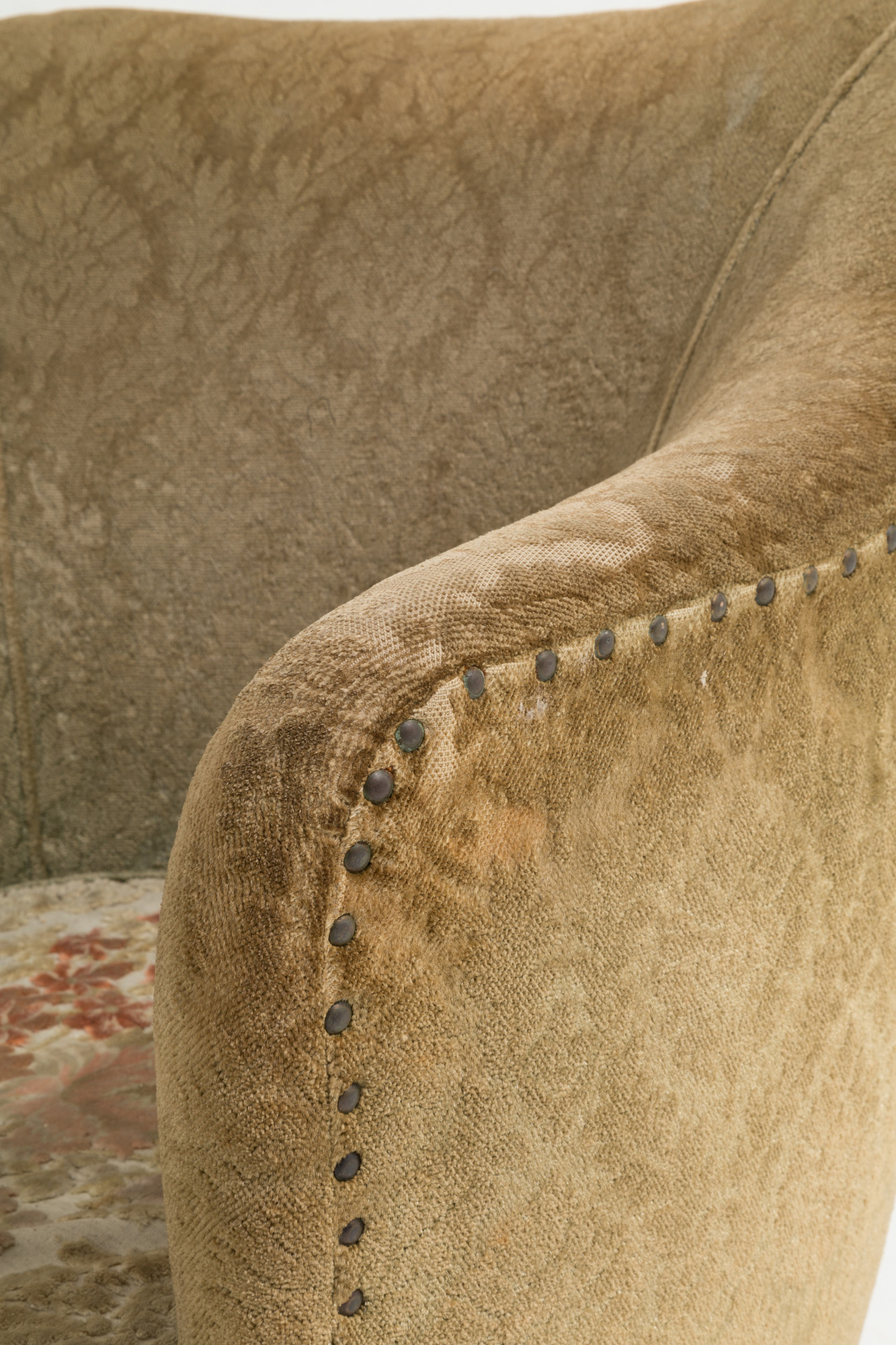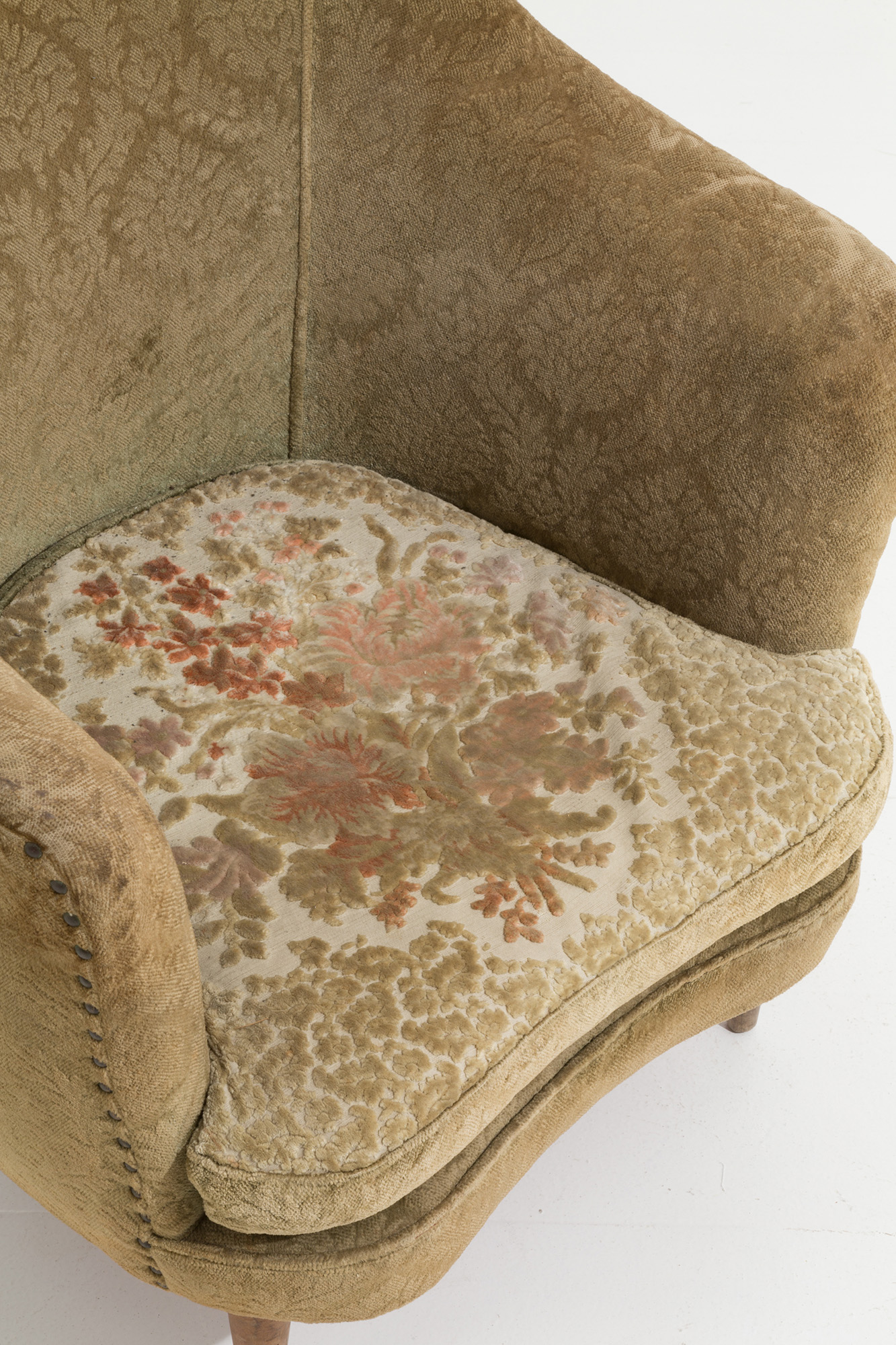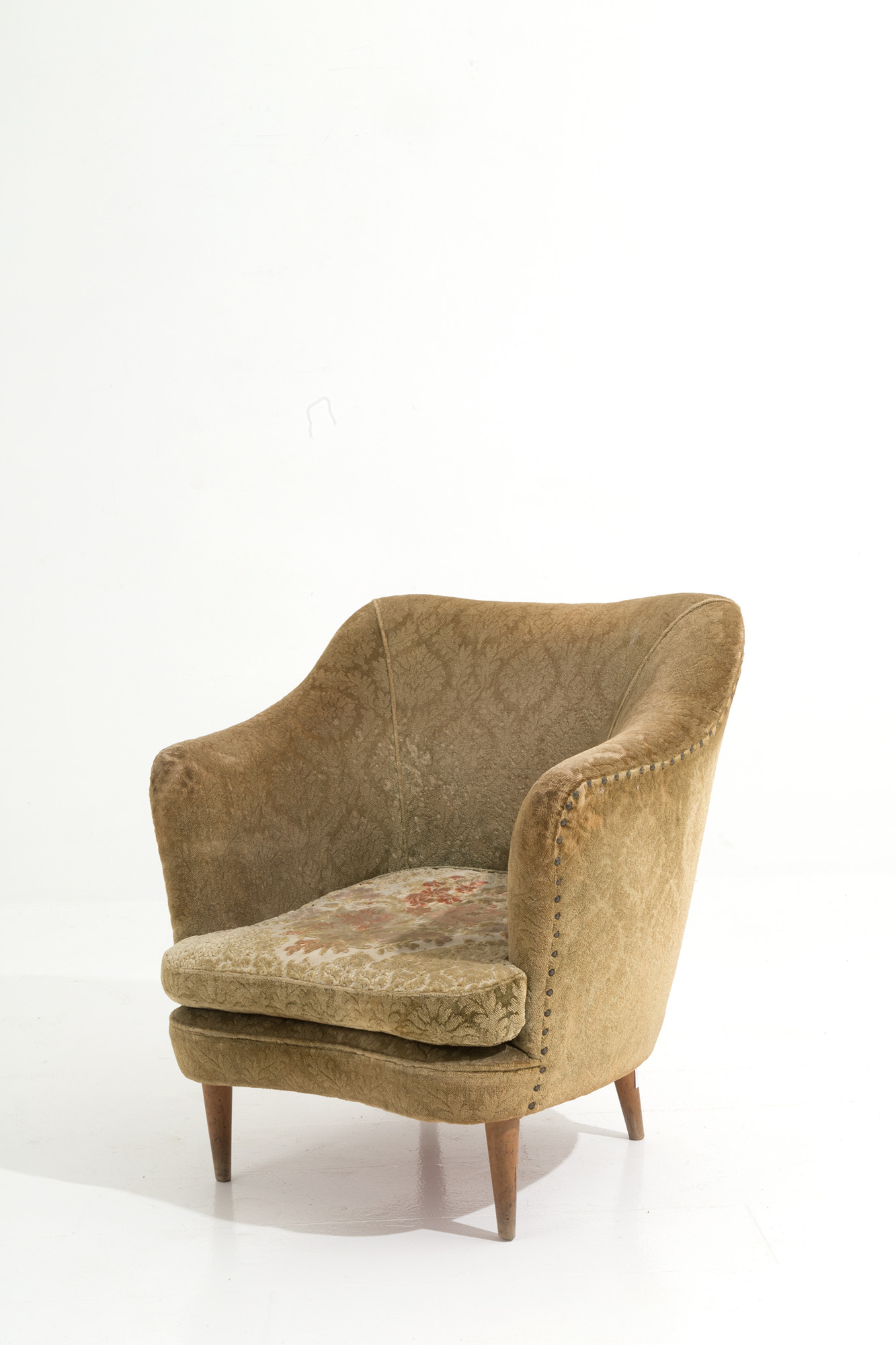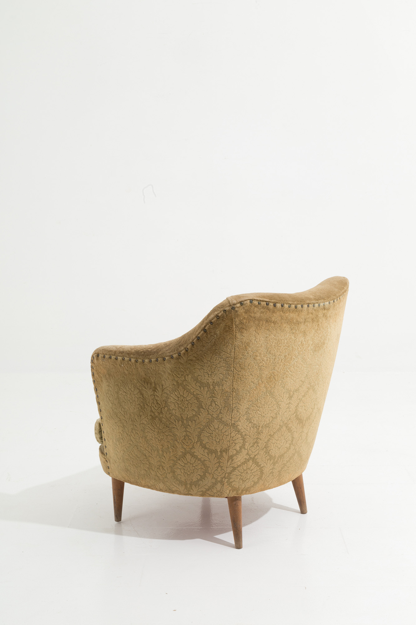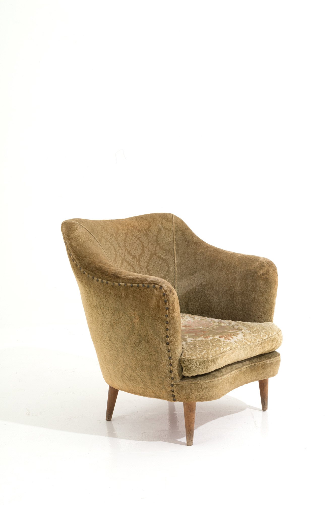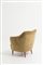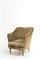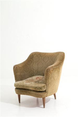 Poltrona a pozzetto in legno e broccato giallo. Manifattura italiana. Anni '50. Mis. Lung. cm. 68 Alt. cm. 71 Prof. cm. 63 ca.