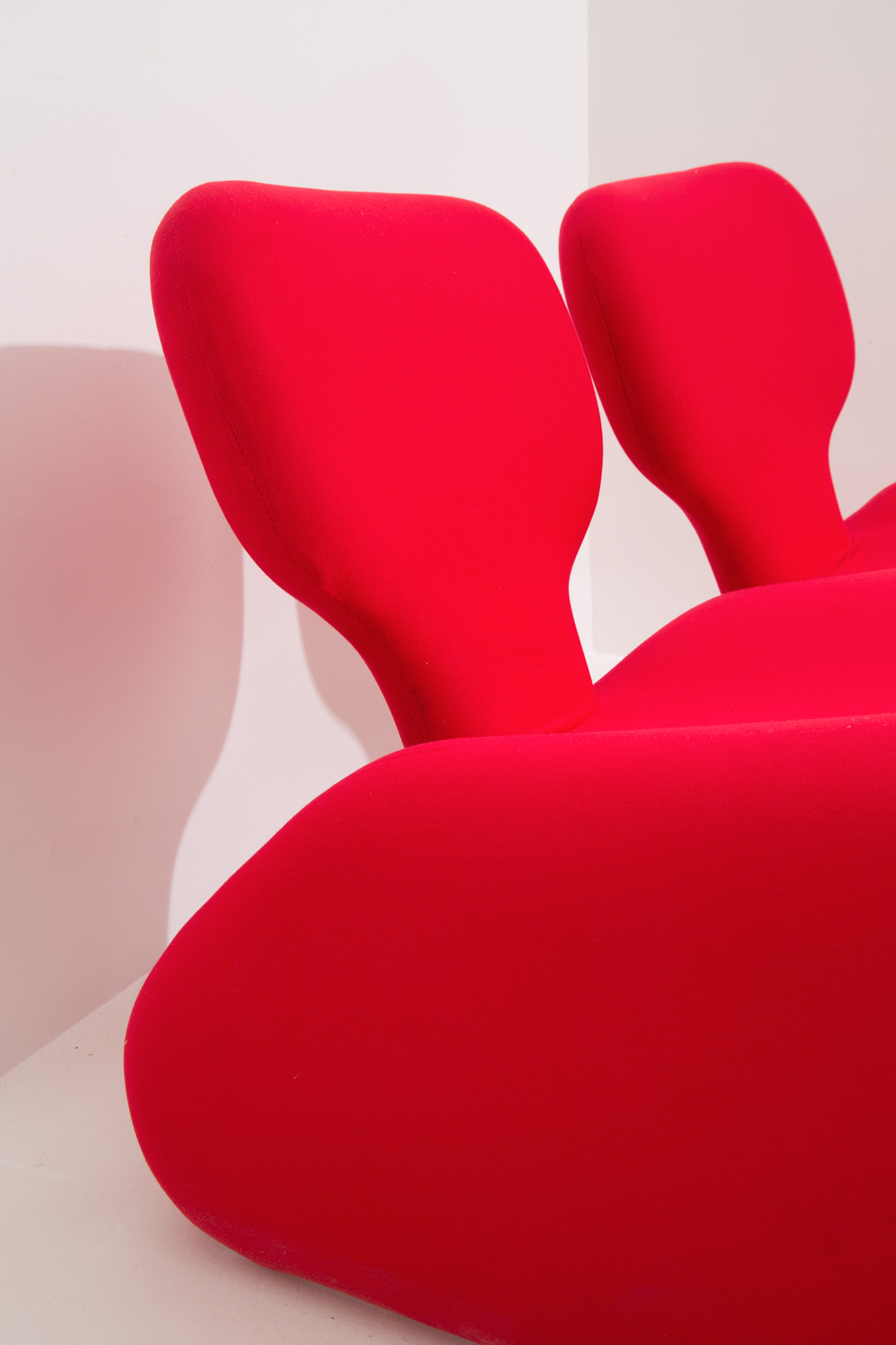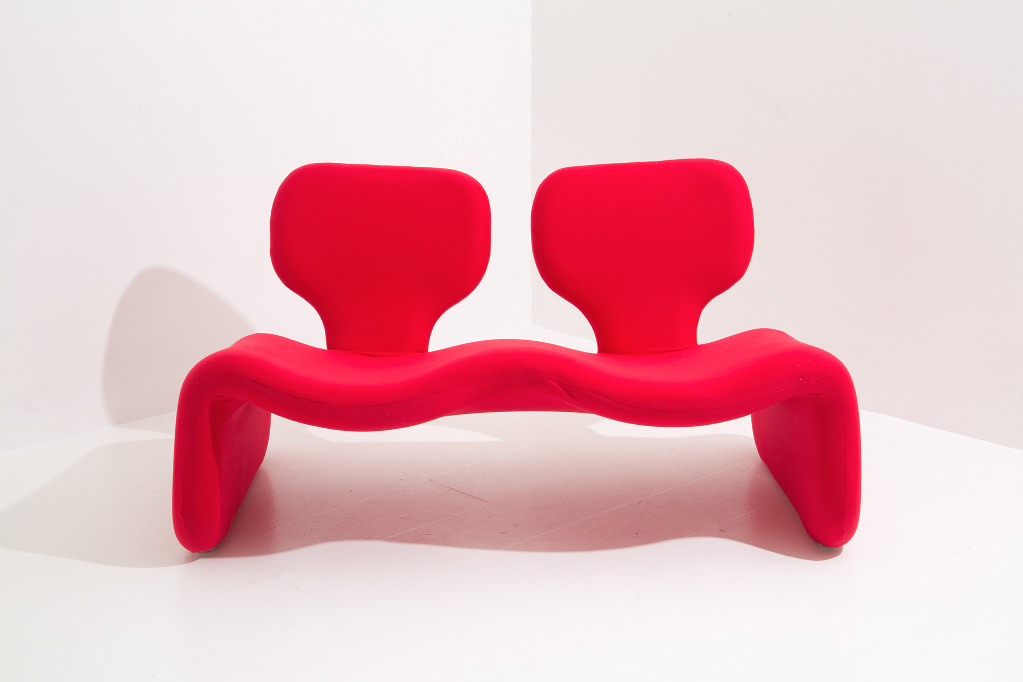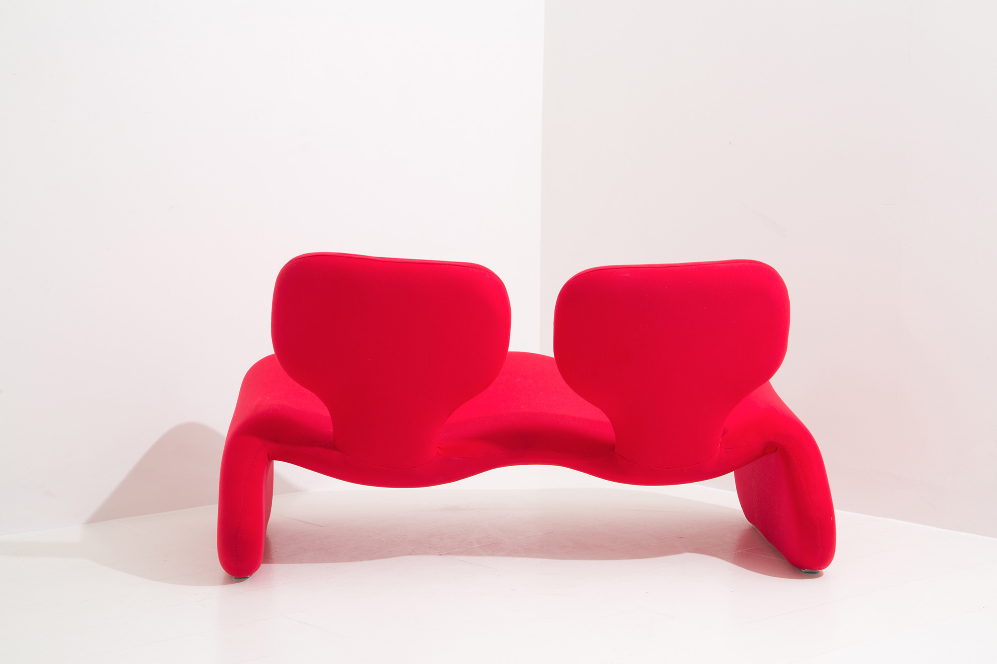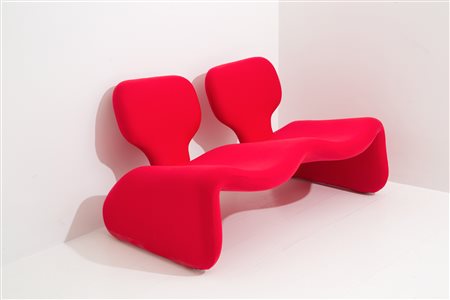 OLIVIER MOURGUE (Parigi, 1939) per ARTIFORT. Divanetto sagomato in tessuto rosso. Anni '60. Rifoderato. Mis. Lung. cm. 125 Alt. cm. 70 Prof. cm. 70 ca.
