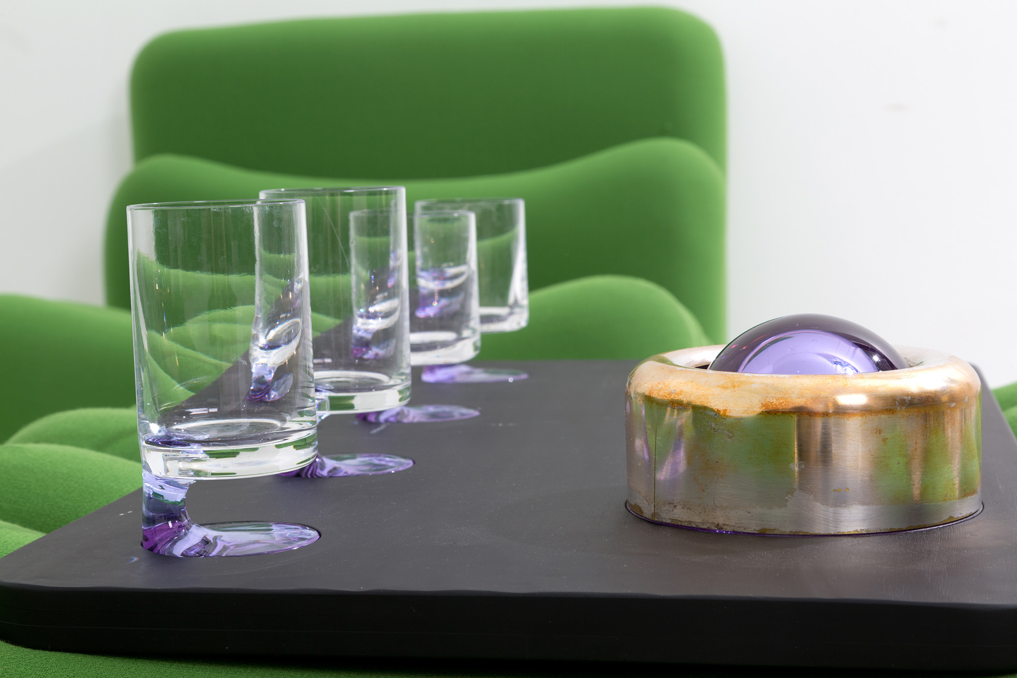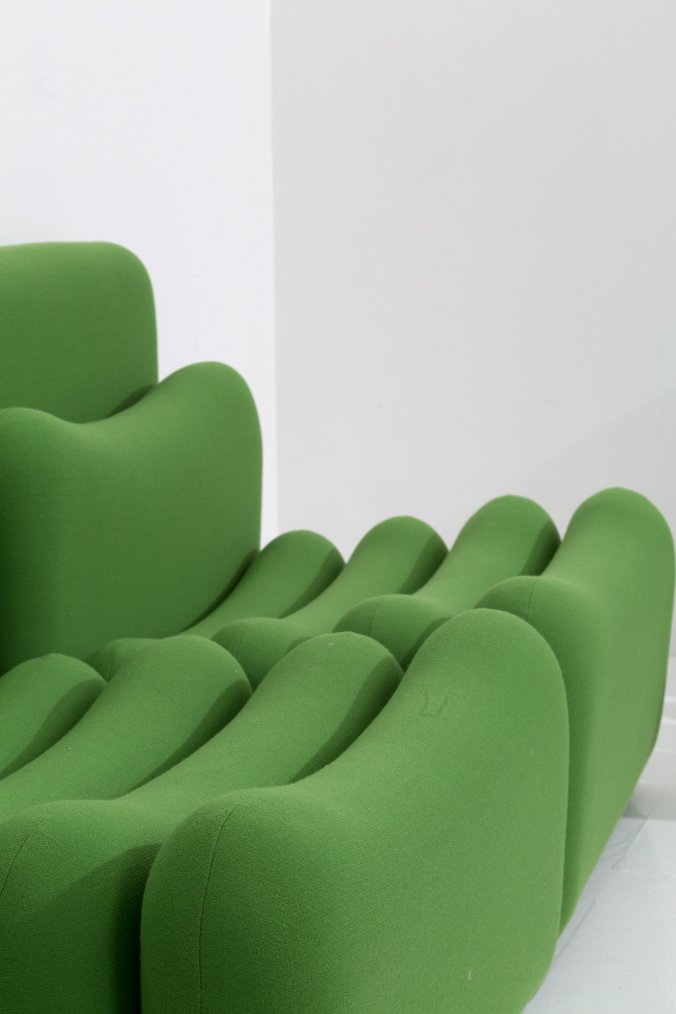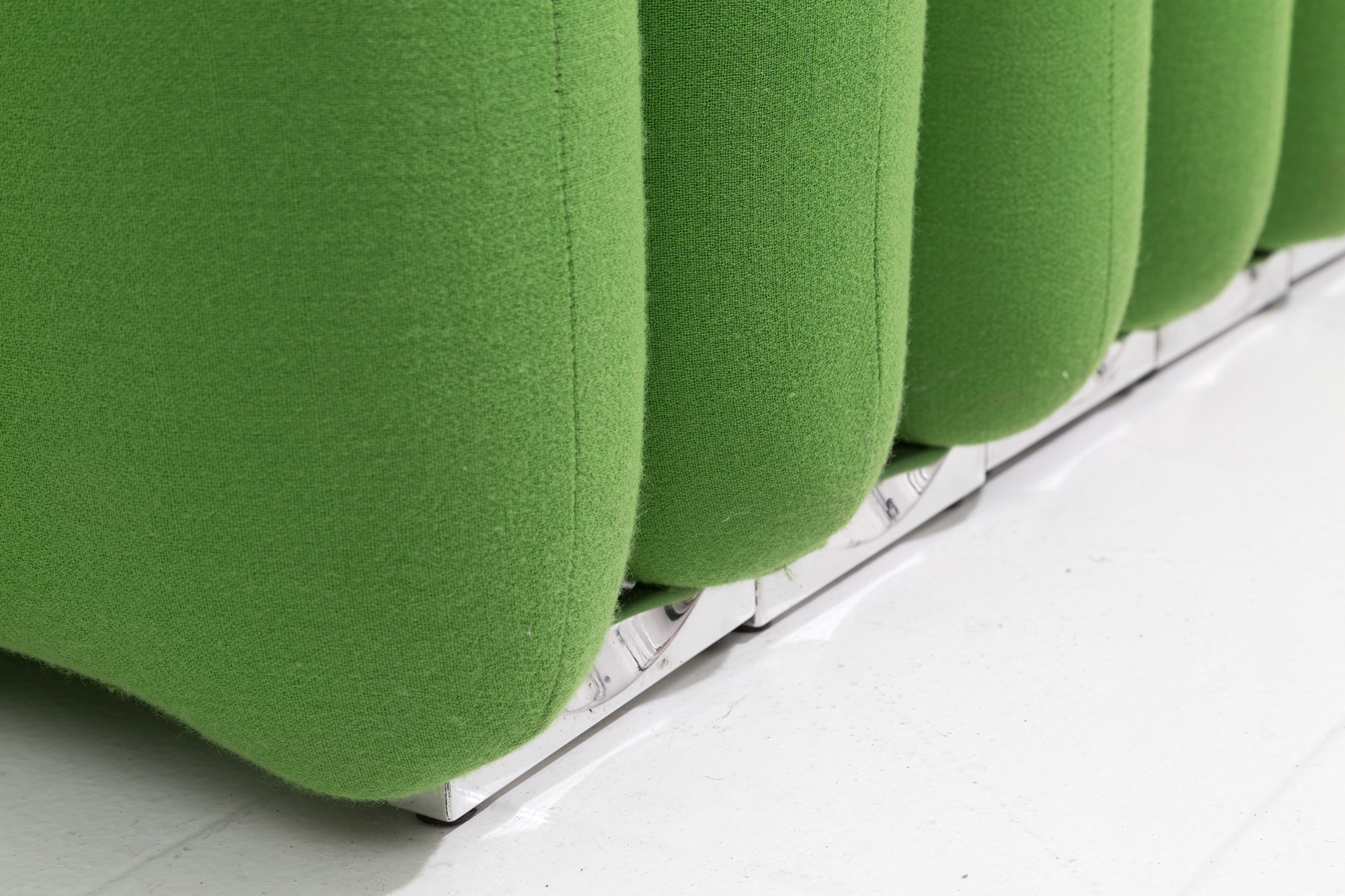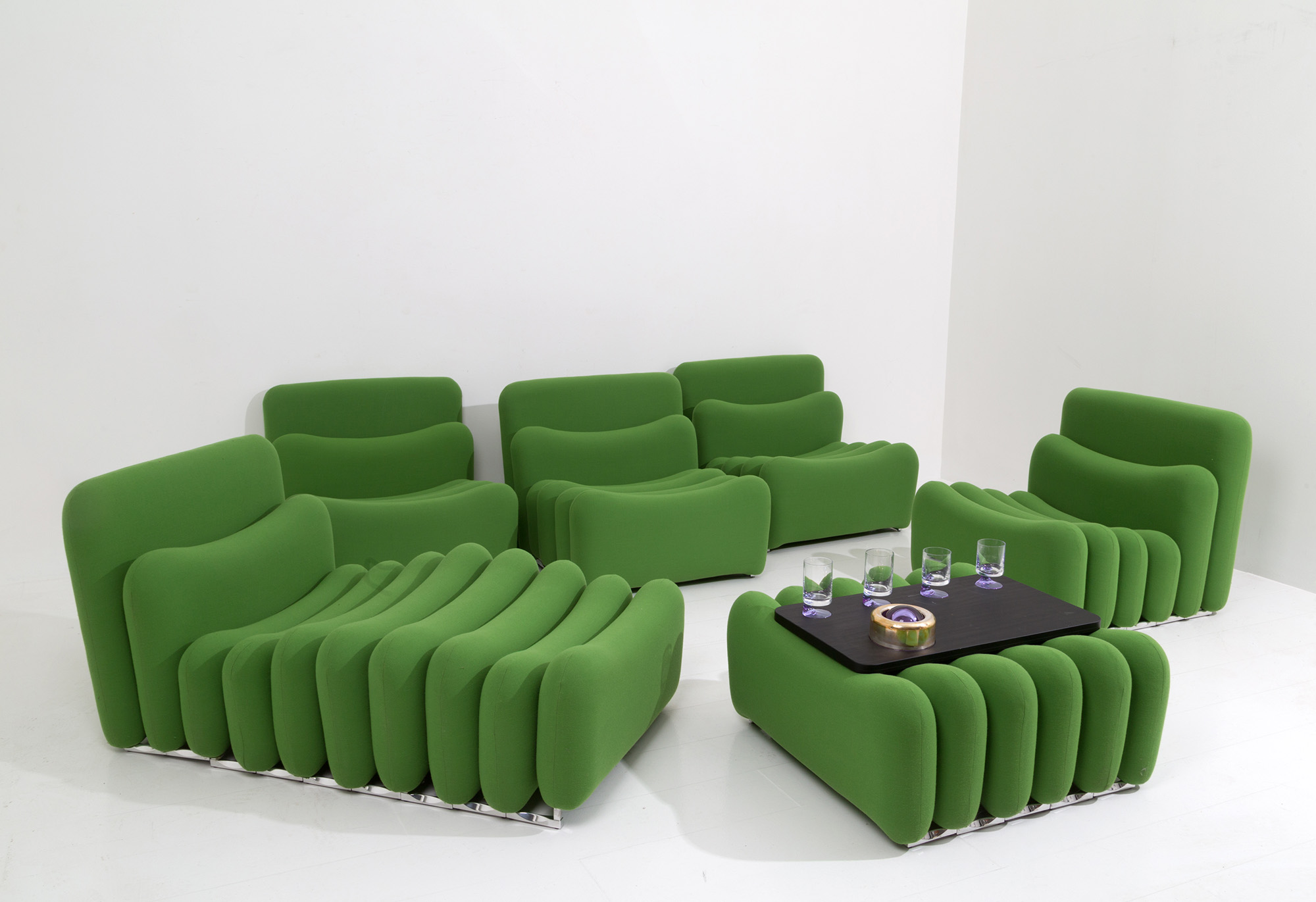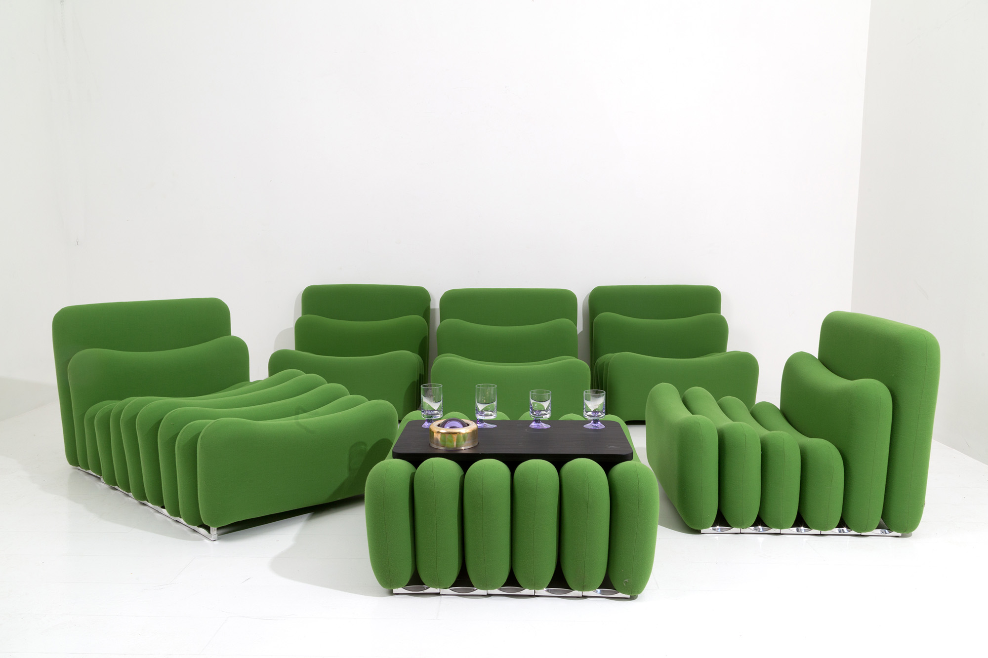 JOE COLOMBO (Milano, 1930-1971) per SORMANI. Set living Additional-System in metallo verniciato e tessuto verde. Composto da quattro poltrone, una chaise longue e un poggiapiedi con vassoio in legno ebanizzato alloggiante quattro bicchieri Smoke e un posacenere Biglia in cristallo, disegnati da JOE COLOMBO per ARNOLFO DI CAMBIO. Con marchio del produttore. Anni '60-'70. Mis. poltrone: Alt. cm. 65 Lung. cm. 75 Prof. cm. 75 ca. Mis. chaise longue: Alt. cm. 70 Lung. cm. 75 Prof. cm. 140 ca. Mis. poggiapiedi: Alt. cm. 40 Lung. cm. 75 Prof. cm. 75 ca. Mis. vassoio: Lung. cm. 70 Prof. cm. 42 ca.