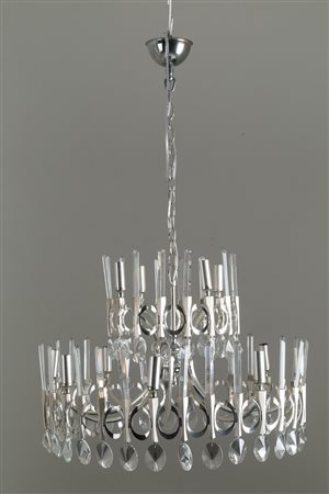 GAETANO SCIOLARI (1927-1994). Lampadario in metallo e cristallo. Anni '70. Mis. Alt. cm. 97 Diam. cm. 63 ca.