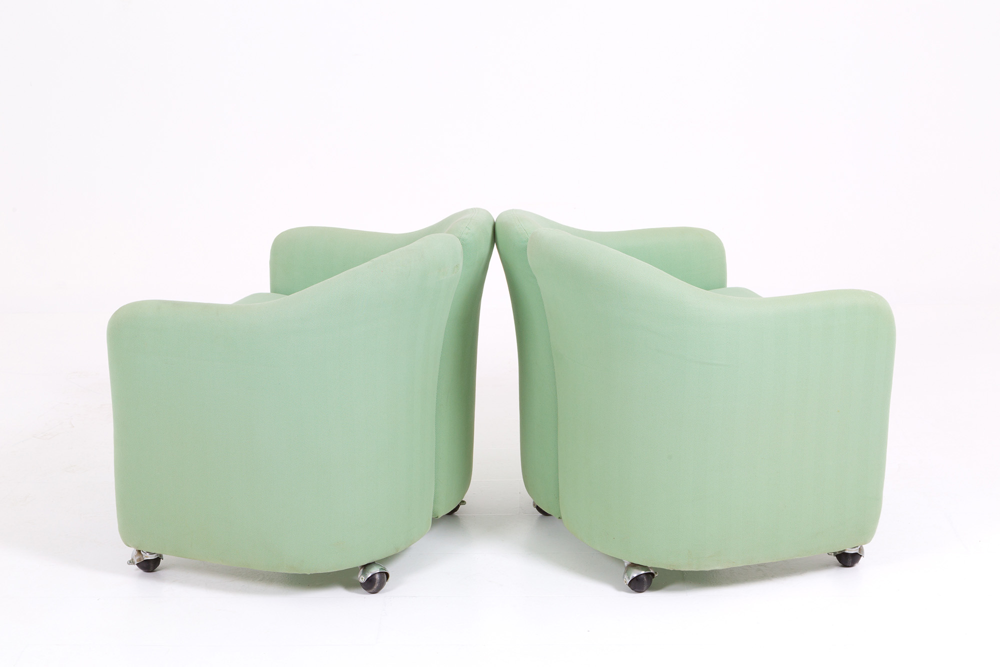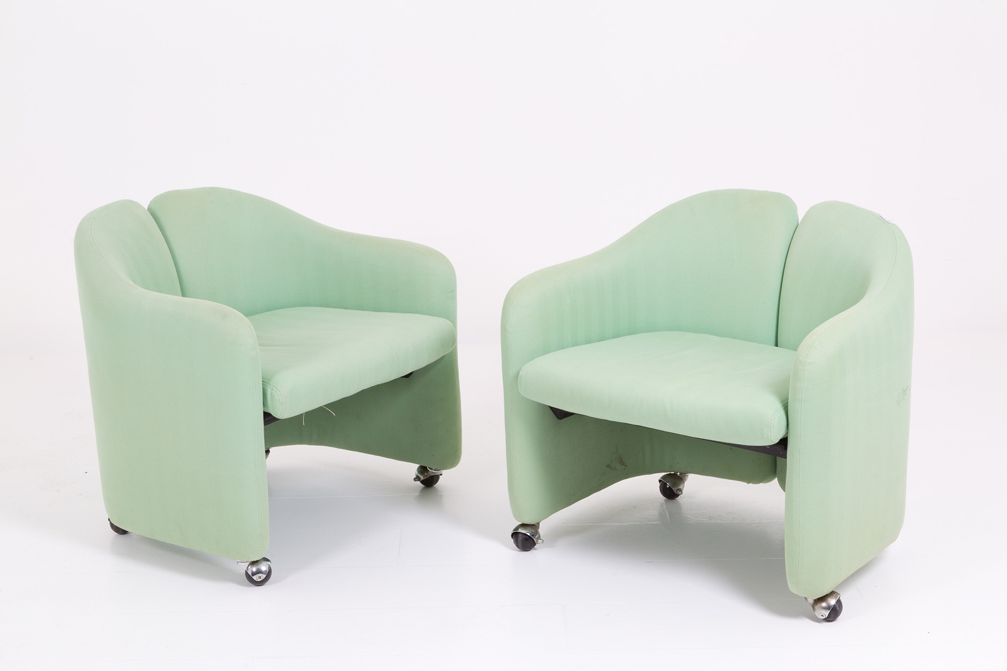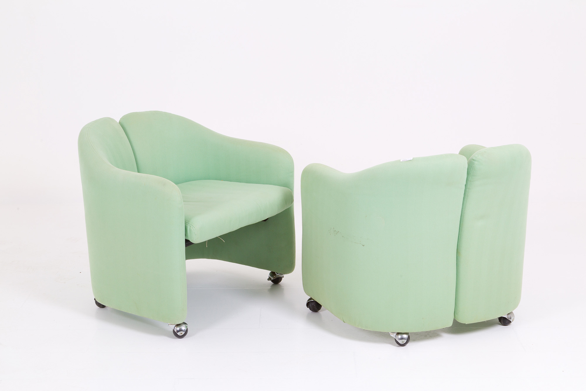 OSVALDO BORSANI (Varedo, 1911 - Milano, 1985) e EUGENIO GERLI (Milano, 1923-2013) per TECNO. Coppia di poltroncine modello ps142 imbottite rivestite in stoffa color verde acqua. Anni '60. Pubblicate in G. Bosoni, Osvaldo Borsani, architetto, designer, imprenditore, p. 533. Mis. Lung. cm. 67 Alt. cm. 68 Prof. cm. 75 ca.