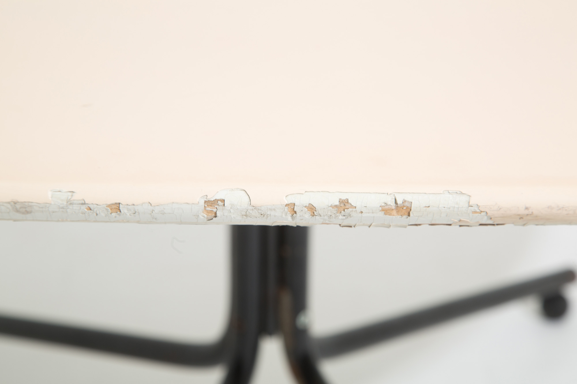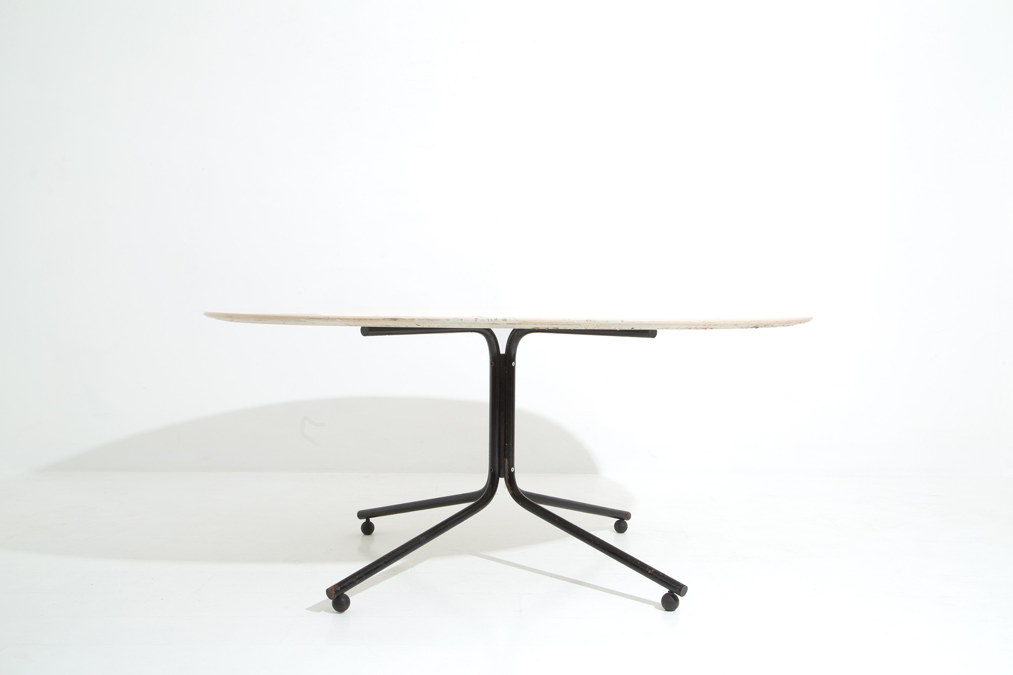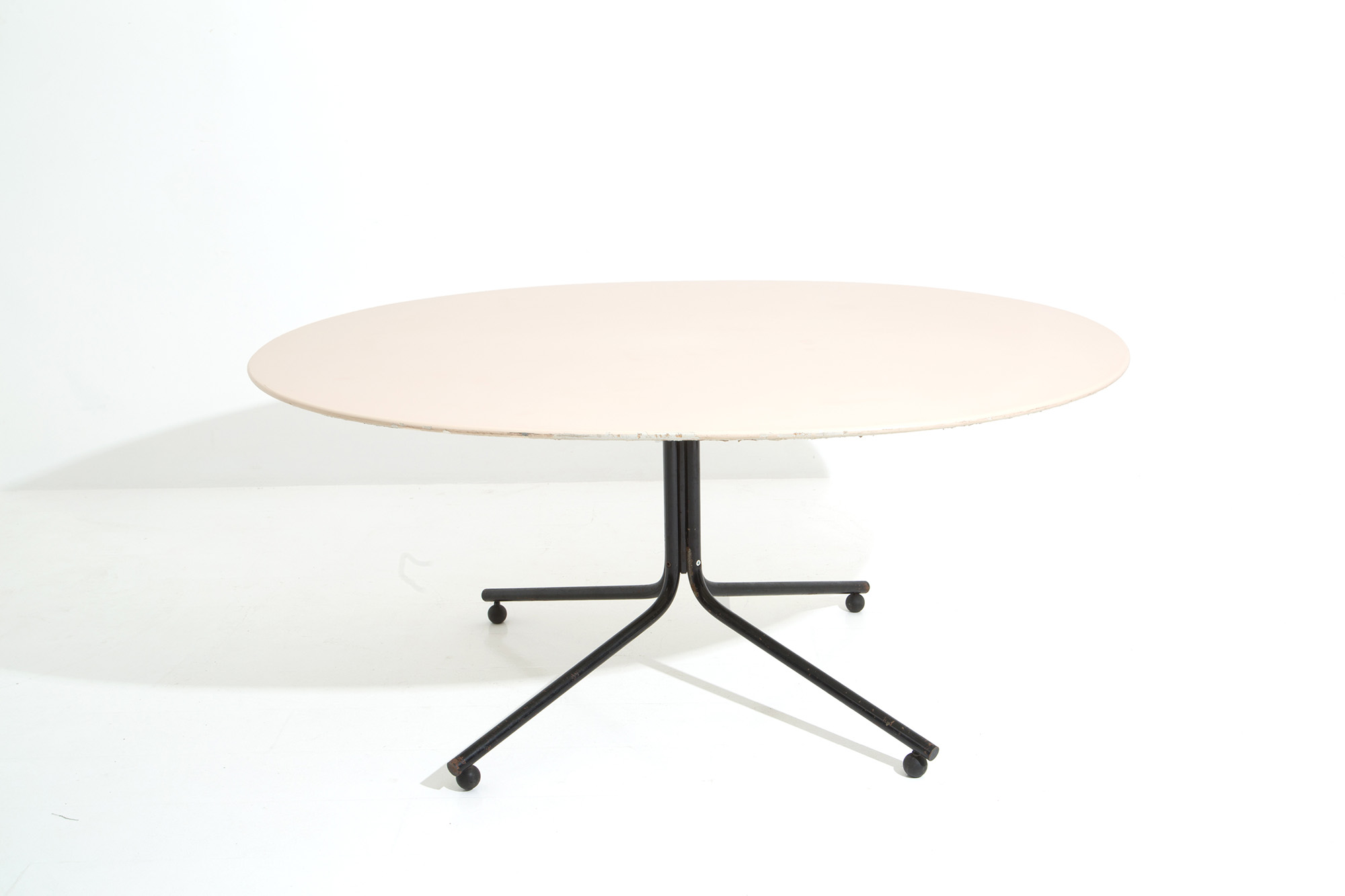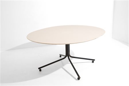 Tavolo in legno laccato bianco con gambe in metallo verniciato. Produzione GAVINA. Anni '60-'70. Difetti. Mis. Lung. cm. 160 Prof. cm. 140 ca.