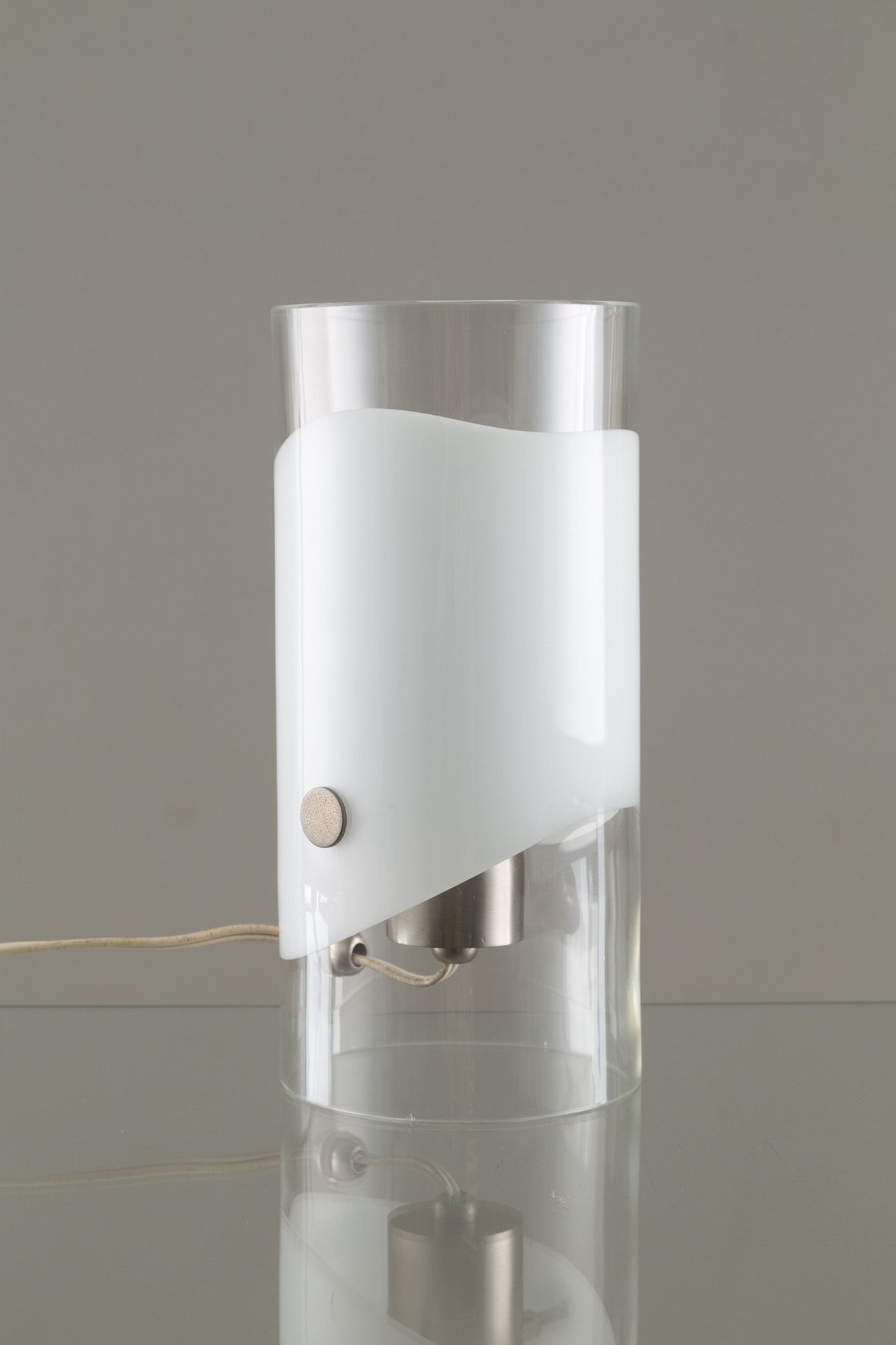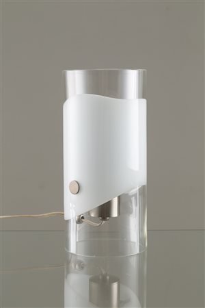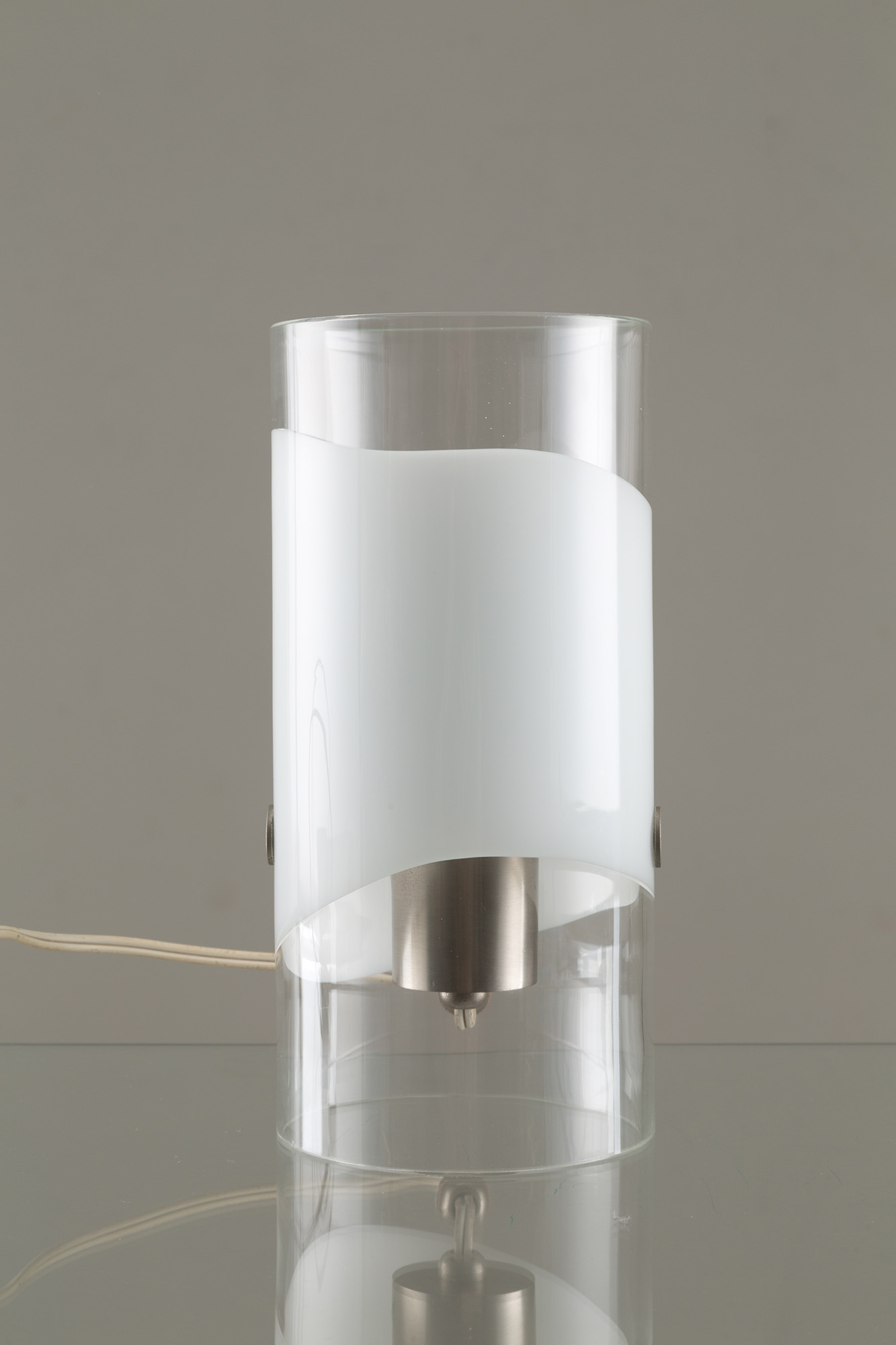 Lampada da tavolo in acciaio e vetro bianco e opalino. Produzione MAZZEGA. Anni '60. Mis. Alt. cm. 25 Diam. cm. 12 ca.