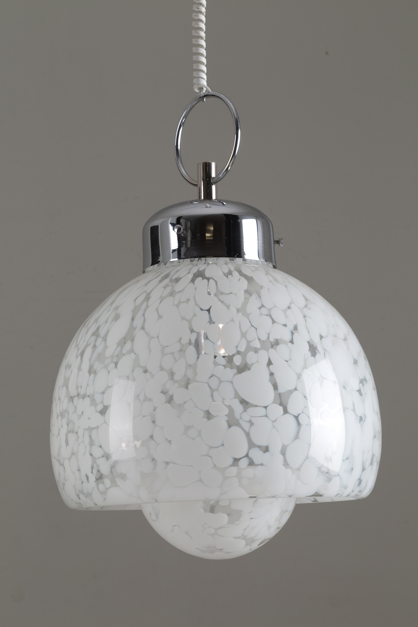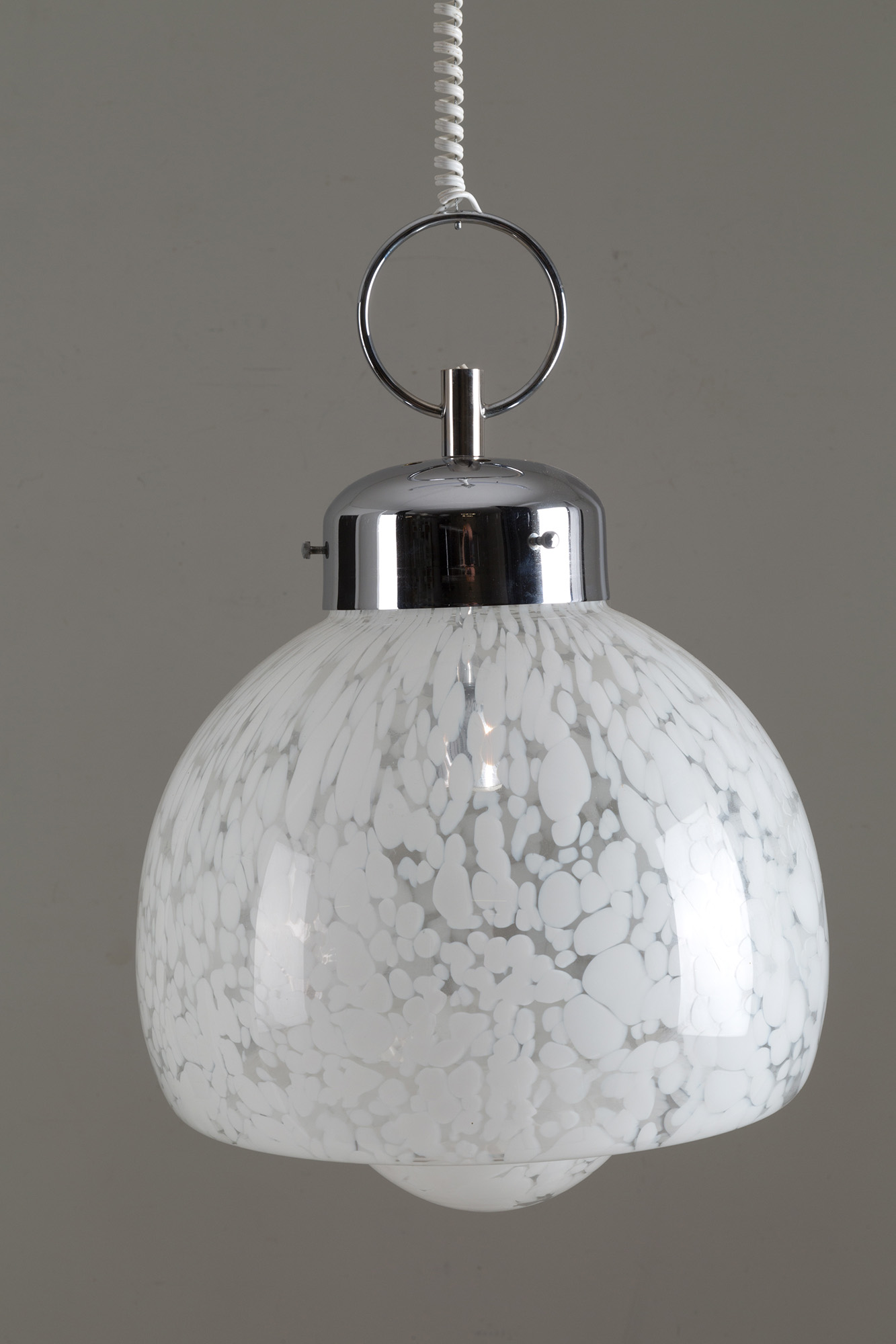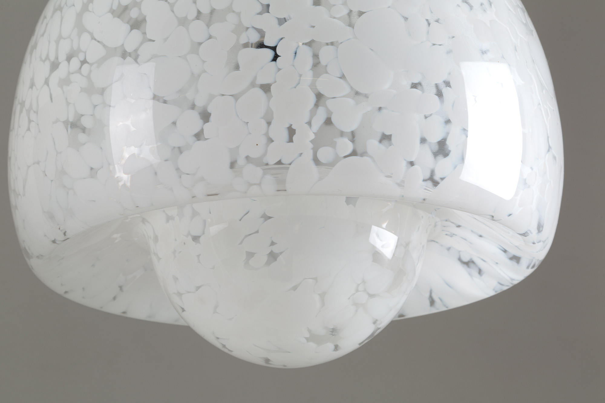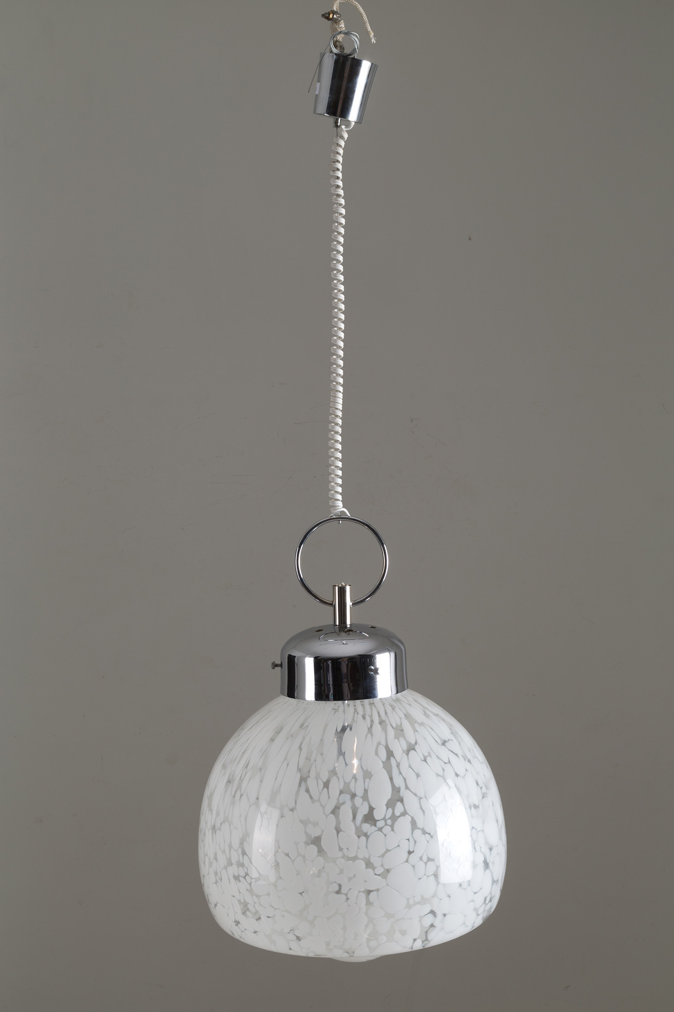 Lampadario in vetro di Murano maculato bianco. Produzione MAZZEGA. Anni '70. Mis. Alt. cm. 110 Diam. cm. 40 ca.