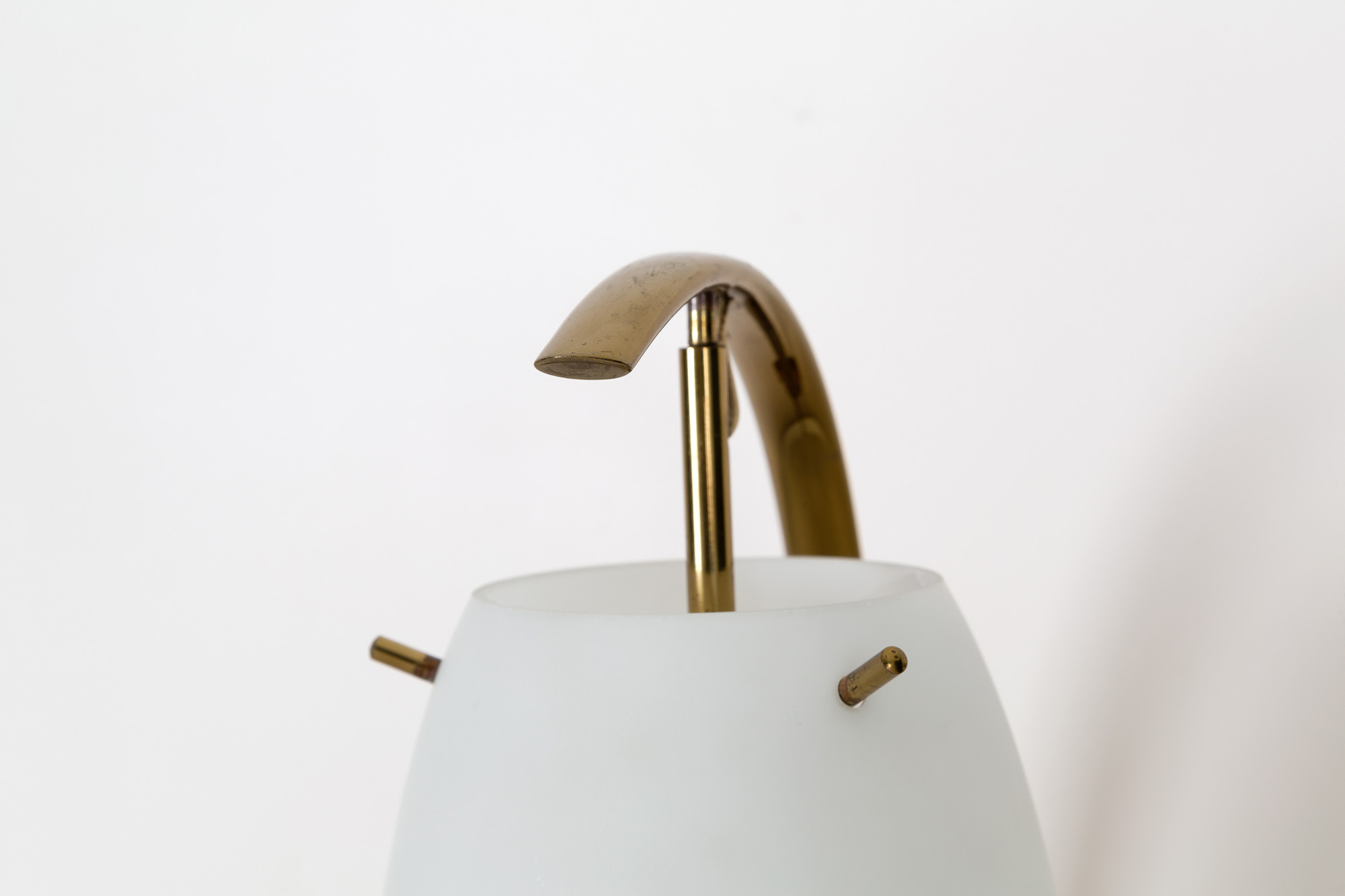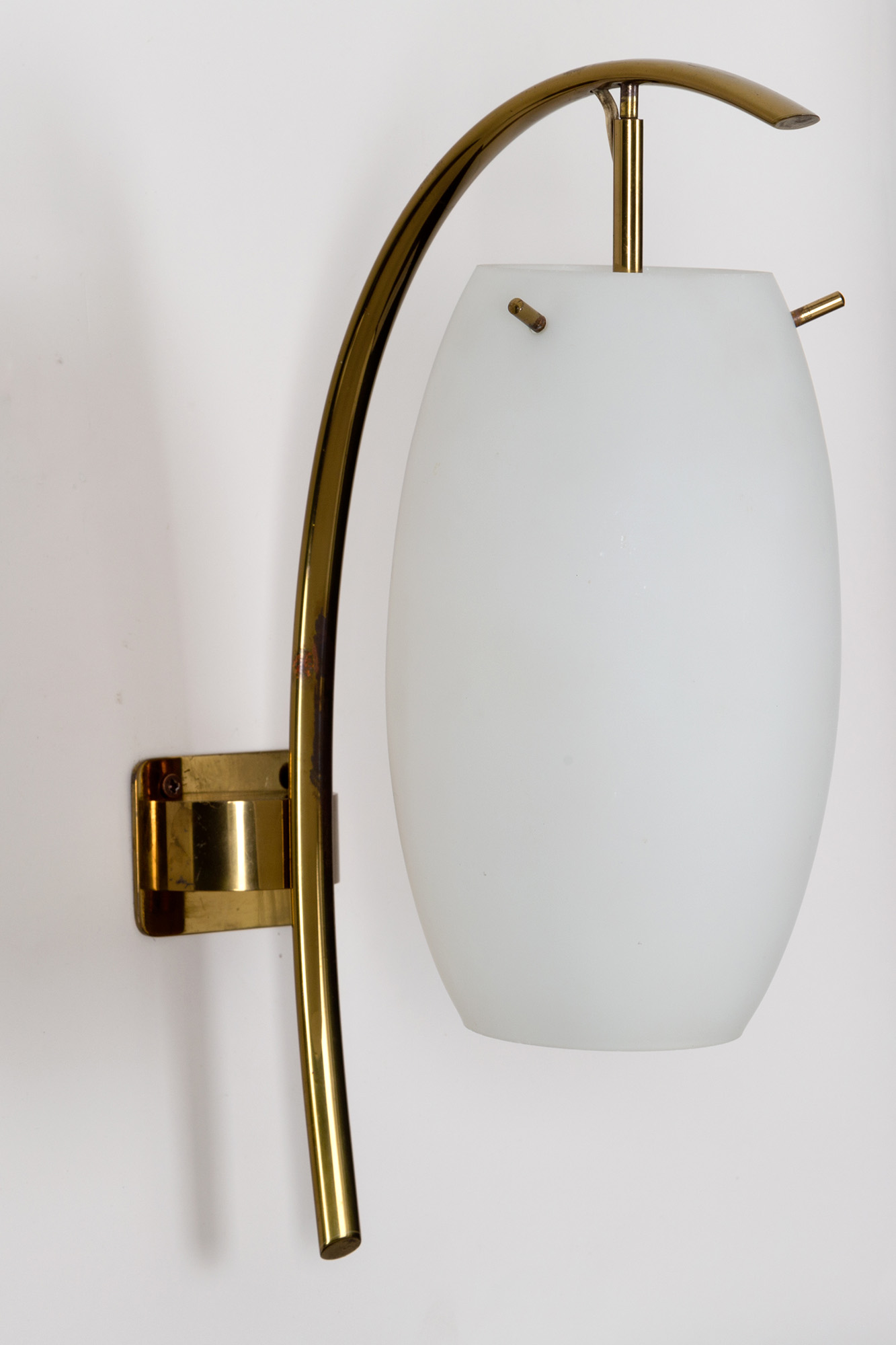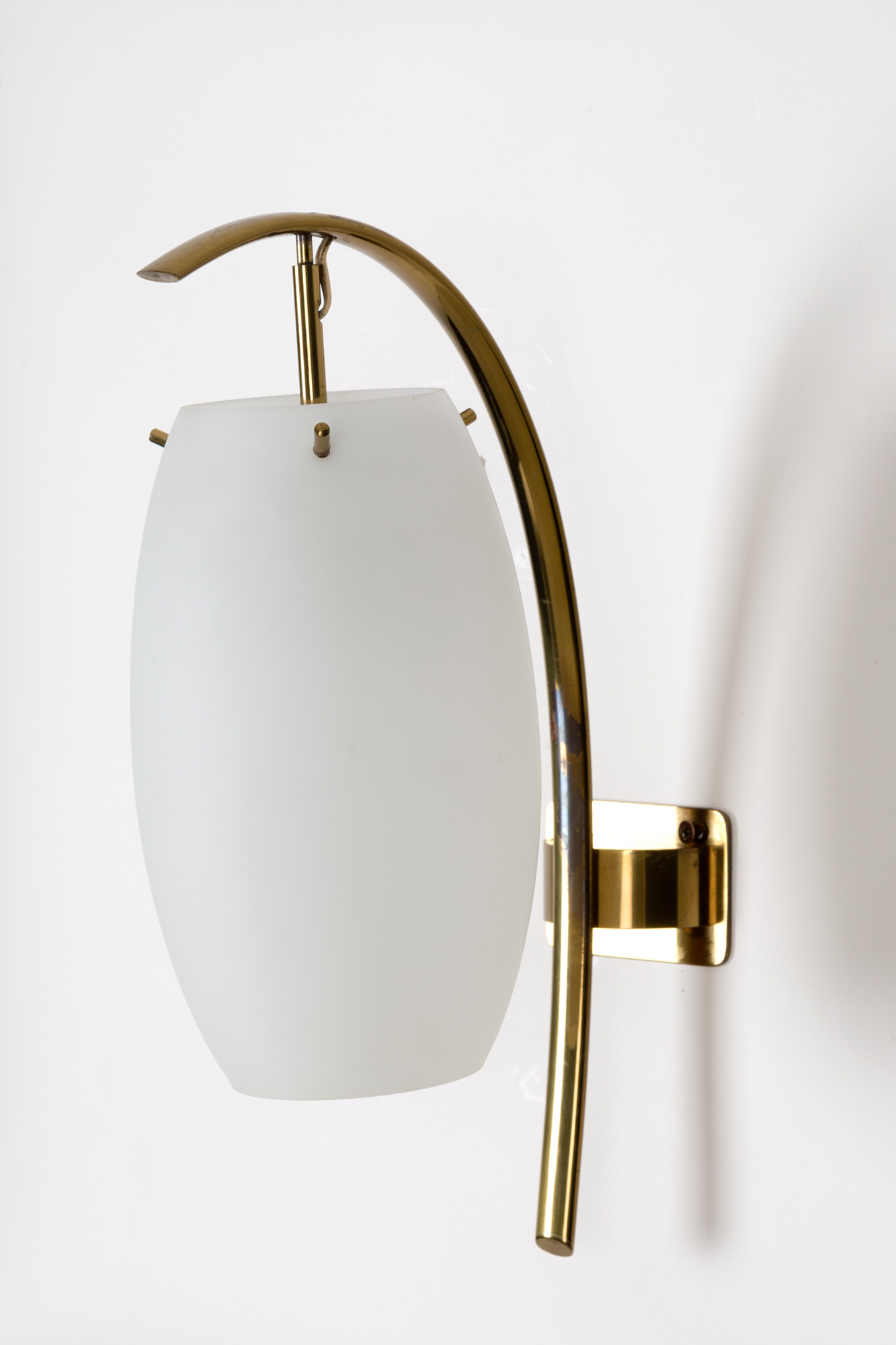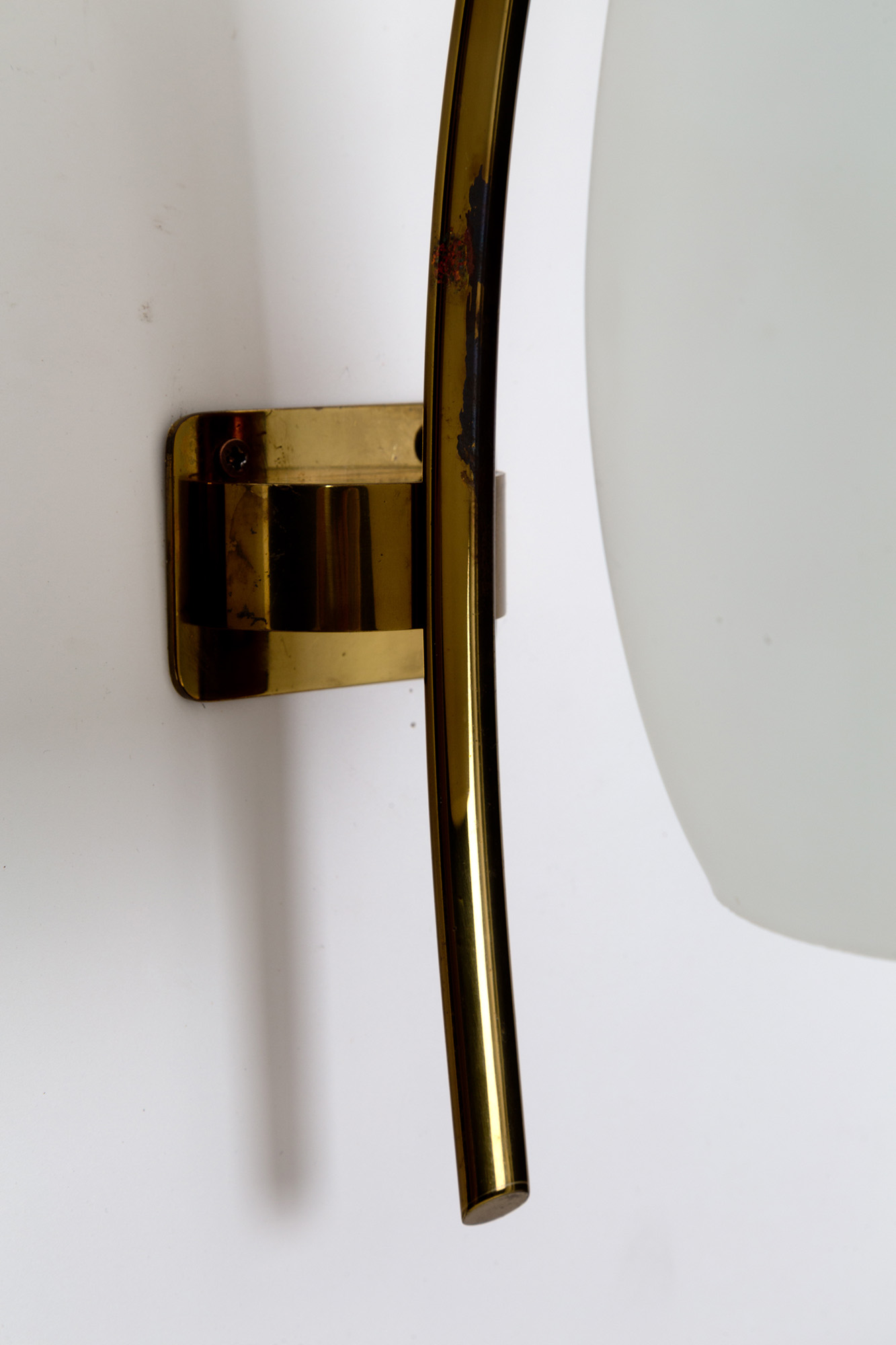 ANGELO LELII (Ancona, 1915-1987) per ARREDOLUCE. Applique in ottone lucido con diffurose in vetro duplex opalino bianco. 1956 ca. Pubblicato sul catalogo Arredoluce. Mis. Lung. cm. 12 Alt. cm. 34 Prof. cm. 25 ca.