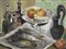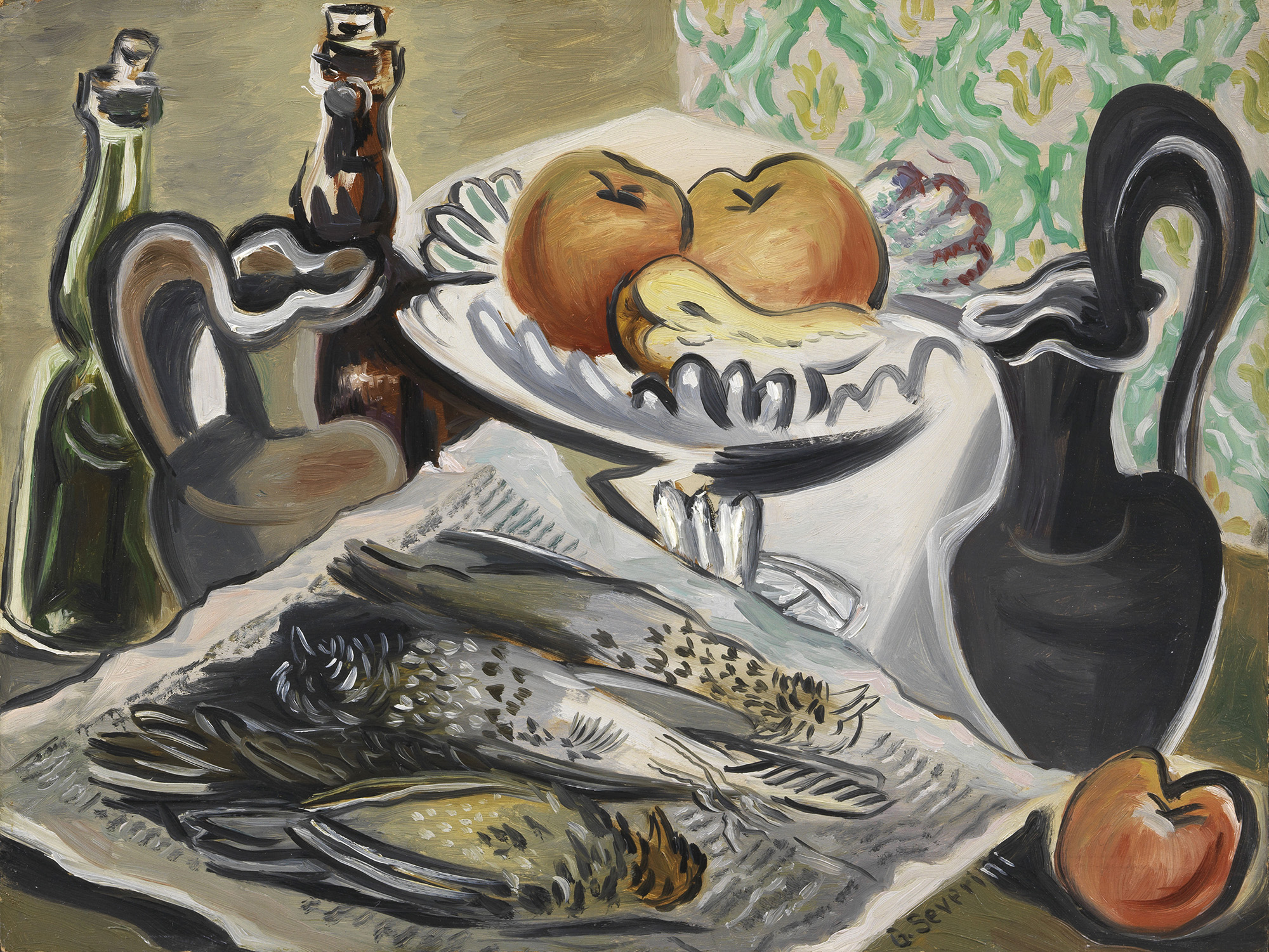 GINO SEVERINI, NATURA MORTA CON UCCELLI E FRUTTIERA CON MELE, 1942 CA.