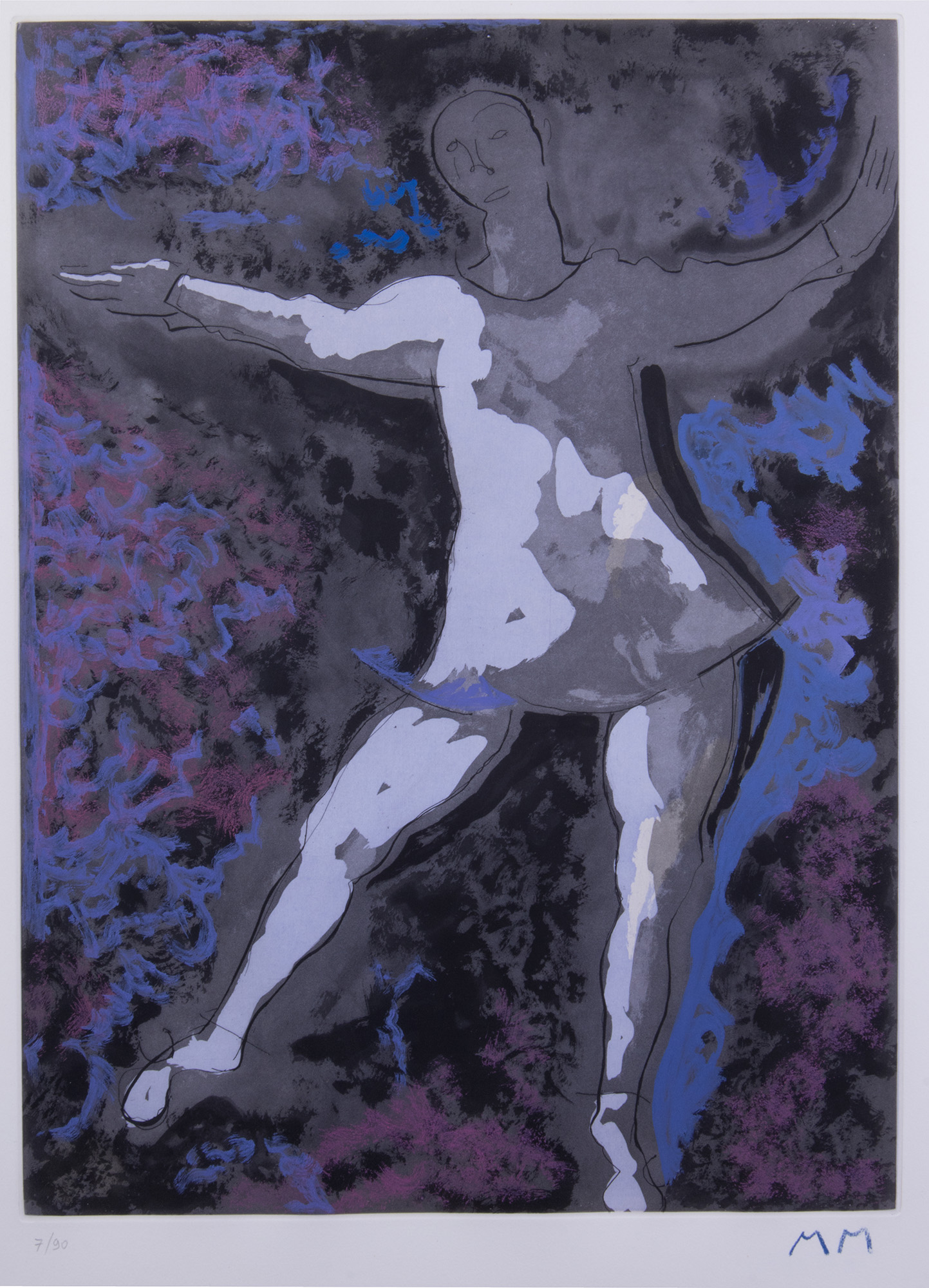 A) Dancer II, 1977, acquaforte e acquatinta a colori, es. 7/90, cm. 50x36,5 (lastra), cm. 72,5x56,5 (carta). Sigla sul margine in basso a destra: MM: timbro a secco Graphis Arte, Livorno, tiratura in basso a sinistra: 7/90. Tiratura di 90 esemplari in numeri arabi e 10 prove, editore Graphis Arte, Livorno e Toninelli Arte Moderna, Milano, 1980, stampatore Atelier Fratelli Crommelynck, Parigi;